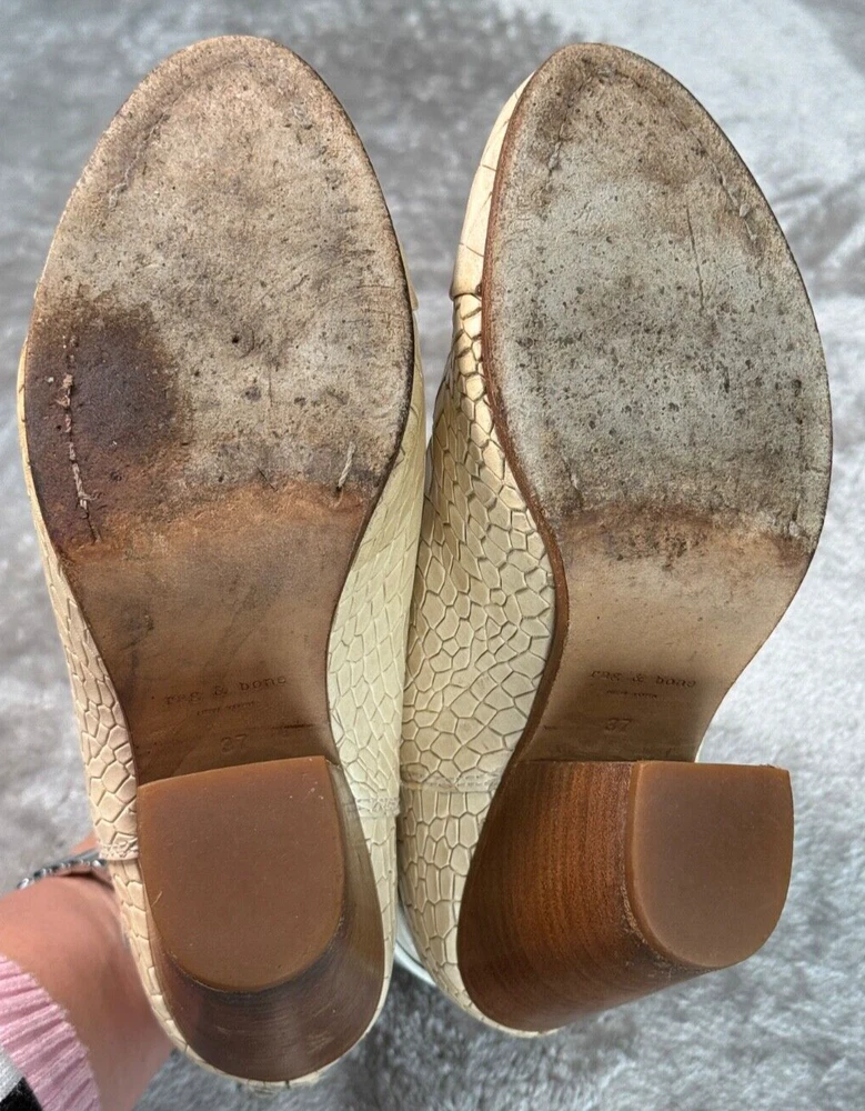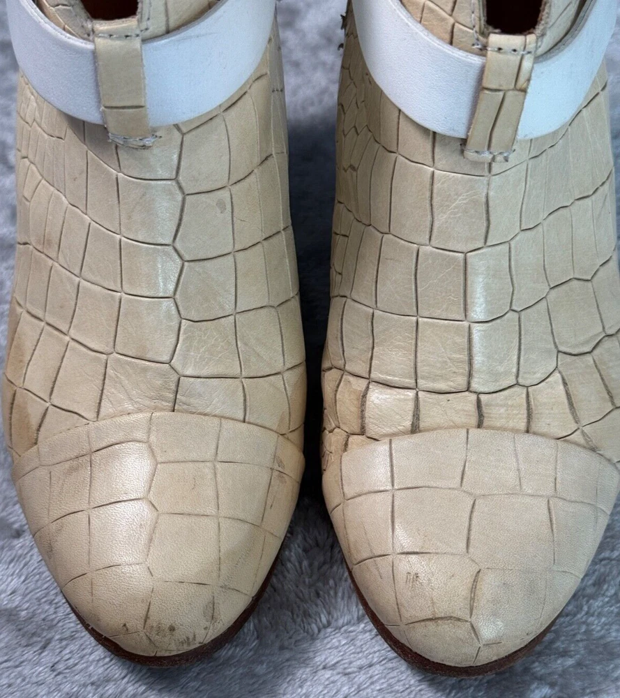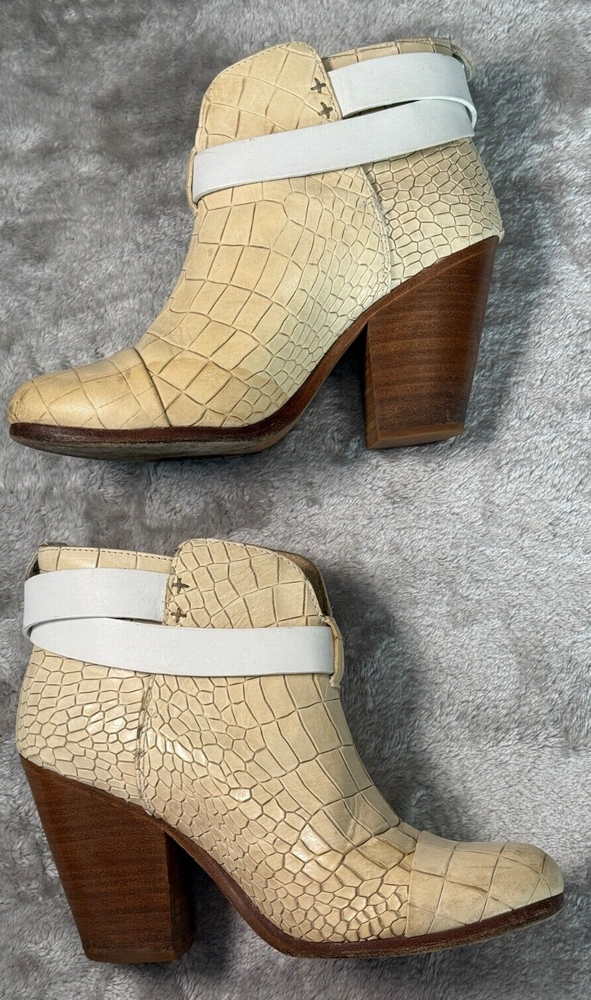 Rag & Bone Harrow Ivory White Croc Embossed Leather Cap Toe Boots Womens 7 EU 37 Good condition - see pictures for wear. Water stains across sides of both shoes as shown. All orders ship within one business day. Feel free to ask any questions before buying, we want you to be happy with your purchase. Smoke-free environment
