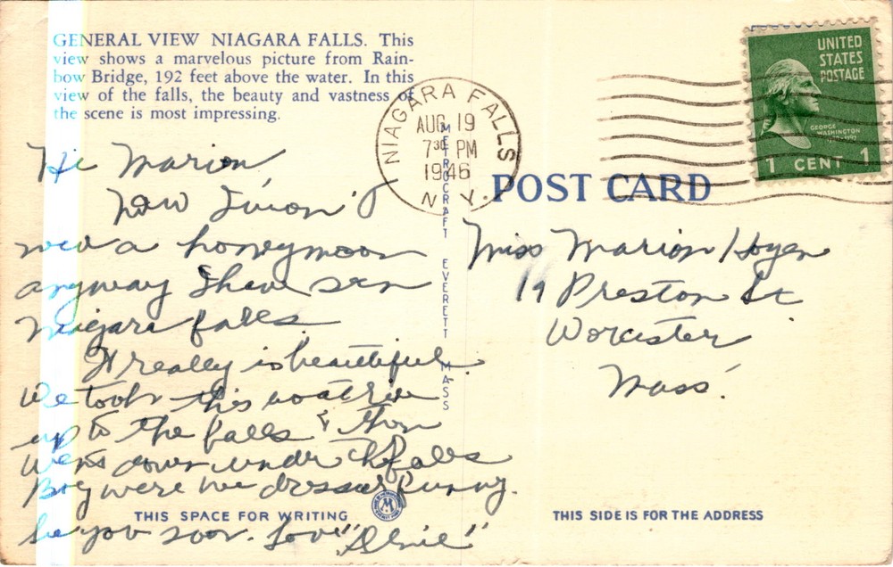 MAKE AN OFFER. THE MORE YOU BUY THE BETTER DEAL I WILL ACCEPT This postcard features a general view of Niagara Falls from Rainbow Bridge, which is 192 feet above the water. The view captures the beauty and vastness of the falls, providing an impressive scene. The postcard is dated August 19, 1946, and includes a message from someone named Marion.