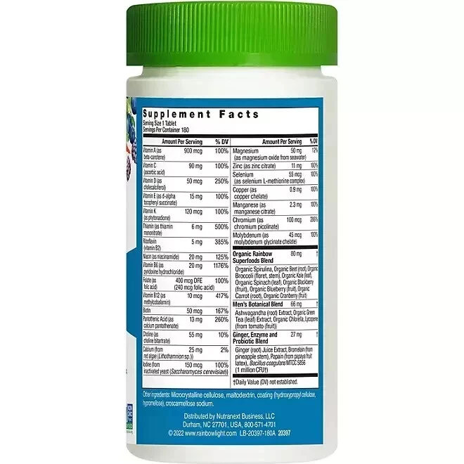 FREE SHIPPING Rainbow Light Men's One Multivitamin Tablet Plus Superfoods & Probiotics 180 ct Rainbow Light® Men’s One™ Multivitamin Plus Superfoods & Probiotics Non-GMO provides comprehensive nutritional support tailored to men’s health. This complete multivitamin for men nourishes the body with scientifically studied ingredients, a rainbow blend of organic superfoods and a unique Men's Vitality Blend to fuel vitality at the cellular level.* Each tablet contains key nutrients that support nervous system health and helps bolster immunity.* Specially formulated with potent B vitamins, probiotics and plant-sourced enzymes as well as a Men's Vitality Blend, which contains organic chlorella, organic green tea and lycopene to promote energy and vigor.* Rainbow Light® Men's One™ Multivitamin provides optimum nutrition to support a vibrant healthy lifestyle. Men's Health Multivitamin This once-daily multivitamin includes a 180-count supply and provides the essential vitamins, minerals and antioxidants to meet the nutritional needs of men. Whole Body Health Promotes full-body wellness and a vibrant healthy lifestyle with high-potency B vitamins, choline and vitamin D.*