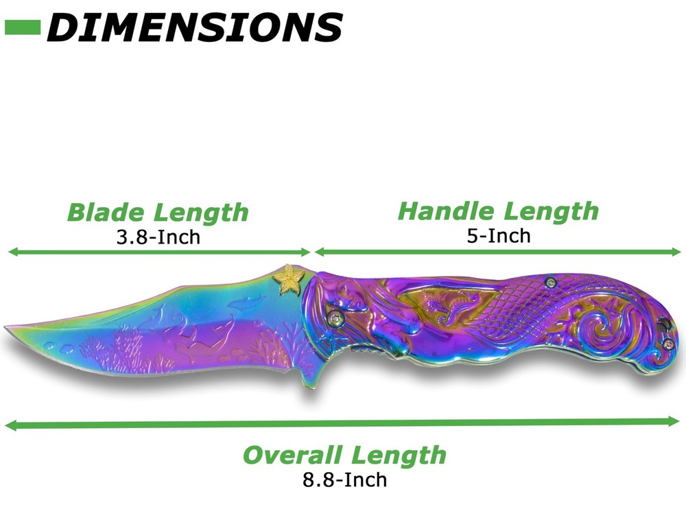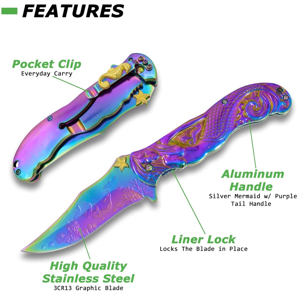 This MC-A013 series spring assisted open folding knife from offers easy handed deployment. Once open, the blade locks securely into place with the use of its liner lock. This knife features a 3.8-inch, 3mm thick rainbow stainless steel blade with acid-etched undersea art and rainbow stainless steel handle and 3D copper mermaid detail. Comes complete with a pocket clip for easy and safe carry. Measures 5 inches closed. Showing off Master Cutlery's passion for artistic knife design, the is a custom design line that features a number of collaborators, ranging from famous knife makers to new up-and-coming knife designers. Spring assist folding knife offers rapid -handed deployment, locks securely into place with liner lock 3.8-inch, 3mm thick stainless steel blade with acid-etched undersea art Rainbow stainless steel handle and 3D copper mermaid detail Pocket clip for easy and safe carry Measures 5 inches closed