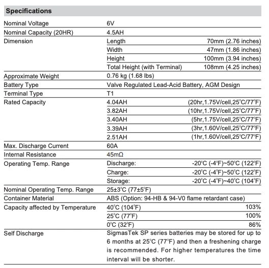 Raion Power RG0645T1 6 Volt 4.5 Amp Hour Replacement Battery Description: The Raion Power RG0645T1 6 Volt 4.5 Amp Hour Replacement Battery requires 6V 4.5AH with F1 terminal Motorcycle Replacement Battery. The replacement Raion Power RG0645T1 6 Volt 4.5 Amp Hour Replacement Battery by SigmasTek has the following characteristics: Non-spillable and leak-proof design Guaranteed optimal performance Fast Same Day Shipping Brand New and Factory Fresh Maintenance-Free - no need to fill with acid Sealed and Spillproof High Rate Discharge Design UL (Underwriters Laboratories) certified 1 Year Warranty To confirm the equivalence between your current Raion Power RG0645T1 6 Volt 4.5 Amp Hour Replacement Battery all Raion Power RG0645T1 6 Volt 4.5 Amp Hour Replacement Battery are precisely checked by our technical specialists, and we guarantee 100% compatibility. Volts: Amp Hours: Terminal: Length (in): Width (in): Height (in): Weight (Lbs): Chemistry: 6 4.5 F1 2.76 1.86 3.94 1.60 Sealed Lead Acid (AGM) Shipping, Warranty, and Return: Warranty : We, at BatteryRush, provide 1 year warranty on SLA batteries and 6 months warranty on all powersports batteries. If you experience a failure with a battery due to a manufacturer’s defect we will replace it. Please note that batteries will not be replaced if the failure is due to misuse, improper charging/storing, etc. If the received product fails to perform during that period, please contact us andwe will then provide you with a warranty claim form, which you will need to fill out and send back along with pictures of voltage meter readings. Shipping: We, the team behind BatteryRush.com , pride ourselves in the speed and efficiency in the way we do business. BatteryRush.com offers Fast Shipping of high quality batteries! BatteryRush.com ships most orders within 1 business day to the contiguous United States. We have warehouses across the whole country which shortens the delivery times. The time frame for delivery is between 2 and 5 business days. We ship every day, excluding official Holidays and weekends. We ship via the United Parcel Service (UPS) or the United States Postal Service (USPS) for smaller packages. Important Notes: We are based in the state of New York so orders shipped there will be charged Sales Tax, unless you provide us with a resale certificate or tax exemption Refunds and Return: The following return policy must be followed, to receive any sort of refund to occur: Contact us within 7 days after your purchase receipt. We have to approve your return and you will be provided with a Return Merchandise Authorization form. You need to fill out this form and send it back to us. Return your batteries with the original invoice and RMA that you received in the package. Keep in mind that all of the RMA forms we sent expire 7 business days after receipt. Restocking fee of 20% will apply for all orders that contain non-stock items or are special deals. Shipping costs are non-refundable.Once an RMA is requested, but the process is not completed BatteryRush.com reserves the rights to deem any return requests. If you did contact us within 7 days after your receipt and you did return your package during the next 14 days, we will refund your account with the amount you paid for the product. Please, note you will need to cover the shipping cost for the return. If we have made a mistake and sent you the wrong battery, we will cover the shipping cost (both ways) and will send you the right replacement for free. If batteries are delivered damaged, you must contact us within 14 days we will exchange them at no cost with brand new replacements. Just send us a picture of the damaged battery and we will ship you a brand new one. We do not grant any refund if you return your package without our approval or contact us later than this 7-day period. Please do not return merchandise to our remittance address. We accept returns only when the return policy described above is followed. Some products/orders may not be returnable due to their origin, please contact Customer Service for further details.