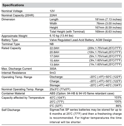Raion Power RG12220FP 12 Volt 22 Amp Hour NB Battery Replacement Description: The Raion Power RG12220FP 12 Volt 22 Amp Hour NB Replacement Battery requires 12V 22AH with NB terminal Motorcycle Replacement Battery. The replacement Raion Power RG12220FP 12 Volt 22 Amp Hour NB Replacement Battery by SigmasTek has the following characteristics: Non-spillable and leak-proof design Guaranteed optimal performance Fast Same Day Shipping Brand New and Factory Fresh Maintenance-Free - no need to fill with acid Sealed and Spillproof High Rate Discharge Design UL (Underwriters Laboratories) certified 1 Year Warranty To confirm the equivalence between your current Raion Power RG12220FP 12 Volt 22 Amp Hour NB Replacement Battery all Raion Power RG12220FP 12 Volt 22 Amp Hour NB Replacement Battery are precisely checked by our technical specialists, and we guarantee 100% compatibility. Volts: Amp Hours: Terminal: Length (in): Width (in): Height (in): Weight (Lbs): Chemistry: 12 22 NB 7.13 3.00 6.59 13.50 Sealed Lead Acid (AGM) Shipping, Warranty, and Return: Warranty : We, at BatteryRush, provide 1 year warranty on SLA batteries and 6 months warranty on all powersports batteries. If you experience a failure with a battery due to a manufacturer’s defect we will replace it. Please note that batteries will not be replaced if the failure is due to misuse, improper charging/storing, etc. If the received product fails to perform during that period, please contact us andwe will then provide you with a warranty claim form, which you will need to fill out and send back along with pictures of voltage meter readings. Shipping: We, the team behind BatteryRush.com , pride ourselves in the speed and efficiency in the way we do business. BatteryRush.com offers Fast Shipping of high quality batteries! BatteryRush.com ships most orders within 1 business day to the contiguous United States. We have warehouses across the whole country which shortens the delivery times. The time frame for delivery is between 2 and 5 business days. We ship every day, excluding official Holidays and weekends. We ship via the United Parcel Service (UPS) or the United States Postal Service (USPS) for smaller packages. Important Notes: We are based in the state of New York so orders shipped there will be charged Sales Tax, unless you provide us with a resale certificate or tax exemption Refunds and Return: The following return policy must be followed, to receive any sort of refund to occur: Contact us within 7 days after your purchase receipt. We have to approve your return and you will be provided with a Return Merchandise Authorization form. You need to fill out this form and send it back to us. Return your batteries with the original invoice and RMA that you received in the package. Keep in mind that all of the RMA forms we sent expire 7 business days after receipt. Restocking fee of 20% will apply for all orders that contain non-stock items or are special deals. Shipping costs are non-refundable.Once an RMA is requested, but the process is not completed BatteryRush.com reserves the rights to deem any return requests. If you did contact us within 7 days after your receipt and you did return your package during the next 14 days, we will refund your account with the amount you paid for the product. Please, note you will need to cover the shipping cost for the return. If we have made a mistake and sent you the wrong battery, we will cover the shipping cost (both ways) and will send you the right replacement for free. If batteries are delivered damaged, you must contact us within 14 days we will exchange them at no cost with brand new replacements. Just send us a picture of the damaged battery and we will ship you a brand new one. We do not grant any refund if you return your package without our approval or contact us later than this 7-day period. Please do not return merchandise to our remittance address. We accept returns only when the return policy described above is followed. Some products/orders may not be returnable due to their origin, please contact Customer Service for further details.