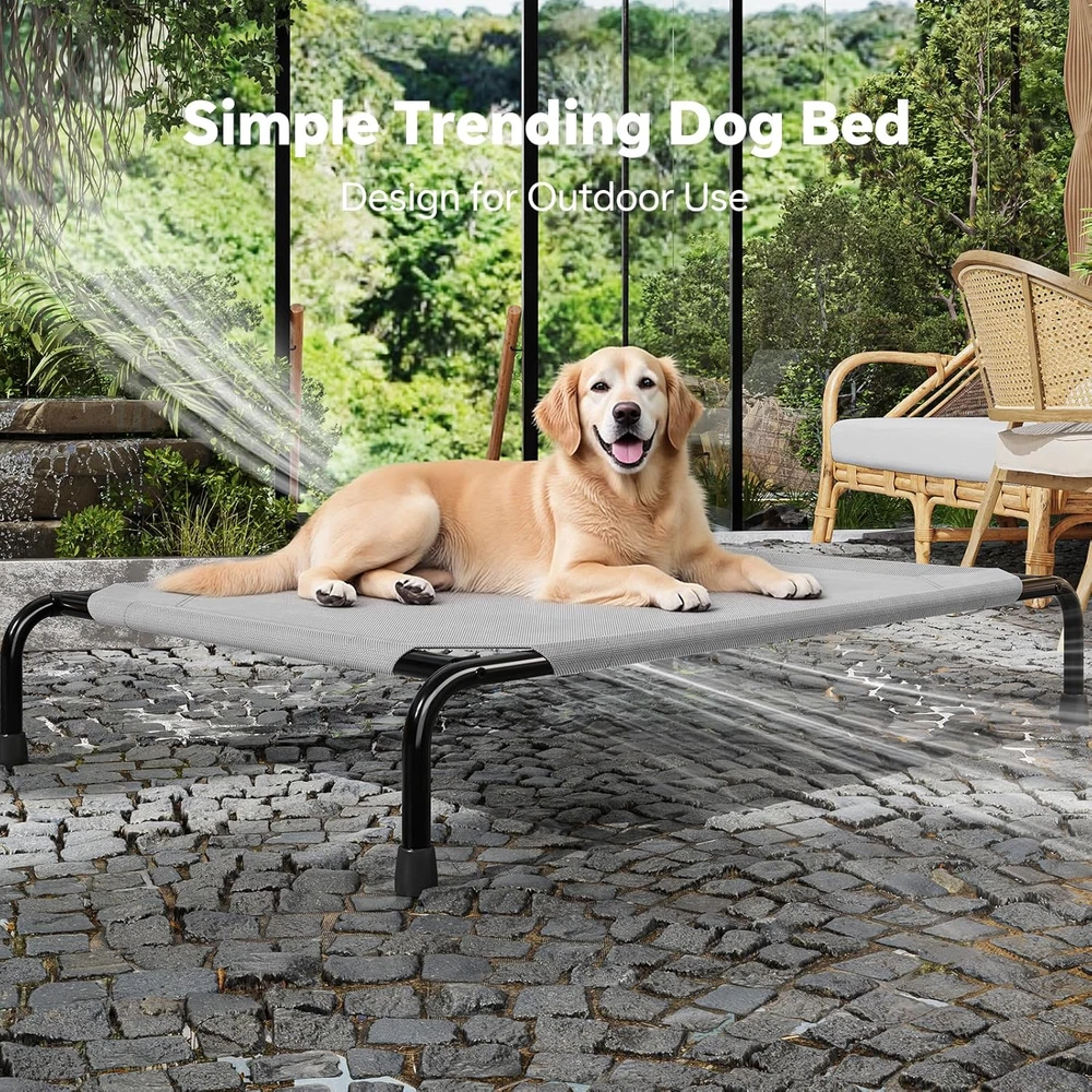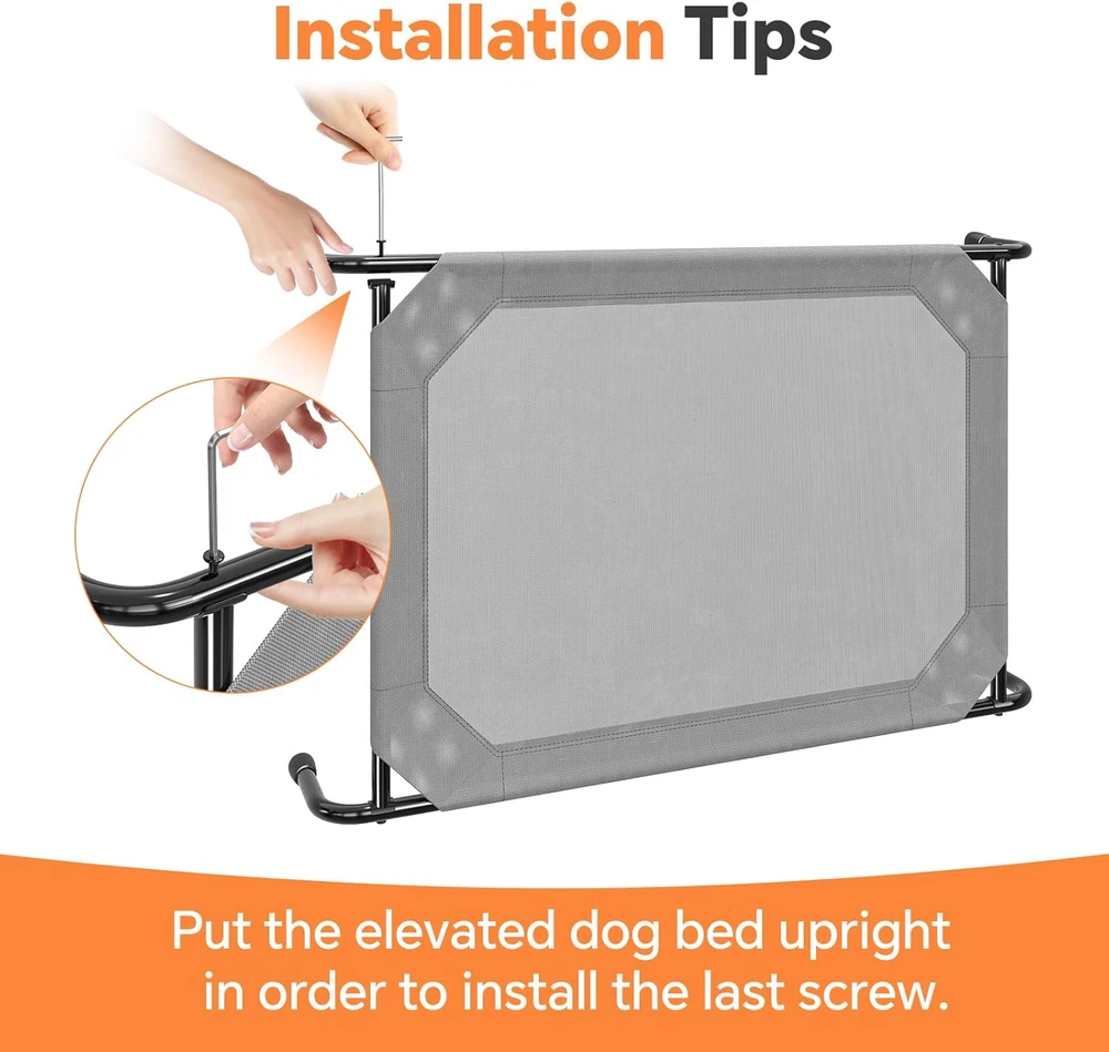 【Product Dimensions】47.75"L x 30.5"W x 8"Th. Raised dog bed designed for medium and large dog breeds, like a Poodle, Husky, German Shepherds, Golden Retrievers, Akitas and more. 【Strong & Durable】Constructed with upgraded 1-inch diameter tubing, this dog cot bed supports up to 200 pounds. To ensure sturdiness and longevity, assembly requires physical support and is best performed by two adults. 【Cooling Comfort】The elevated dog bed promotes airflow, keeping your dog dry and cool in all seasons. The 8-inch height perfectly accommodates dogs of all ages, from puppies to seniors. Suitable for indoor or outdoor use. 【Easy Care】 This cooling dog bed is easy to clean. Clean the mesh with tap water, a hose or a damp towel. For a deep clean, use a mild soap or natural all-surface cleaner and rinse thoroughly. 【Installation Tips & Support】(1) Placing the product on its side in assembly step 4 can be more convenient. (2) We provide detailed instructions and installation videos. Contact us if you have any questions. Product description Dog Bed Collection Add to Cart Add to Cart Add to Cart Add to Cart Add to Cart Customer Reviews 4.4 out of 5 stars 830 4.5 out of 5 stars 213 4.5 out of 5 stars 213 4.5 out of 5 stars 213 4.5 out of 5 stars 213 4.5 out of 5 stars 213 4.5 out of 5 stars 213 Price $27.99 $ 27 . 99 — $35.99 $ 35 . 99 $35.99 $ 35 . 99 — $53.99 $ 53 . 99 $27.99 $ 27 . 99 Color Grey Dark Grey Brown Green Blue Black Black Size 47.75"L x 30.5"W x 8"Th 47.75"L x 30.5"W x 8"Th 47.75"L x 30.5"W x 8"Th 47.75"L x 30.5"W x 8"Th 47.75"L x 30.5"W x 8"Th 60.25"L x 37.25"W x 8"Th 36.5"L x 22.5"W x 8.25"Th Material Teslin Mesh, Metal Teslin Mesh, Metal Teslin Mesh, Metal Teslin Mesh, Metal Teslin Mesh, Metal Teslin Mesh, Metal Teslin Mesh, Metal Waterproof ✔ ✔ ✔ ✔ ✔ ✔ ✔ Easy to Clean ✔ ✔ ✔ ✔ ✔ ✔ ✔