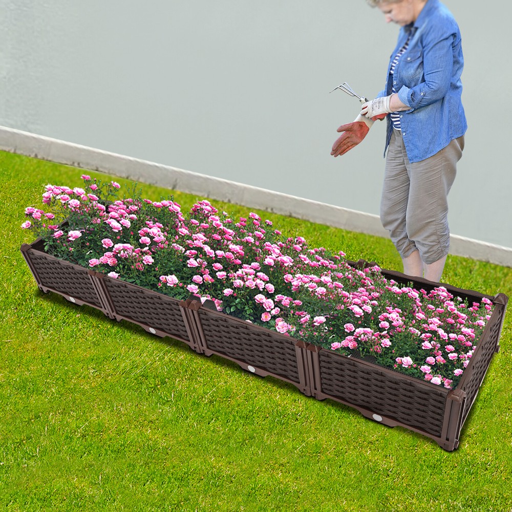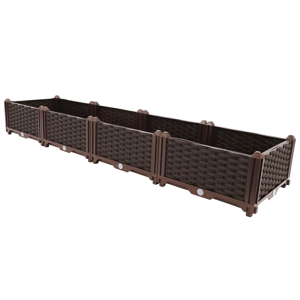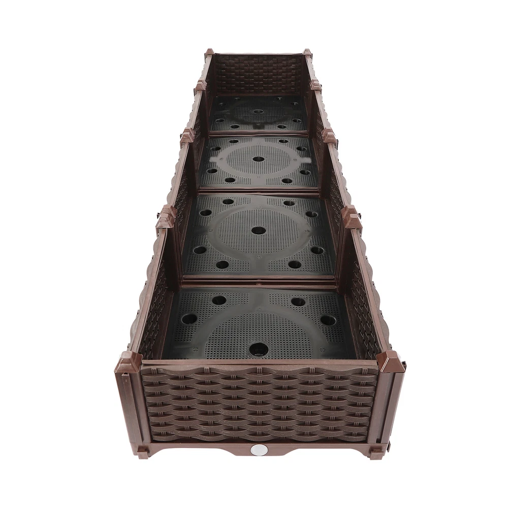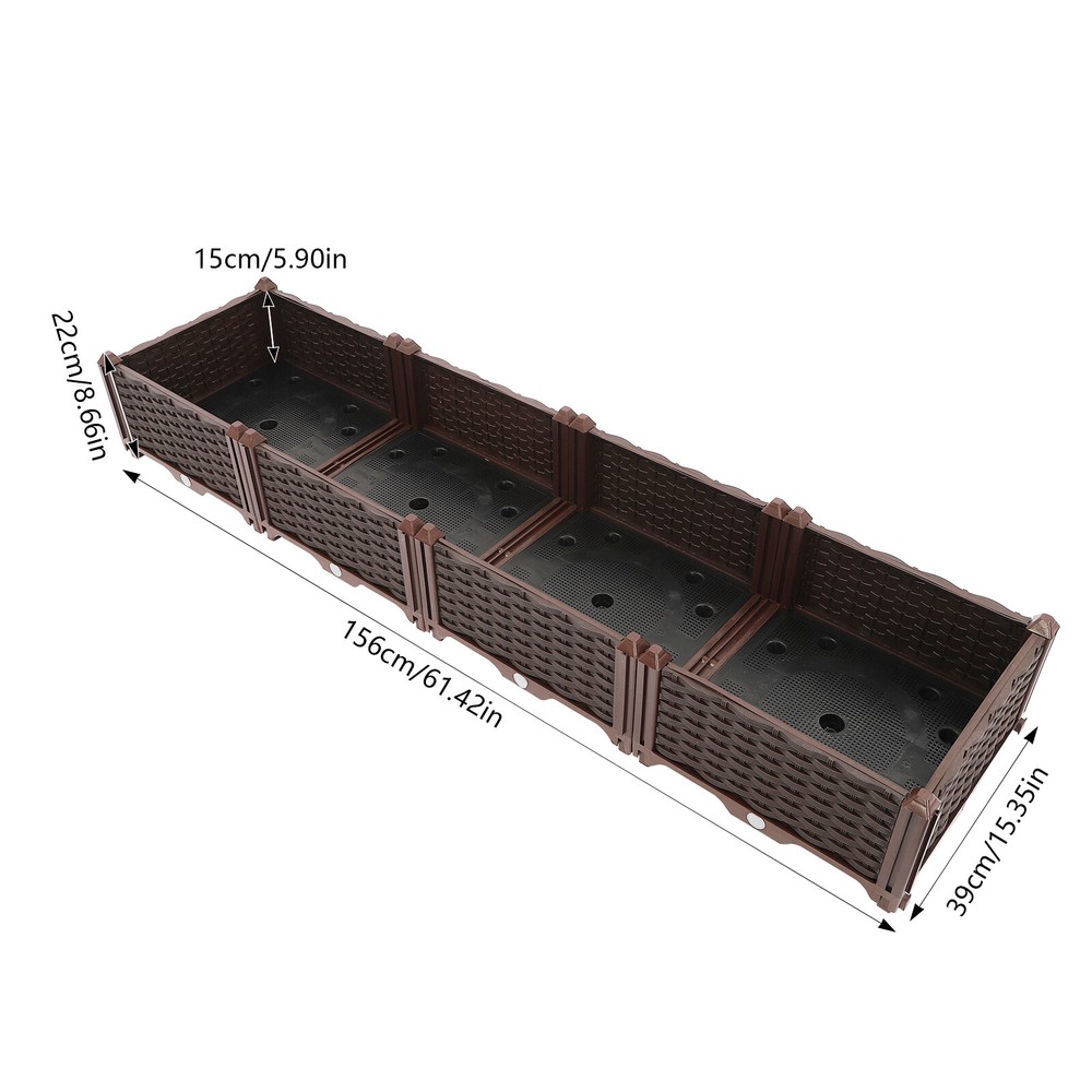 Specifications Color: Deep Brown Material: Plastic Process: Injection Molding Mount Type: Free Standing Assembly Required: Yes Product Size: 156*39*22cm/61.42*15.35*8.66inch Inner Depth: 15cm/5.9in Packaging Size: 41*41*25cm/16.14*16.14*9.84inch Gross Weight: 7kg/15.43lbs Package Included 1* Raised Garden Bed Box 1* English Distribution List Raised Garden Bed Box, Large Plastic Planter Box Garden&Yard 156*39*22cm Brown Description Give your green plants and flowers a sturdy and warm home! This delicate raised garden bed box with high-quality material, large size, excellent ventilation, and scientific structure allows you to raise your plants with ease. Besides, its natural and stylish outlook makes it an excellent complement to your garden or home. Key Features Build to Last: The premium plastic with an injection mold process is rust-resistant , abrasion-resistant , and sturdy, giving the product a long service life. Large Size: The large size(61.42*15.35*8.66 inches) and inner height(about 5.9 inches) can meet your large demands of planting various crops, flowers, or other plants and give you a large room to grow vines or tomatoes. Stable Structure: The sturdy columns and reinforced strips link the parts more tightly and enhance the structural strength of the product, allowing the product to carry more weight and have better stability without falling apart. Good-looking Appearance: The rattan texture panel looks natural and beautiful, adding a cozy and natural sight to your room or garden. Plants Home: The thickened panel protects plants from cold winds and excessive light, and the holes in the panels provide good ventilation to ensure their smooth breathing, making them grow in a comfortable and healthy environment. Scientific Structure Design: The bottom panel separates the water and the soil, allowing the product to gather excess water at the bottom, avoiding flooding while still providing a long-term water supply to the soil as well as the plants. User-friendly Design: The translucent water plugs at the bottom allow you to see the water level and easily drain excess water to avoid harboring bacteria that may affect the growth of your plants. Simple Installation: With complete accessories and a simple structure, you can easily install the product and start to use it. Ideal Gift: With a classic appearance and practical functions, this product is an ideal gift for colleagues, friends, or family members who like to grow flowers, crops, or other plants. Details Connecting Tubes: They can connect panels, allowing excess water to be fully utilized and avoiding excessive water waste. Waterproof Strips: The strips fit snugly into the product's seams, preventing soil or water from leaking out during watering. Application It is suitable for placing on balconies, decks, gardens, backyards, patios, porches, decks, patios, etc. to grow flowers, vegetables, most squash or phi vines such as tomatoes, peppers, squash and cucumbers. Installation Steps: Align the two bottom panels and connect one side to complete the docking. Snap the two panels together. Remove the spacer plate on the bottom plate and install the water pass-through parts so that the water from the two panels can be interconnected. Insert the side panels into the bottom panels' grooves and push them in a clockwise direction. Install the columns and reinforcement strips. Install the waterproof strips(they are also required on the inside) and cover, then the installation is completed! Specifications Color: Deep Brown Material: Plastic Process: Injection Molding Mount Type: Free Standing Assembly Required: Yes Product Size: 156*39*22cm/61.42*15.35*8.66inch Inner Depth: 15cm/5.9in Packaging Size: 41*41*25cm/16.14*16.14*9.84inch Gross Weight: 7kg/15.43lbs Package Included 1* Raised Garden Bed Box 1* English Distribution List Other Needed Accessories Notes Please check the size carefully before ordering. Please allow the slight color difference caused by the shooting light and 1-3cm error due to manual measurement, and make sure you do not mind before you order. Payment Delivery details Terms of sales About us Contact us Payment We accept ebay payment 。 Fees such as import duties, taxes are not included in the item price or shipping costs. These charges are the buyer's responsibility. Delivery details Shipping: 2-9 working days to: USA Terms of sales We maintain high standards of excellence and strive for hundred percent customer satisfaction. Feedback is very important to us. We hope that you contact us immediately before you give neutral or negative feedback, so that we can address your concerns. It is impossible to address issues if we do not know about them! About us Your satis faction is our ultimate goal. We work hard to earn your trust and future business. Our certified technicians have tested each item before shipping. The unit comes with 1 year limited warranty on all manufacturing defects. a) If you receive a defective item, you may return it or ask for a discount. Please contact us within 14 days after you receive the package. b) What you returned must be intact and in its original packaging as re? u. Customer is responsible for shipping costs of the returned item. c) We will cover the cost of shipping back t with the shipping rate indicated in the registration page. We will send you a new unit or refund the full payment you paid. Thank you. Contact us Business Hour Business Hour: Monday To Friday: 8:30 AM to 5:00 PM (Beijing China time) Due to time zones, our reply to your questions may not be immediately. But within above working time, we will reply your email within 24 hours. If it's non-workdays, please kindly be patient and wait till Monday. Please contact us with ebay message. Please feel free to contact us if you have any questions. Monday To Friday: 8:30 AM to 5:00 PM (Beijing China time) Due to time zones, our reply to your questions may not be immediately. But within above working time, we will reply your email within