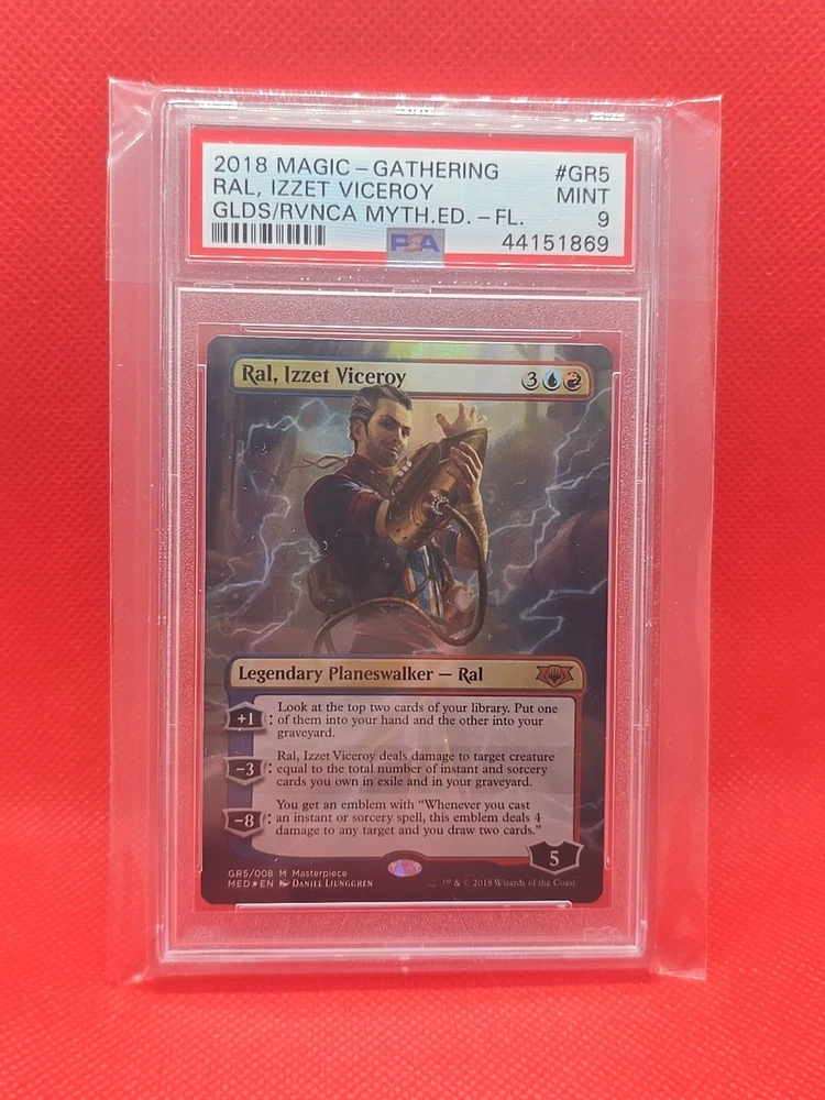 Elevate your Magic: The Gathering collection with the Mythic Edition: Guilds of Ravnica foil card of Ral, Izzet Viceroy. This sought-after planeswalker card boasts a stunning foil finish that catches the light, making it a standout addition to any deck or display. The card showcases the brilliant work of Daniel Ljunggren, whose illustration captures the essence of Ral's fiery prowess. With its blue and red color identity, Ral, Izzet Viceroy opens up strategic options for players looking to leverage its unique abilities. The card is produced by Wizards of the Coast, ensuring authentic quality and gameplay experience. Its rarity and the card's meticulous grading by PSA with a 9 rating make it a valuable find for collectors and enthusiasts alike.