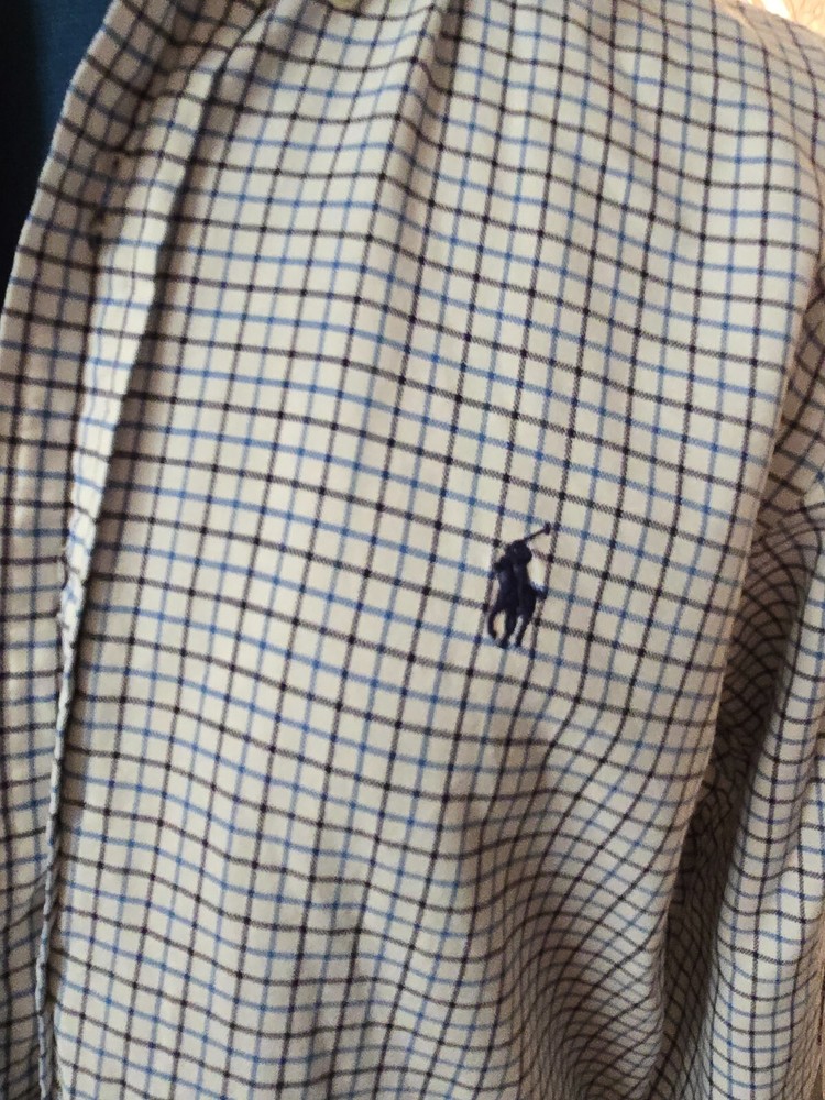 POLO RALPH LAUREN L/S COTTON SHIRT IN WHITE/BLUE/BLACK CHECK EMBROIDERED PONY CHEST MOTIF SIZE SMALL CUSTOM FIT PIT-PIT 20"