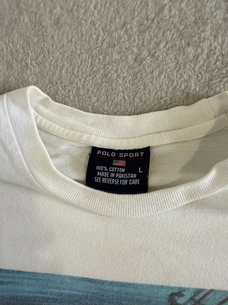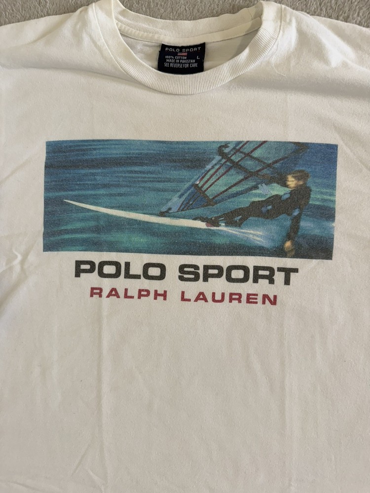The product is a vintage-inspired Ralph Lauren Polo Sport T-Shirt in size Large, featuring a retro 90s surf theme in blue color. Designed for men with a regular fit, this classic tee is perfect for casual wear with a touch of nostalgic flair. Made with quality materials and the iconic Polo Ralph Lauren brand, this t-shirt offers both style and comfort for any wardrobe.