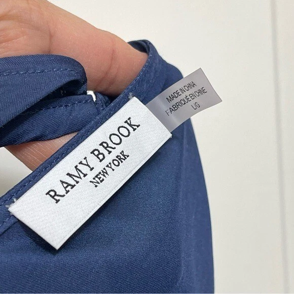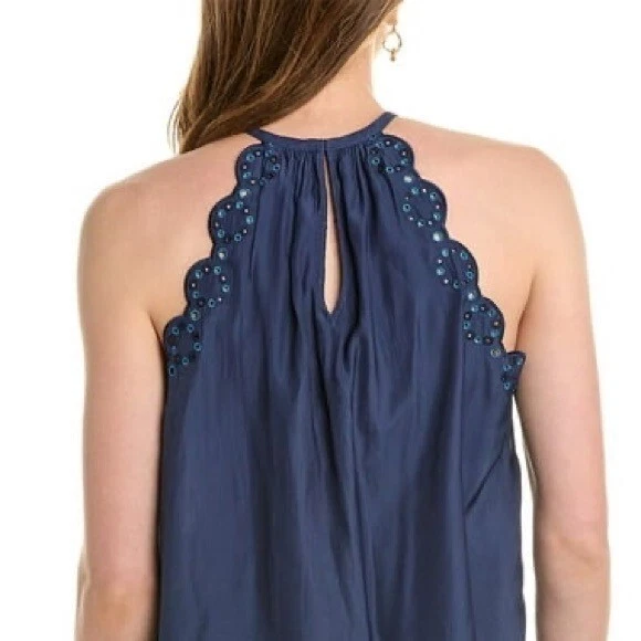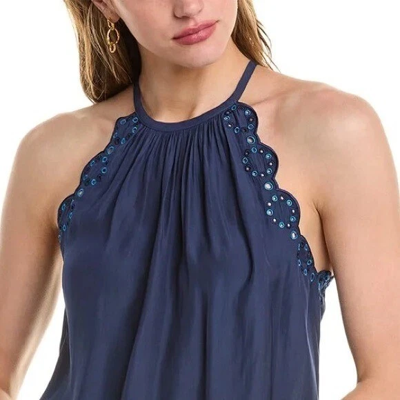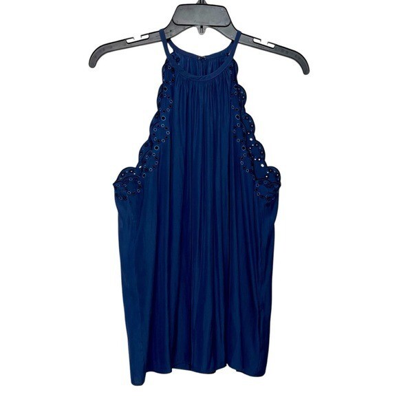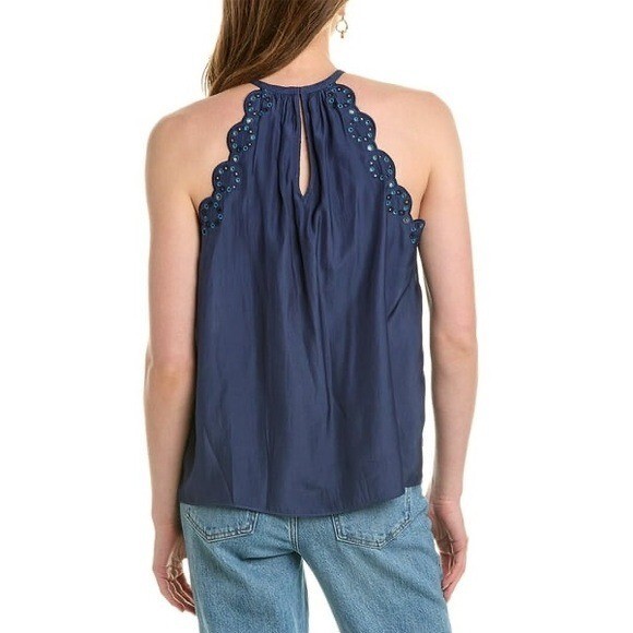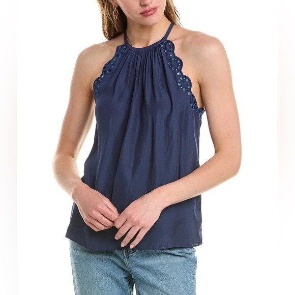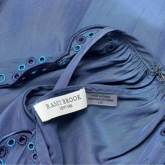 Excellent Preowned Condition . Introducing the Ramy Brook Calla Top, a stylish addition to your wardrobe from the renowned brand Ramy Brook. This elegant top features a beautiful Spring Navy color with scallop eyelet trim, perfect for adding a touch of sophistication to your look. Made with high-quality 100% polyester, this top is both luxurious and comfortable to wear. The hook-and-eye closure adds a chic finishing touch. Pair it with your favorite bottoms for a fashion-forward outfit. Hand wash recommended. Imported. Model is 5'10' and is wearing a size small. 0112