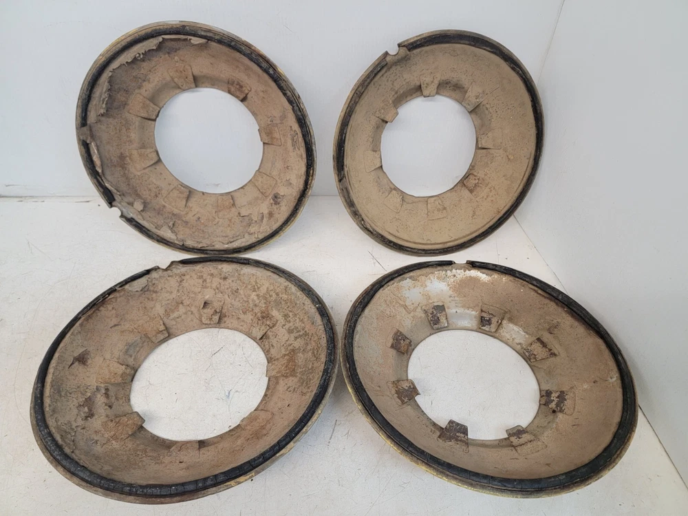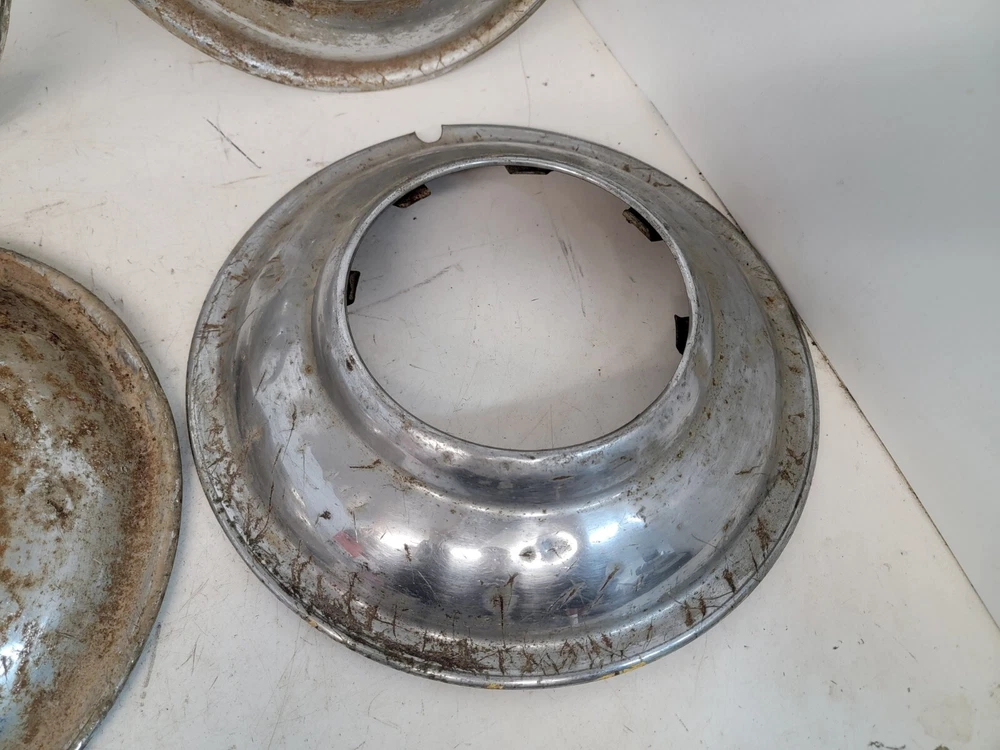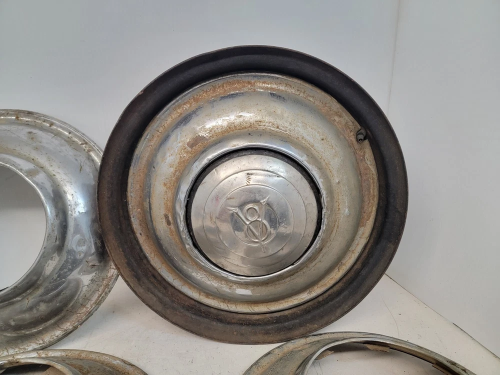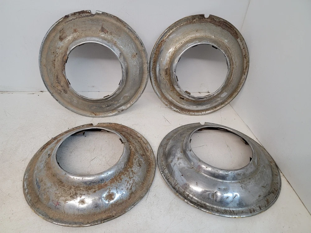 Hello, this listing is for a rare set of (4) vintage wire wheel cover discs that fit on a 1935 Ford 16-inch wheel like shown. The wheel in the pictures is not included, it is only shown so you can see how they fit. They are beat up and have peeling chrome. They would look great on a survivor hot rod as they sit, or go ahead and restore them for your show car. I'm not positive if these were made by Lyon. There is a partial manufacturer stamp on the one of them as-shown. Please ask any questions first, thank you.