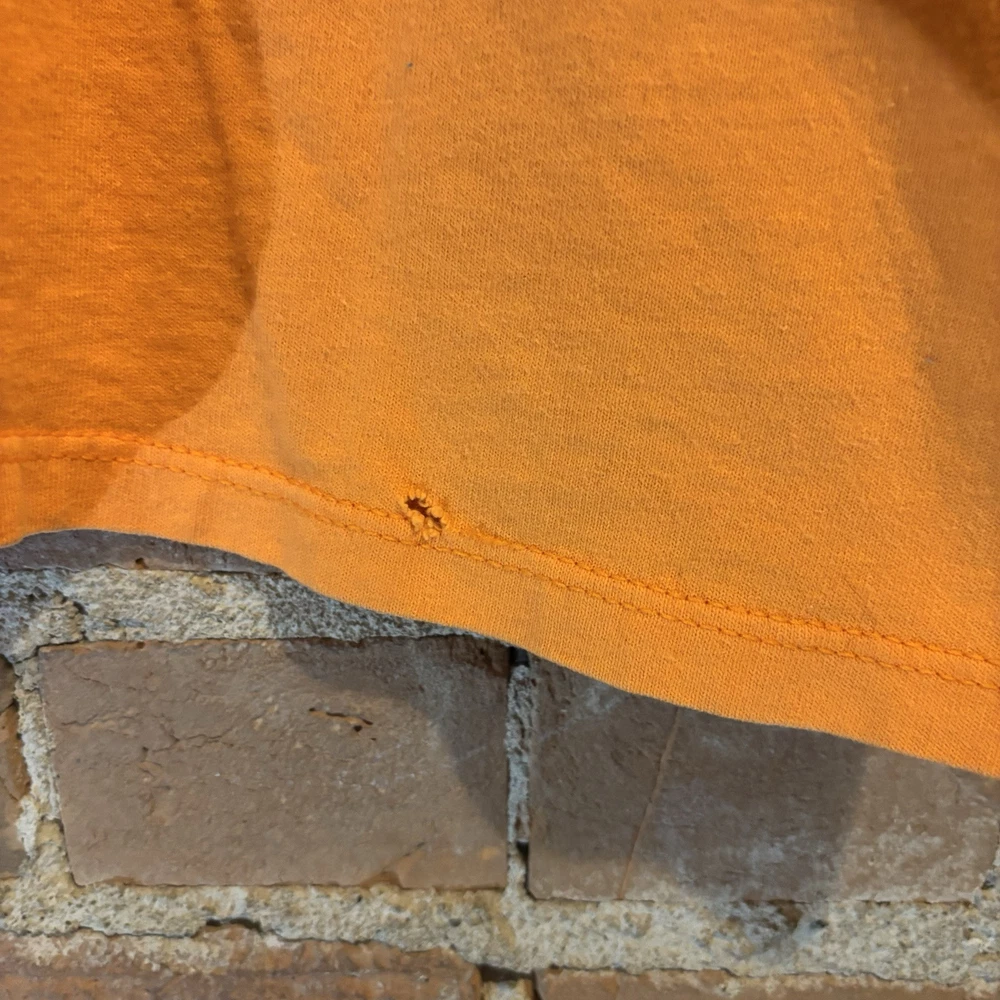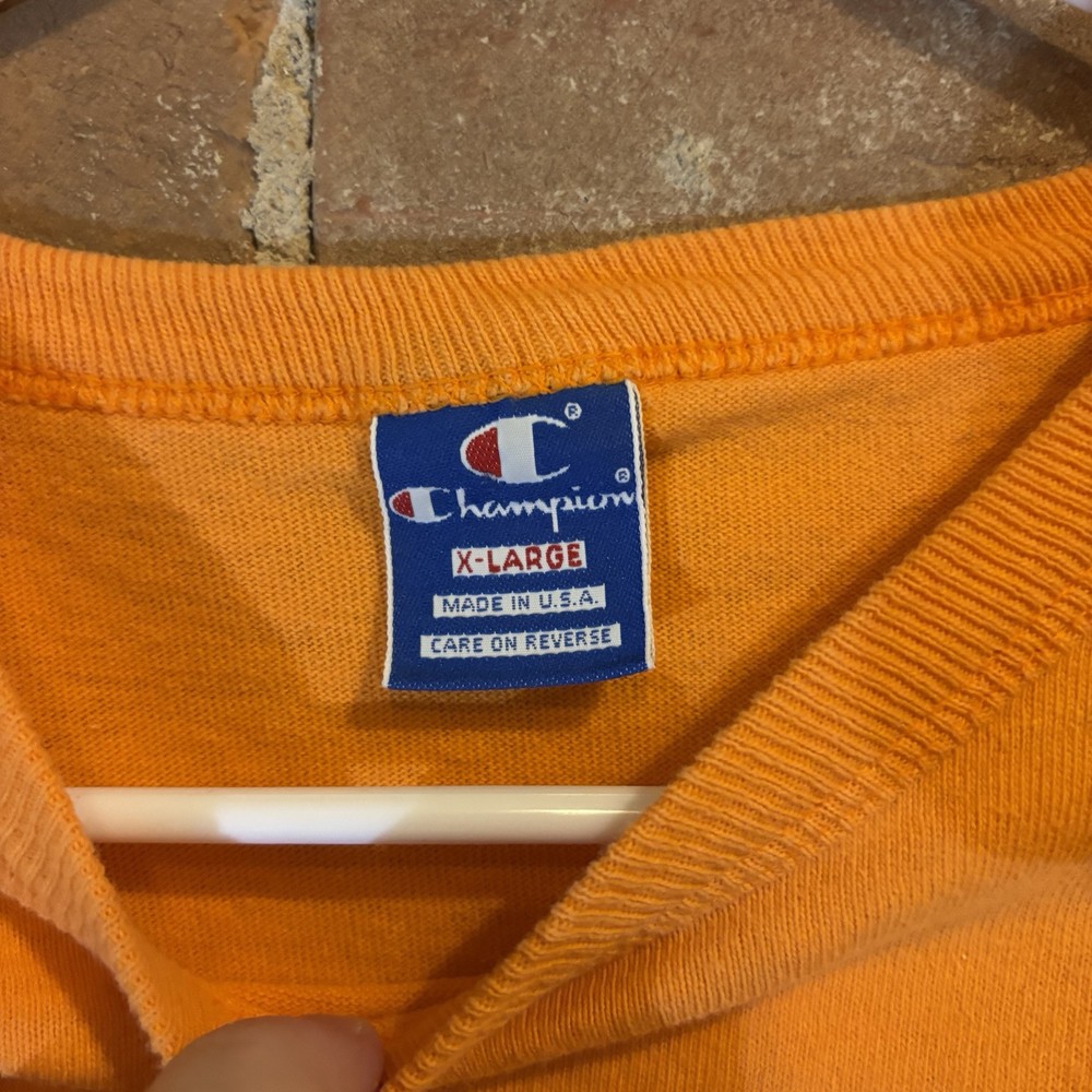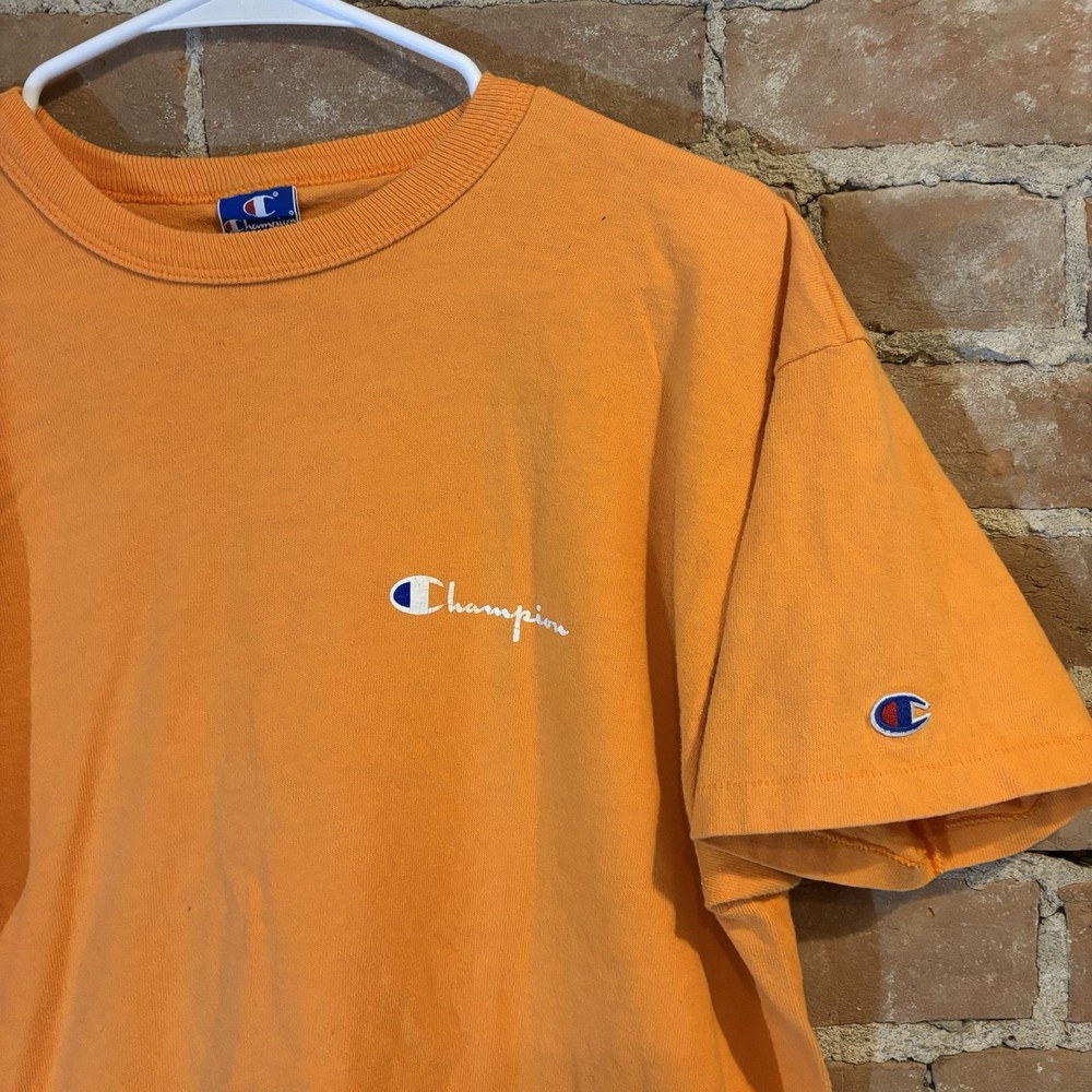 $50 Vintage 90s Champion Tshirt Size: xl Condition: small hole shown in pictures Embrace the nostalgia of the '90s with this vibrant orange Champion T-shirt. A true vintage piece from the 1990-1999 era, it offers a blast of retro style with its classic crew neck and short sleeves. Made with comfortable cotton material, this regular fit XL tee is a perfect addition to any casual wardrobe. The shirt features a timeless solid pattern with the iconic Champion logo accent, adding a touch of sporty elegance. Proudly made in the United States, this T-shirt is machine washable for easy care. Whether you're out for a laid-back day or just looking to rock some vintage flair, this Champion tee has got you covered.