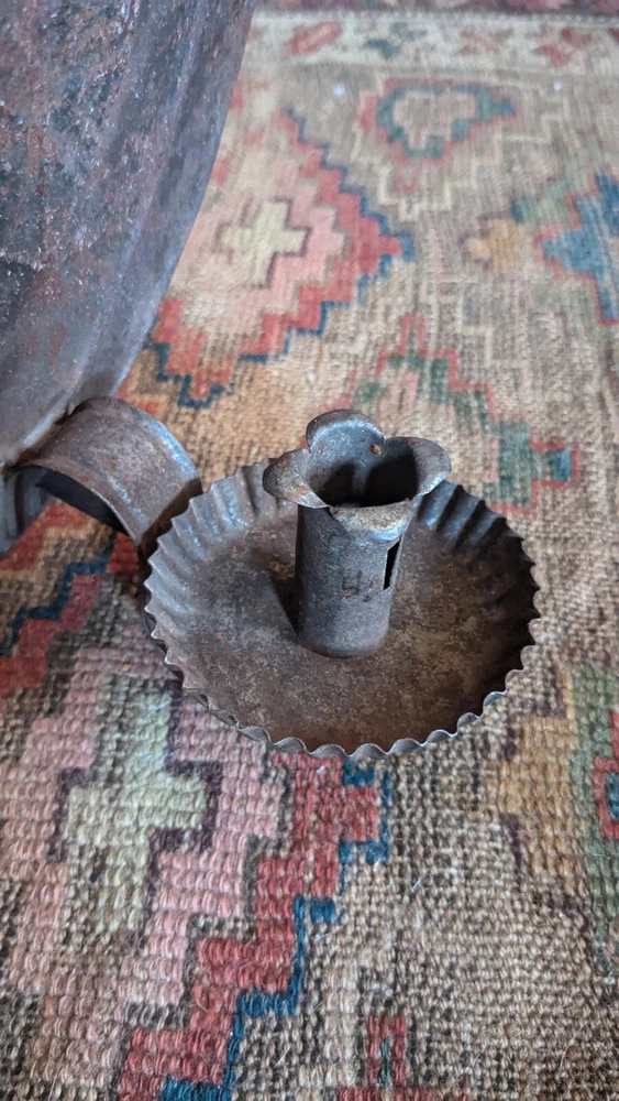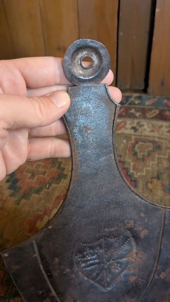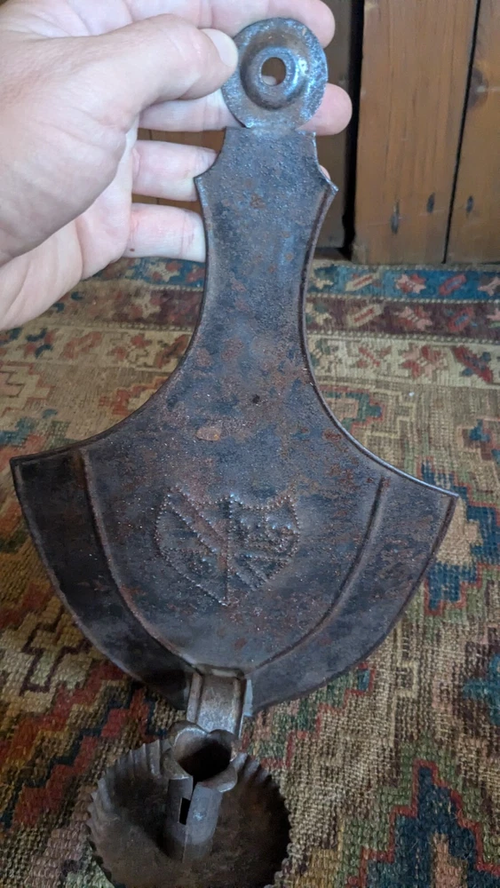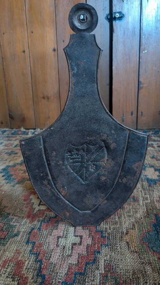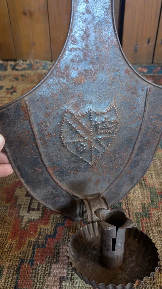 Offering this antique metal tin punched sconce Candleholder. Measures 14.5 x 8 x 5.75". This sconce has a dark patina and rustic surface. Has a shield style form and punch. Almost like a Hallmark look. Has a cleated bottom. Holder has a great form, leans some as seen. Expect minor sauter loss and a hard to find punch pattern and sweet piece. Thanks for looking.