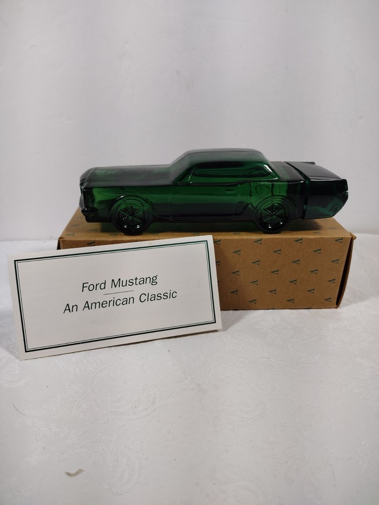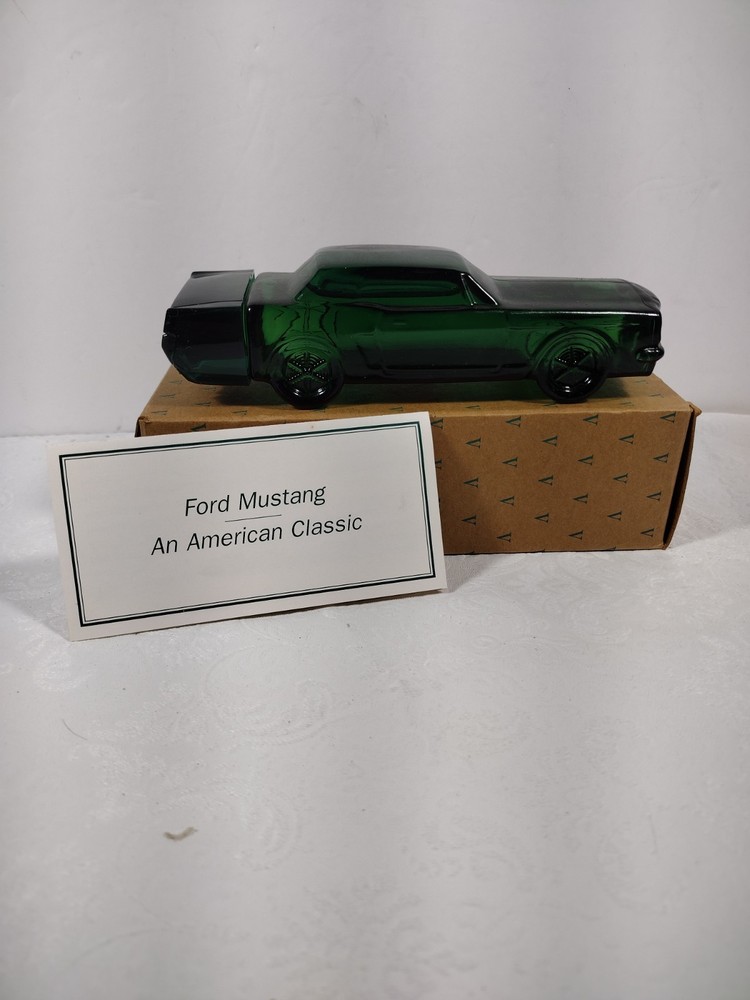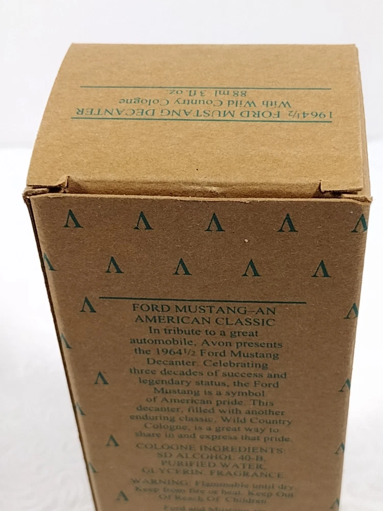 Ford mustang and American classic in tribute to a great automobile Avon presents the 1964 and a half Ford mustang decanter celebrating three decades of success and legendary status the Ford mustang is a symbol of American pride. This decanter is filled with another enduring classic, Wild Country Cologne, is a great way to share an Express that pride. This box has probably been open and closed less than 10 times in the last 50 years. as you can see by the photographs I took there is very little damage to the Box in the contents is in immaculate condition. Finding something like this in this condition is extremely rare for its age. You can conclude by this that this is not been tossed around from person to person or one gift given to another and open by another and so on and so on throughout the years it has been purchased and kept in good condition and stored appropriately to endure the years and the time it takes to someday have what would be a very rare and valuable collectible. I've only opened this box twice, and when you open it you need to take great caution and use something to assist you in opening it possibly a better knife or something slim and slender to go under the cardboard and work it gently so that you can open the lid without doing any damage. I seriously doubt that they're going to be any price drops on this it's first come first serve.