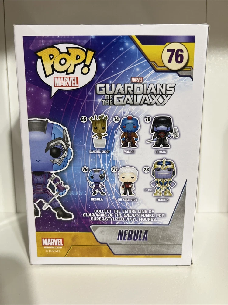TV/Streaming Show: Guardians Of The Galaxy Sport: Nebula Product Line: Pop! Vinyl Packaging: Original (Unopened) Series: Marvel Movie: Guardians of the Galaxy Type: Vinyl Figure Animation Studio: Marvel Studios Age Level: 3+ Theme: Movies Box Number: 76 Features: Vaulted, Bobble-head Color: Multicolor Exclusive Event/Retailer: Marvel Collector Corps Number in Pack: 1 MPN: 5177 Franchise: Marvel Character: Nebula Items Included: Accessory Featured Person/Artist: Nebula Size: Standard Model: Funko POP Collection: Marvel Brand: Funko Country/Region of Manufacture: Vietnam Material: Vinyl