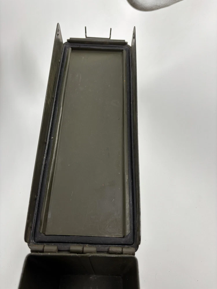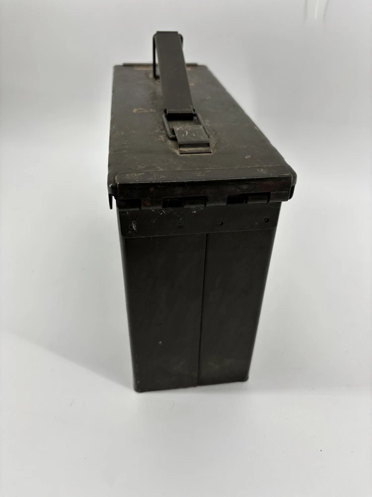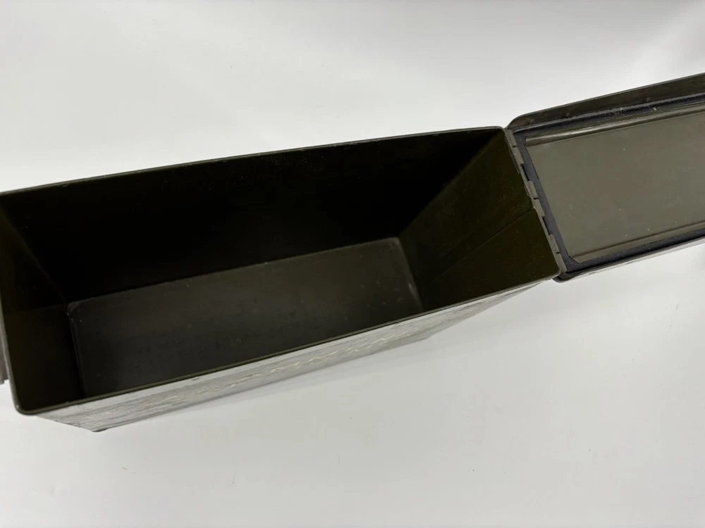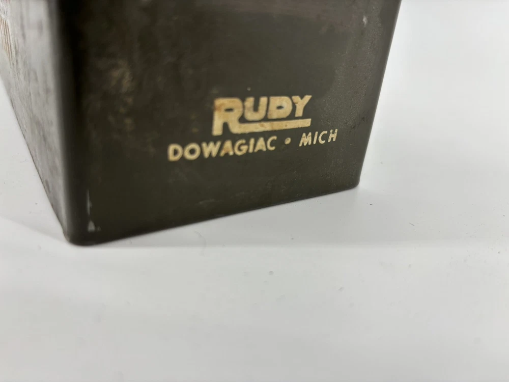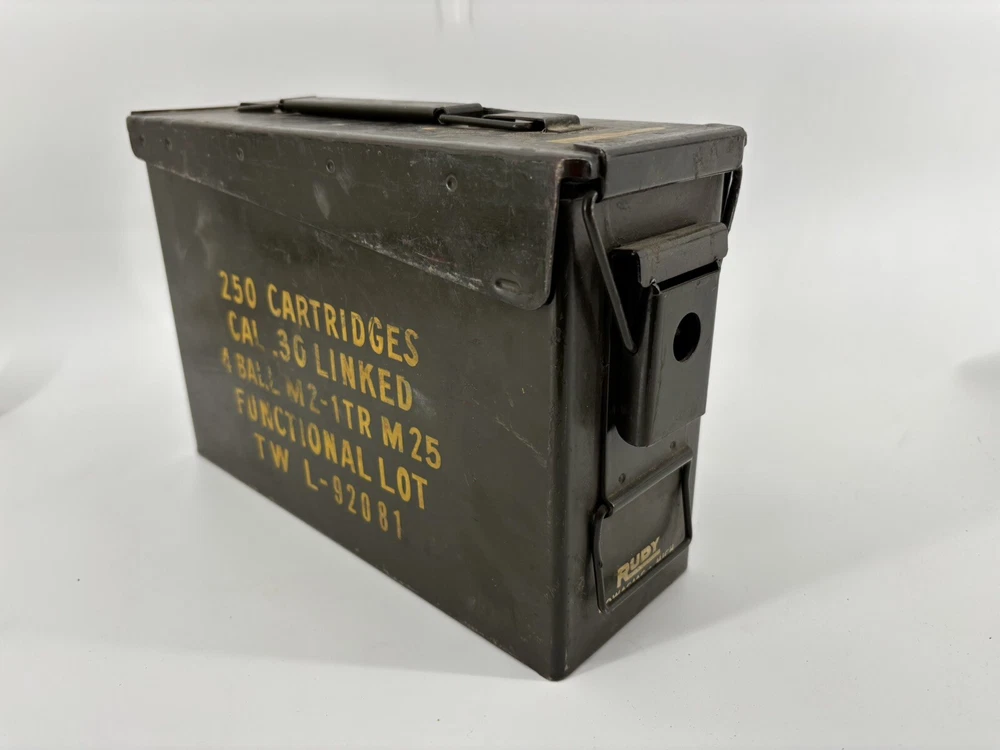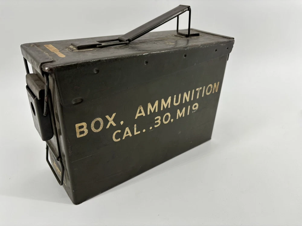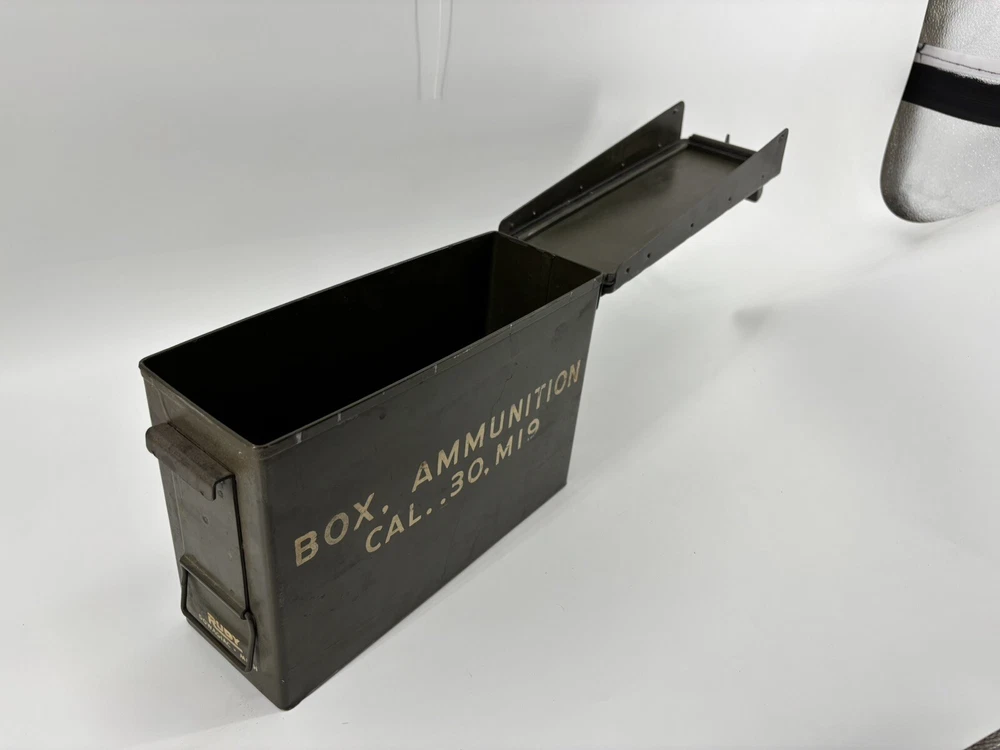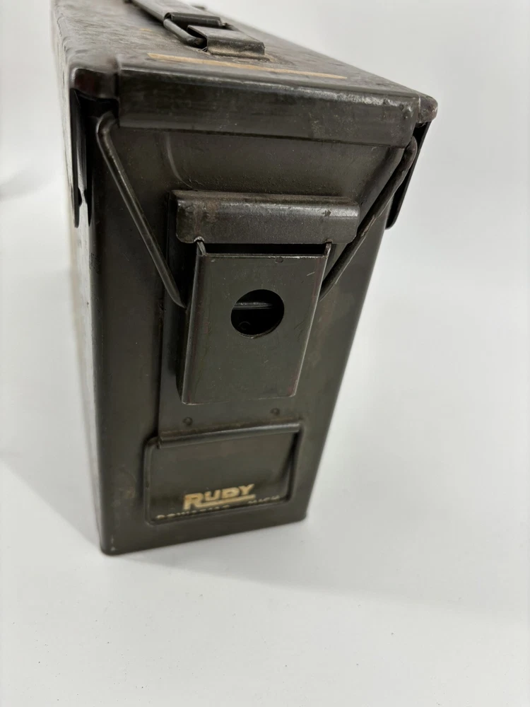 Vintage M19 ammo can manufactured by Rudy Furnace Co. Measures 10 x 7 x 3-1/2 inches. Only made from 1946-53 it is the perfect period correct box to outfit your M38 M38A1 or other period vehicle. The M19 Ammo Can (or Box Ammunition, M19) was introduced in 1946 and was manufactured for a relatively short time. There are two known manufacturers of the M19, both in Michigan: Mt. Vernon Metals in Grand Rapids and the Rudy Furnace Co. of Dowagiac. Rudy was making these boxes as early as 1948 and possibly earlier.M19 production is believed to have been terminated no later than the end of 1953.The M19A1 superseded the M19 and was produced in much larger quantities, starting in 1954 or a little earlier. The M19A1 Ammo Can corrected all of the deficiencies noted in the M19. While M19A1 cans exist in abundance, by the end of the 20th century, M19 Ammo Cans were rare and seldom found outside of militaria collections