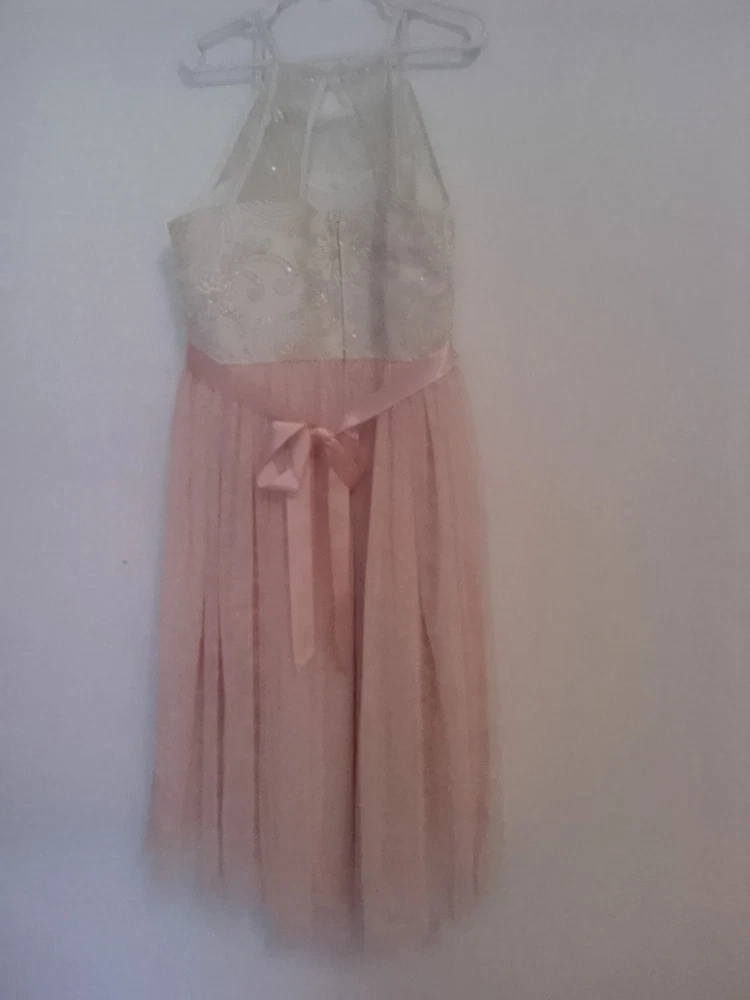 The Rare Editions Halter Sequin Rhinestone Bling Tie Back Pink Girls Dress in size 10 is a stunning formal dress perfect for a wedding or special occasion. Made of knit fabric with a stretch fit, this A-line dress features a strappy sleeve design, studded accents, and rhinestone detailing for added sparkle. The knee-length dress in a beautiful pink color adds a touch of fairy-like charm to any young girl's wardrobe. Made of 100% polyester and designed by Rare Editions, this dress is sure to make a statement and turn heads at any event.