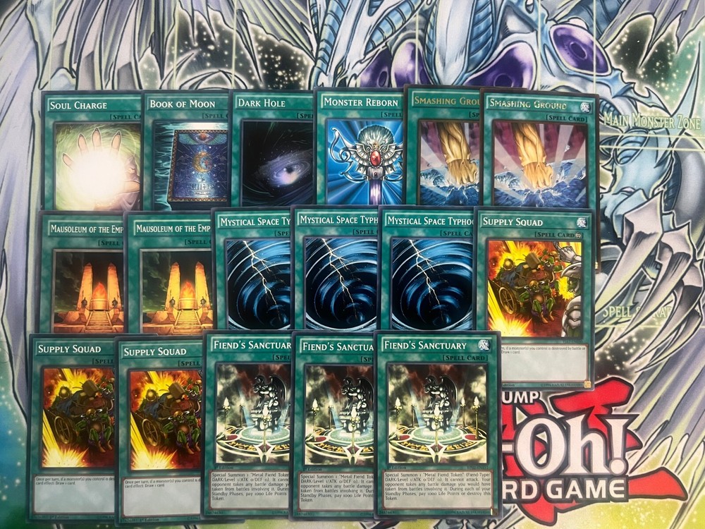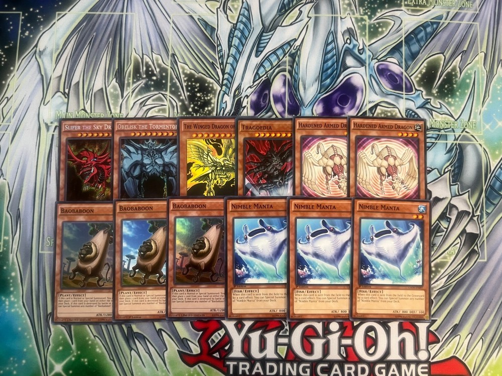 Hello! You are purchasing the deck list below, the cards will be English, real, and near mint to light play condition at worst. All decks are built with the lowest rarities for cards in mind to keep the price of the deck low and affordable for all duelists! Some cards may be in speed duel printing if this is the cheapest available copy of the card, but do not worry these are real cards and legal for tournament use! Purchase with confidence and safety! As an added bonus one pack of card sleeves will be included with your deck! Thanks again and good luck dueling! Now here's the decklist; Monsters: 1| Slifer the Sky Dragon 1| Obelisk The Tormentor 1| The Winged Dragon of Ra 1| Tragoedia 2| Hardened Armed Dragon 3| Nimble Manta 3| Baobaboon Spells; 1| Monster Reborn 1| Dark Hole 1| Book of Moon 1| Soul Charge 2| Smashing Ground 2| Mausoleum of the Emperor 3| Fiend's Sanctuary 3| Supply Squad 3| Mystical Space Typhoon Traps: 1| Jar of Avarice 1| Curse of Darkness 3| Call of the Haunted 3| Metal Reflect Slime 3| Embodiment of Apophis 3| Reckless Greed 3 Free Tokens featuring Yami Yugi, Joey, and Kaiba!