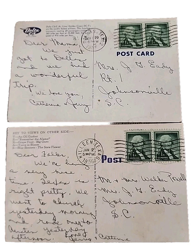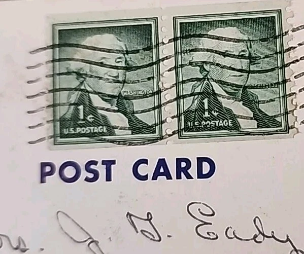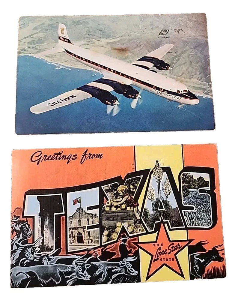Four vintage red George Washington 1 cent postage stamps, Extremely Rare, featured on postcards, one from Texas and one with a plane.