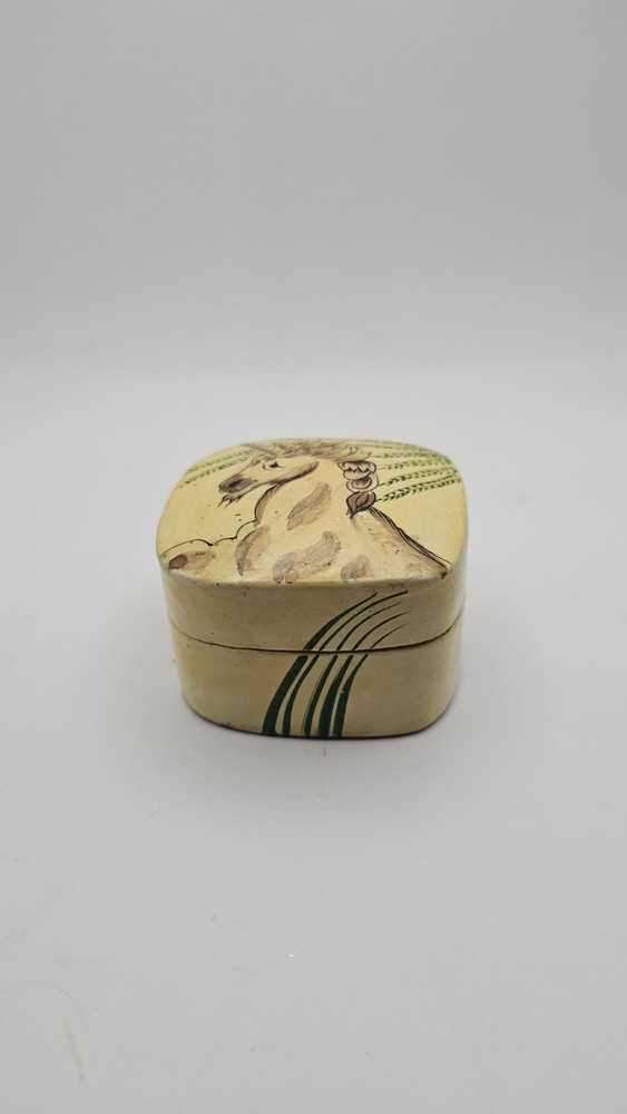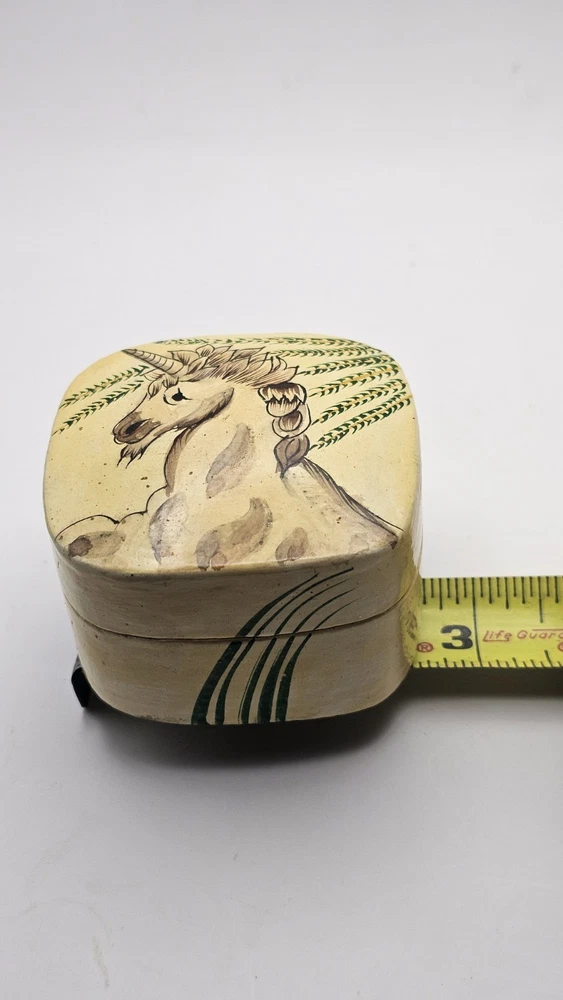 This product is a small hand-made wooden trinket box featuring a unique unicorn pattern and design in ivory and black colors. The square-shaped box is perfect for storing small items or jewelry, making it suitable for all occasions. The 1980s style collection from Kashmir India adds a touch of magic to any bedroom or dining room decor. This special piece is sure to delight teens and adults alike with its unicorn subject and hand-painted finish.