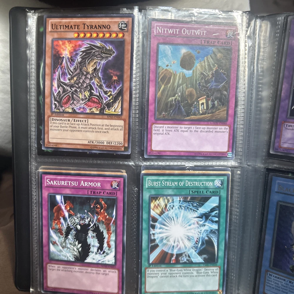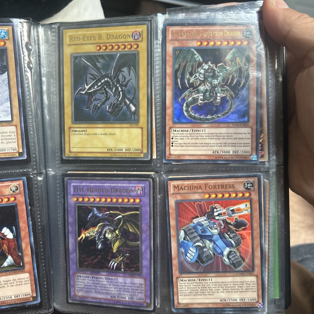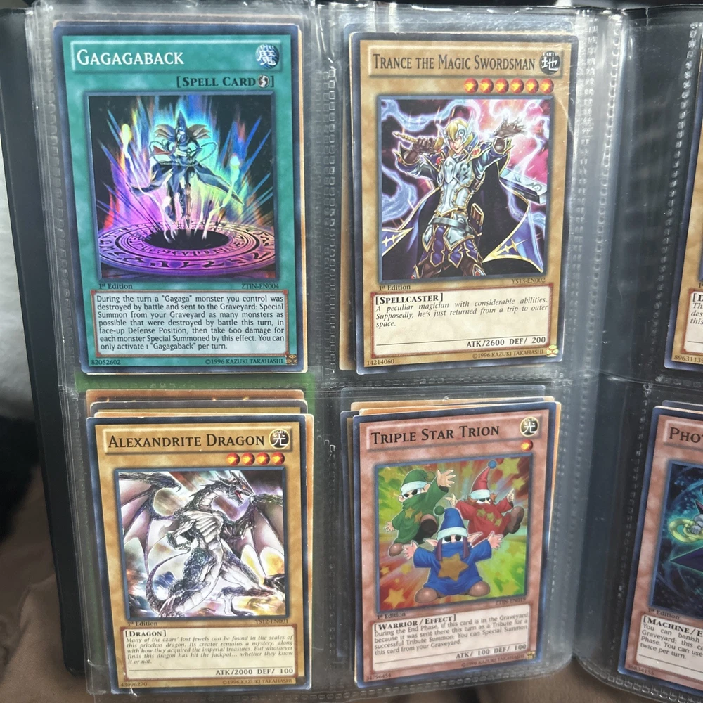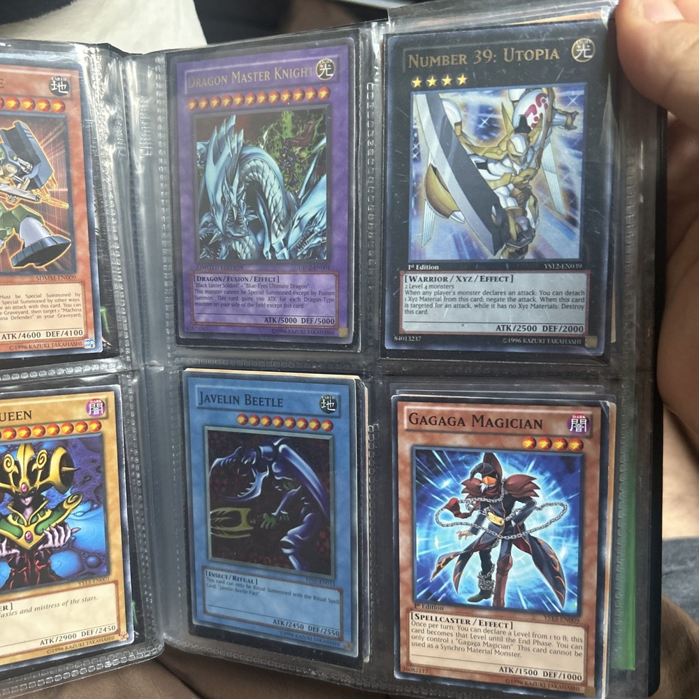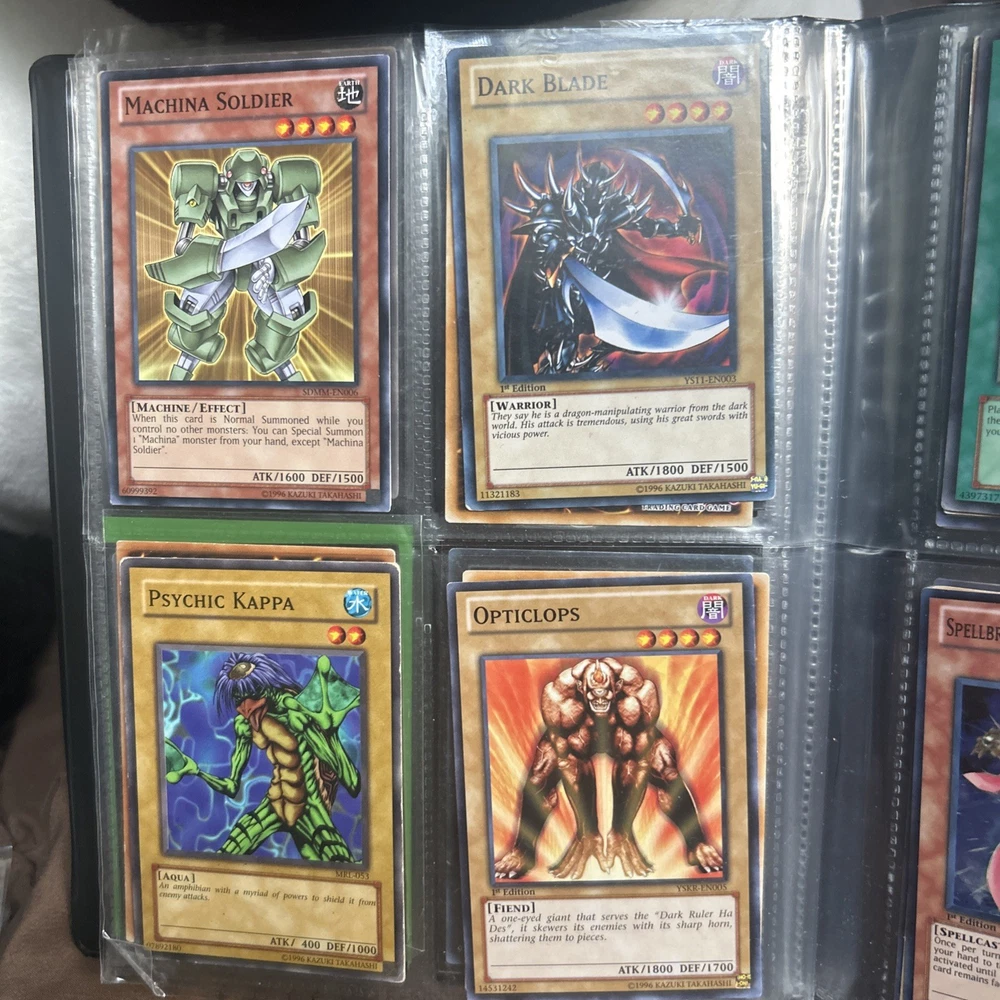 This product is a vintage binder full of Yu-Gi-Oh! trading cards from the Yugi set, manufactured by Konami in 1996. The cards are standard size, made of card stock with a holo finish, and are in English. It is a collection of collectible cards for the Yu-Gi-Oh! TCG, ideal for fans and collectors looking to expand their card collection with classic cards from the early years of the game.