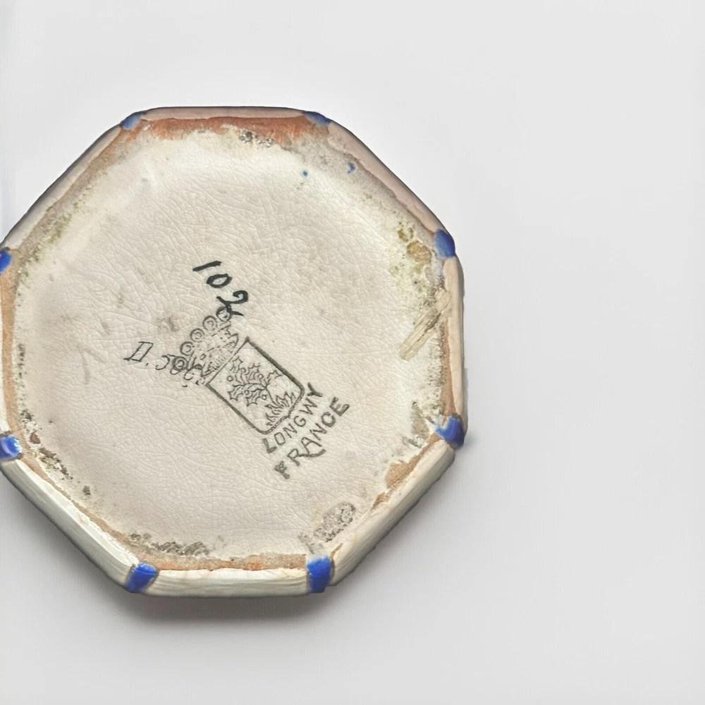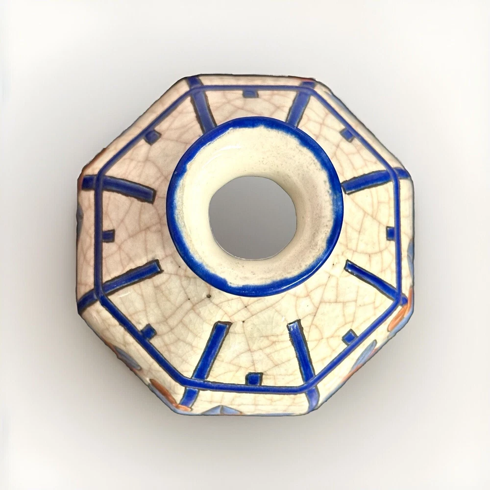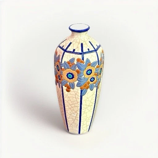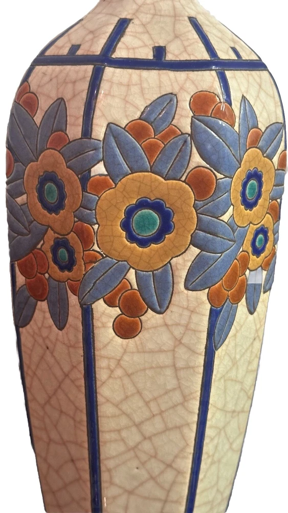 Rare, French Art Deco (c. 1920s-30s vintage) vase from Emaux de Longwy is in excellent condition with no chips, cracks hairlines or repairs. Crafted in France between 1920-1930, this large (11.5” high X 5.25” wide. 2” opening) vase features a glazed finish. The raised, relief design with dusty blue and rust leaves and ochre, deep blue and turquoise flowers set against white crackled background with blue vertical stripes make it a unique piece that will surely catch the eye of collectors.