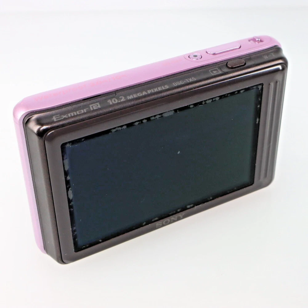 Sony Cyber-Shot DSC-TX5 10.2MP 4x Zoom Digital Camera - Rare Pink USED Product Description: Certified waterproof, dustproof, shockproof and freeze-proof. 3.0-inch wide touch screen for easy operation and viewing of images and movies. 10.2-megapixel "Exmor R" CMOS sensor for enhanced low-light performance. iSweep Panorama Mode captures stunning panoramic images; fast capture with 10fps at full 10.2MP resolution. Card slot for optional Memory Stick Duo media and SD media. Product Details: Aspect Ratio 3:2 Photo Sensor Technology BSI CMOS Supported File Format MPEG-4 Image Stabilization Optical Maximum Focal Length 100 Millimeters Optical Zoom 4 x Expanded ISO Minimum 125 Metering Description Multi, Center-weighted, Spot Brand Sony Model Name DSC-TX5 Package included: Camera Battery Charger Memory card Wrist strap On Nov 16, 2024 at 01:57:17 PST, seller added the following information: