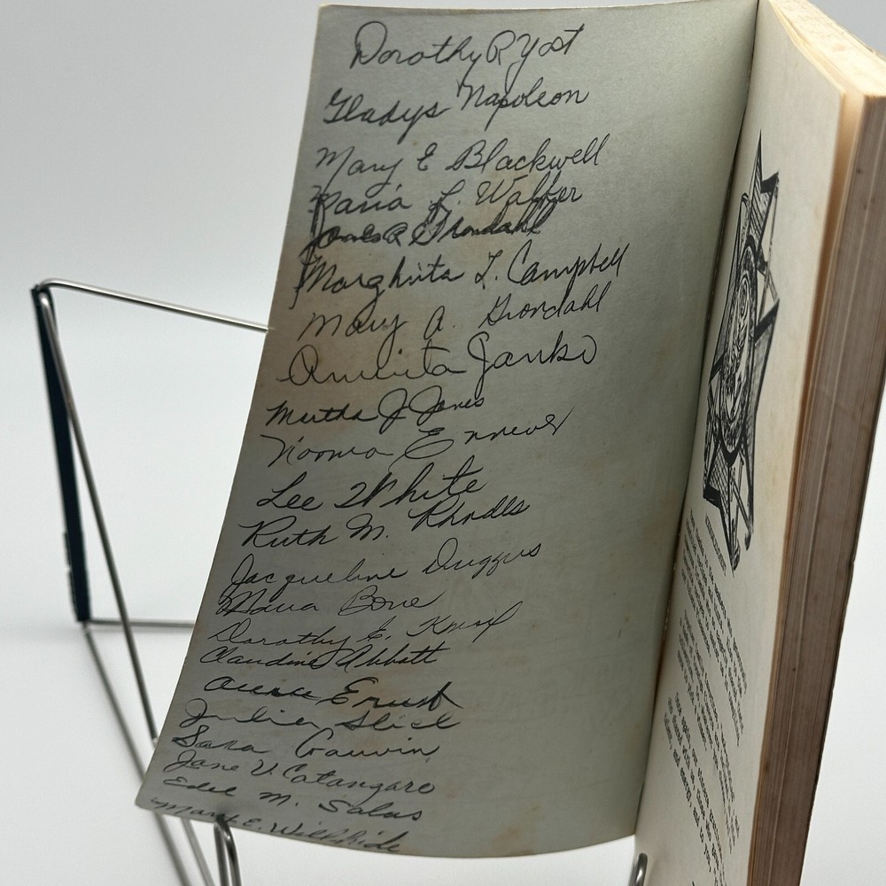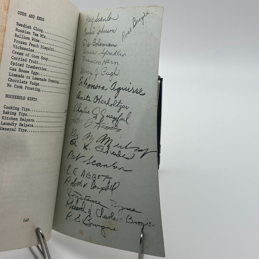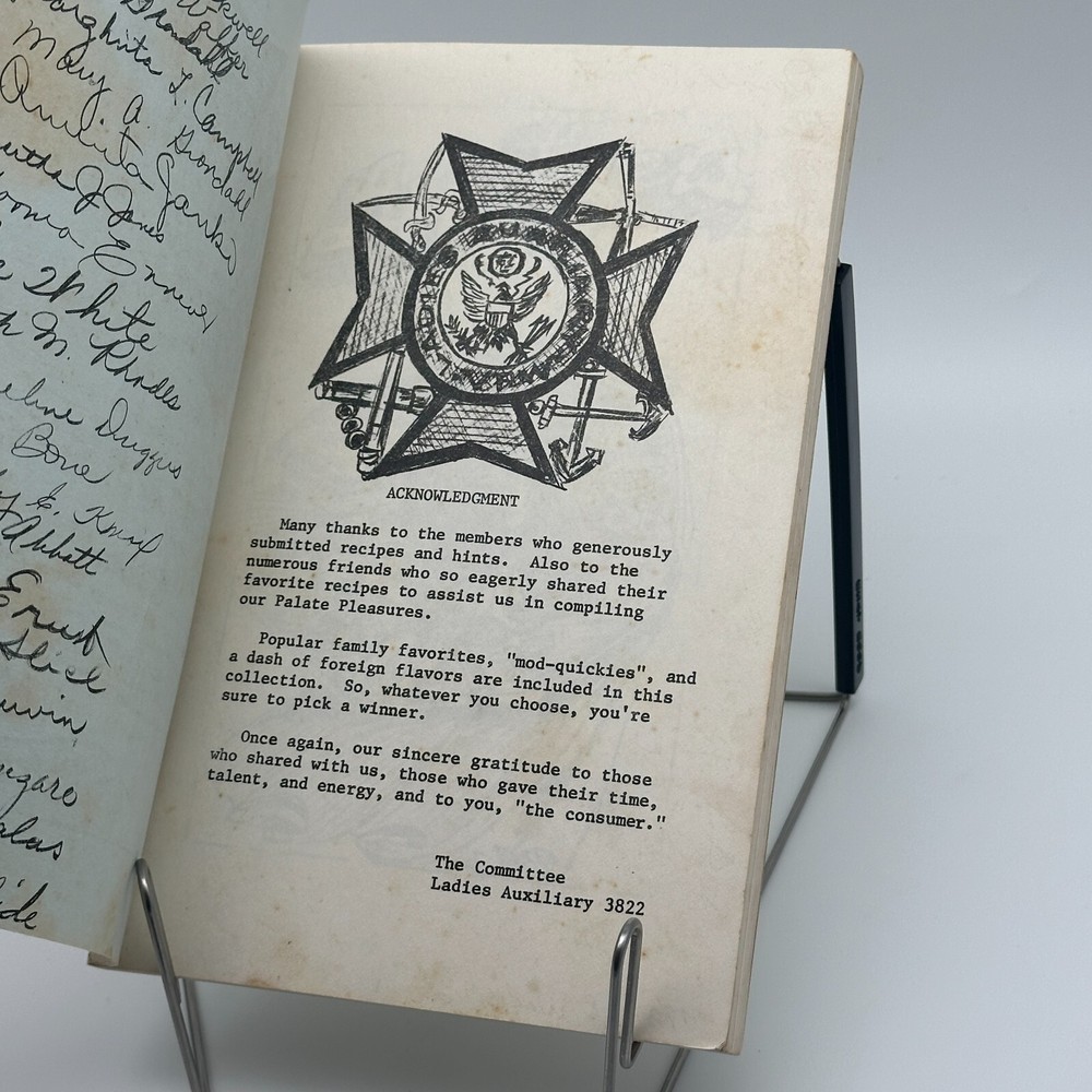 Delight in the charm of this rare, vintage community cookbook, Palate Pleasures, lovingly compiled by the Ladies Auxiliary 3822. Featuring handwritten signatures from contributors and packed with timeless recipes, household hints, and nostalgic touches, this stapled softcover gem is a perfect collector's item for cookbook enthusiasts. The detailed cover illustration adds a rustic charm, and its unique history makes it a standout piece for your collection. Don't miss this opportunity to own a piece of vintage culinary and community history! A "Ladies Auxiliary Community" refers to a group of women, often affiliated with a larger organization like a service club or veterans group, who primarily focus on volunteering and fundraising to support their community, usually by assisting with events, providing charitable donations, and advocating for local causes ; essentially, a women's group dedicated to community service within a specific framework.