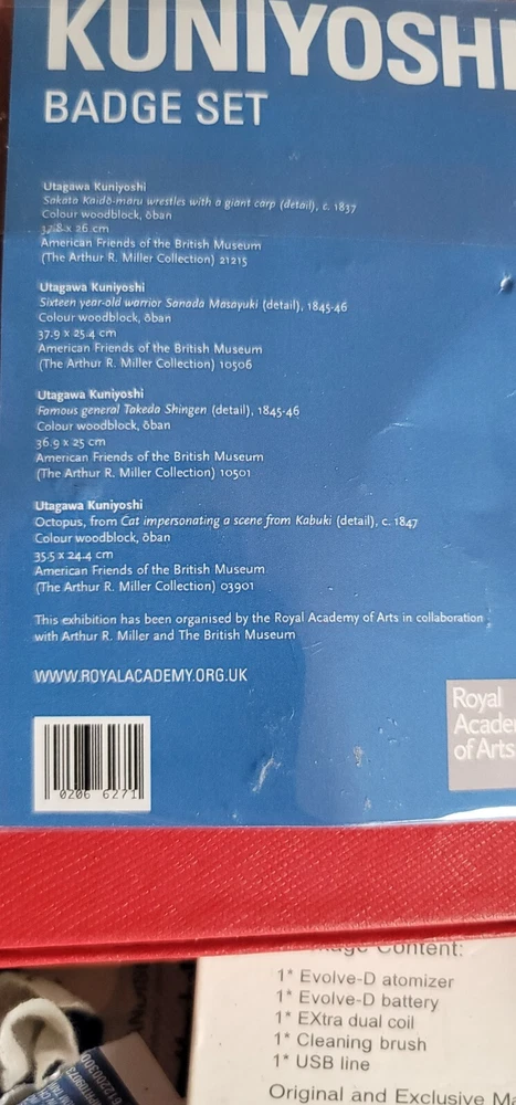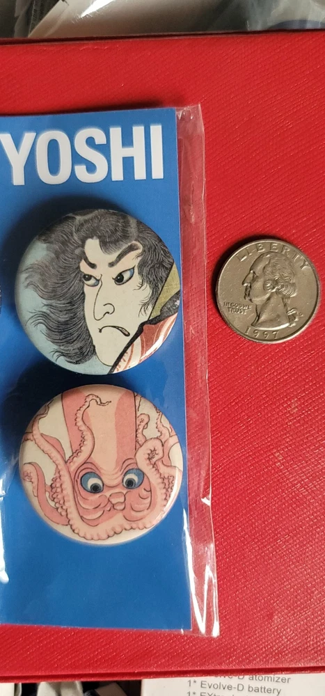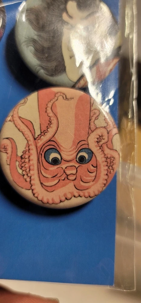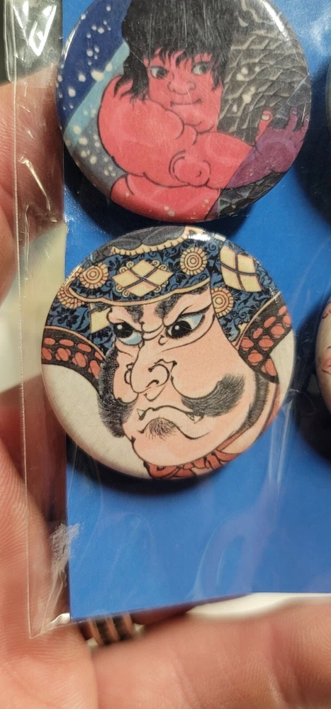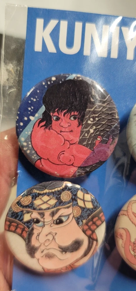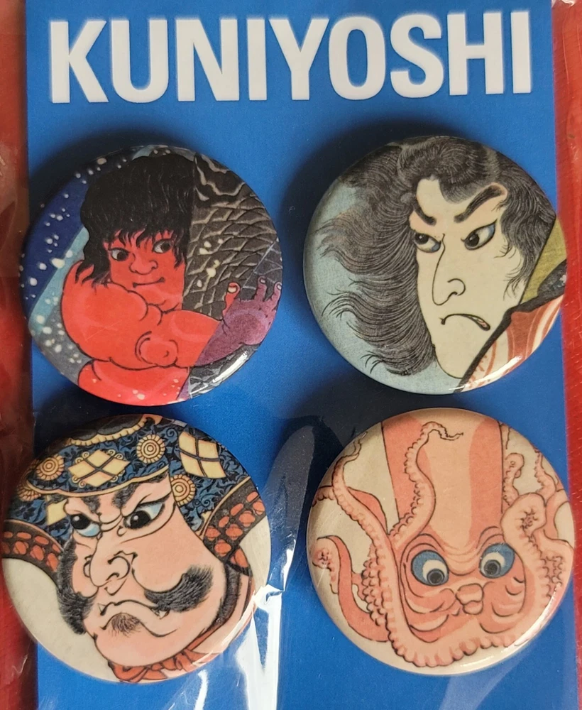 Rare still sealed in original packaging. Pack of (4) Utawaga Kuniyoshi Art Print Button/Badge Set A limited exhibition release by the Royal Academy of Arts in collaboration with Arthur R. Miller and the British Museum. • Sakata Kaido wrestles with a giant carpet (detail) c.1837 • Sixteen year old warrior Sanada Masayuki (detail) c.1845-1846 • Famous general Takeda Shingen (detail) c.1845-1846 • Octopus, from Cat impersonating a scene from Kabuki (detail) c.1847 Each badge measures 1 - 7/16". A scale representation has been pictured next to a USA quarter piece. (NOT INCLUDED) The outside plastic packaging shows minor signs of age and storage.