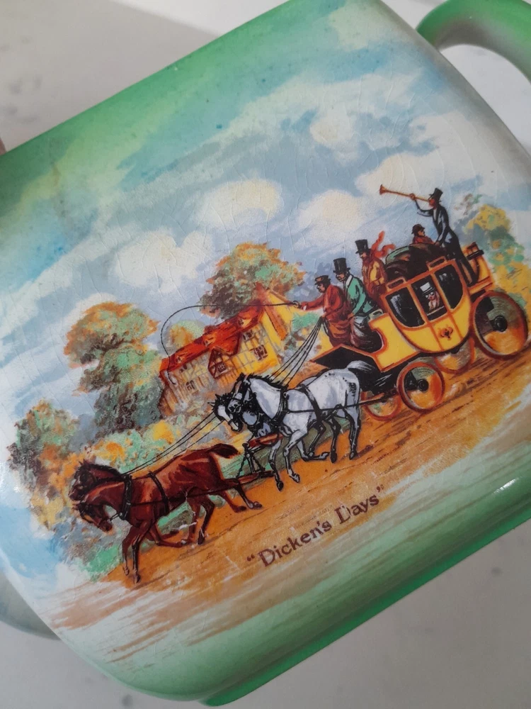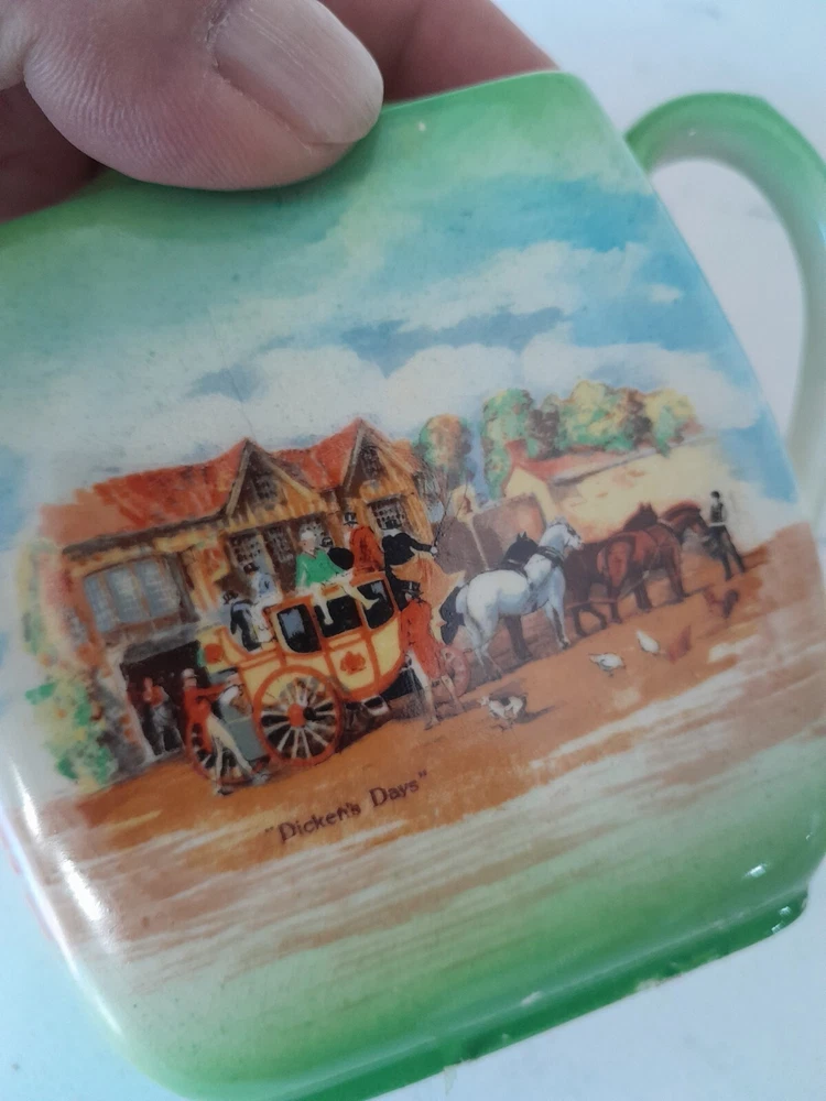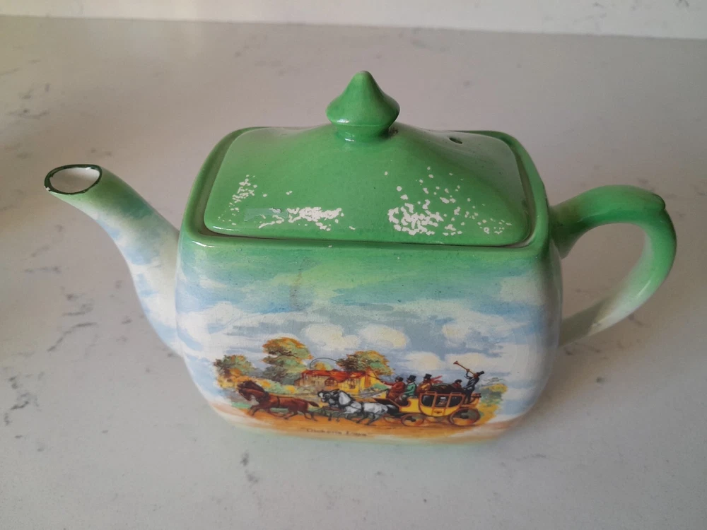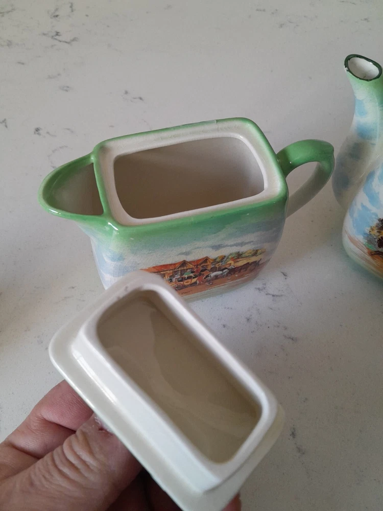 This is a rare vintage 3-piece tea set from Empire Ware in the Dickens Days pattern. Made in the United Kingdom, the set features a multicolor design on bone china with a glazed finish. It includes a teapot with lid, along with a creamer, both featuring 3 compartments. This original set is a charming addition to any tea collection. Some wearing to original finish as Shown. No chips.