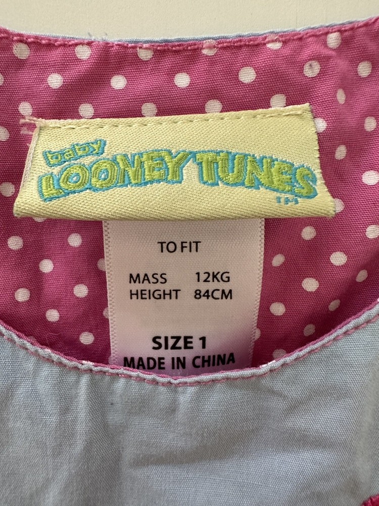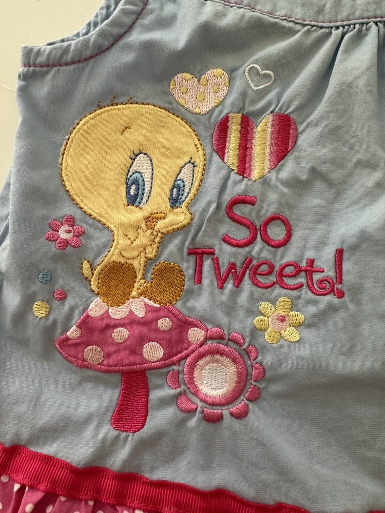 Character Family:Looney Tunes, tweety birdMaterial:100% Cotton, CottonVintage:YesSleeve Length:SleevelessDepartment:GirlsColor:blueStyle:dressSet Includes:DressSize:1Number of Pieces:1 PieceTheme:90s, Baby Shower, Cartoon, TV & Movie CharactersBrand:Looney TunesAccents:EmbroideredType:DressColour:BlueCharacter:Tweety