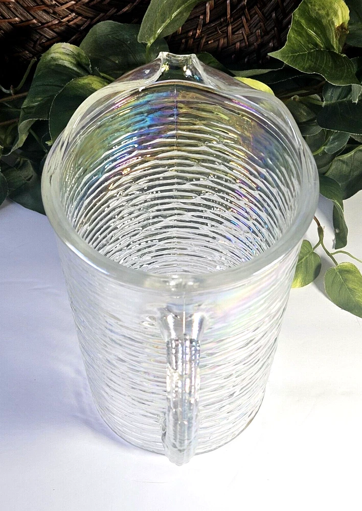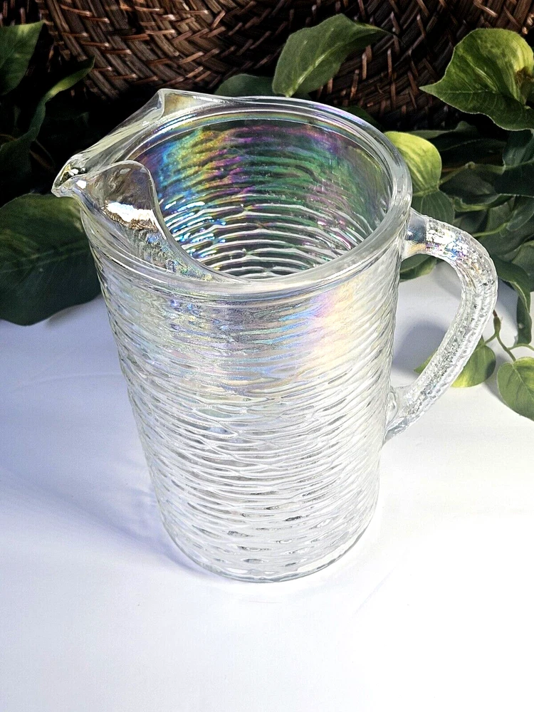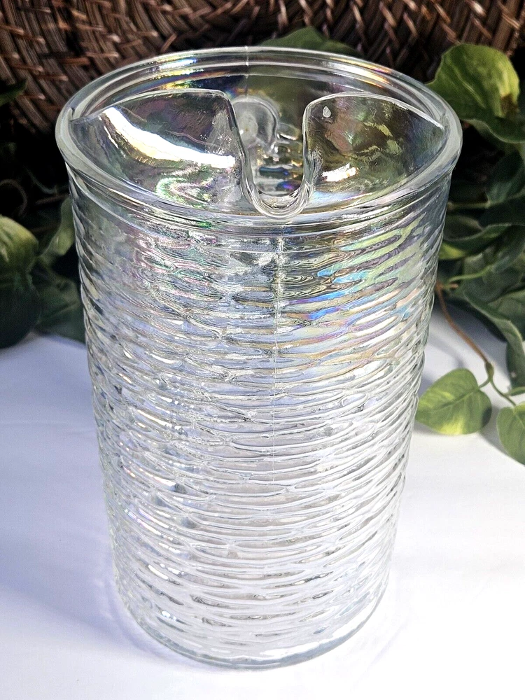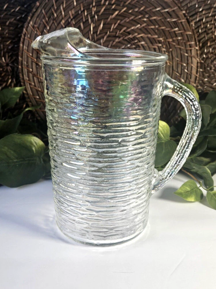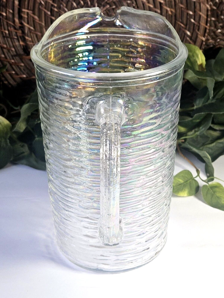 Elevate your serving collection with the vintage Anchor Hocking Soreno Aurora Iridescent Glass Pitcher. A stunning piece from the 1960s, it boasts a glossy finish with the captivating Bark Design pattern, showcasing the exquisite craftsmanship of the era. The pitcher's iridescent colors dance in the light, making it a unique focal point at any gathering.With a generous 64 OZ capacity, this multicolor piece is not only decorative but functional, perfect for serving beverages at retro-themed events or adding a touch of nostalgia to your daily tableware. Measuring 9 inches in height and 7.5 inches in length, it's sized just right for easy handling and display. Hand wash only care ensures the preservation of its classic beauty.