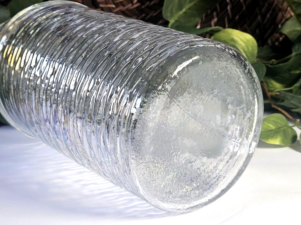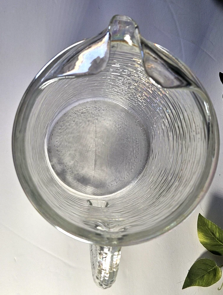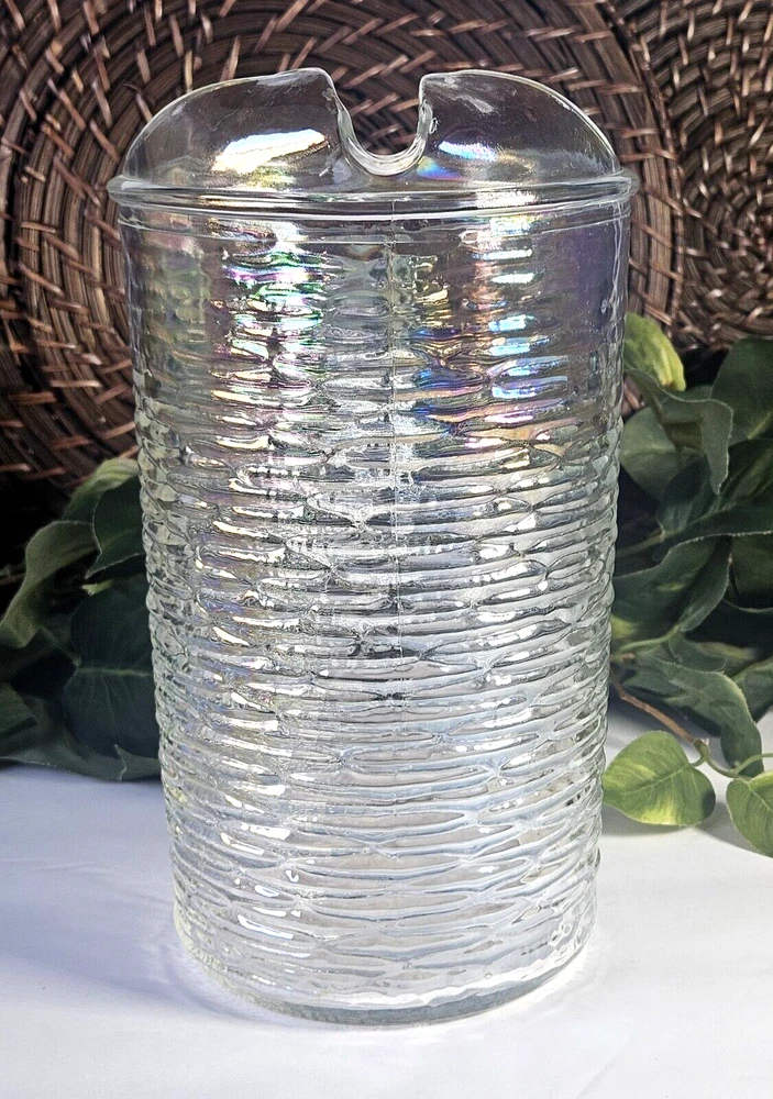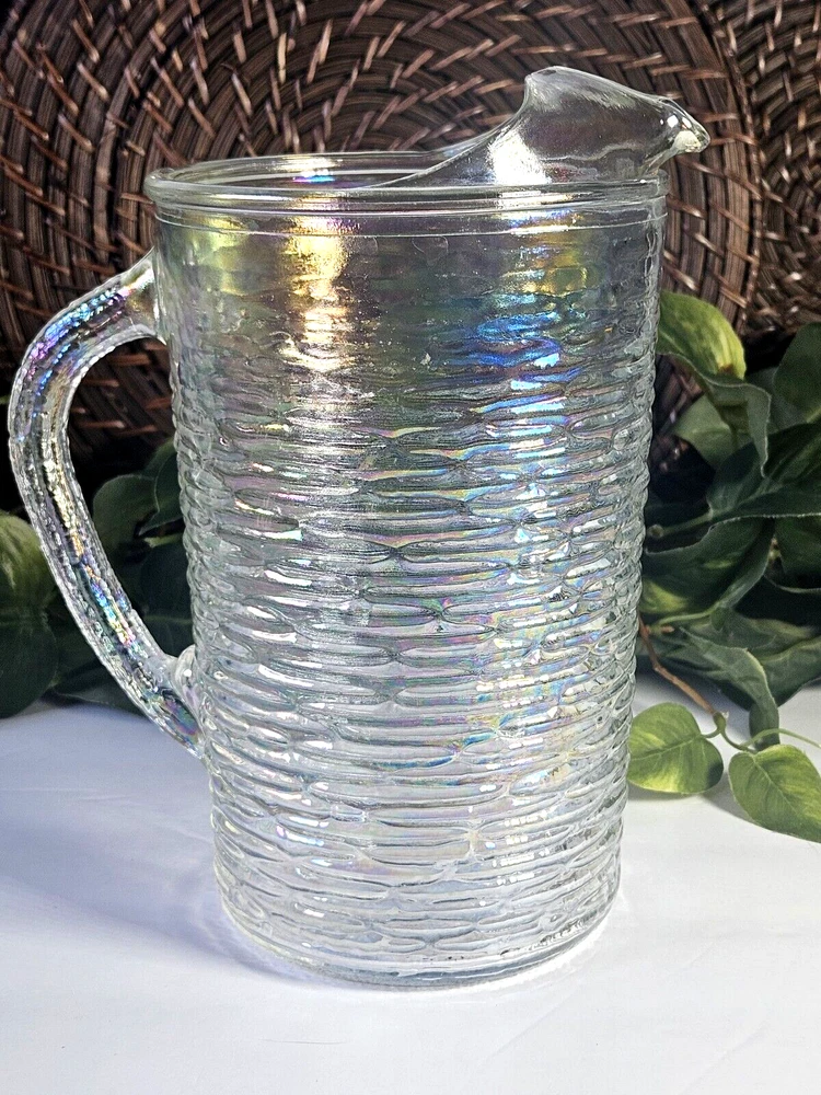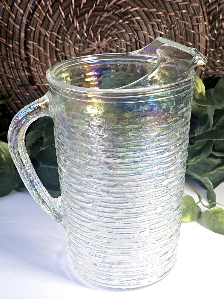 Elevate your serving collection with the vintage Anchor Hocking Soreno Aurora Iridescent Glass Pitcher. A stunning piece from the 1960s, it boasts a glossy finish with the captivating Bark Design pattern, showcasing the exquisite craftsmanship of the era. The pitcher's iridescent colors dance in the light, making it a unique focal point at any gathering.With a generous 64 OZ capacity, this multicolor piece is not only decorative but functional, perfect for serving beverages at retro-themed events or adding a touch of nostalgia to your daily tableware. Measuring 9 inches in height and 7.5 inches in length, it's sized just right for easy handling and display. Hand wash only care ensures the preservation of its classic beauty.