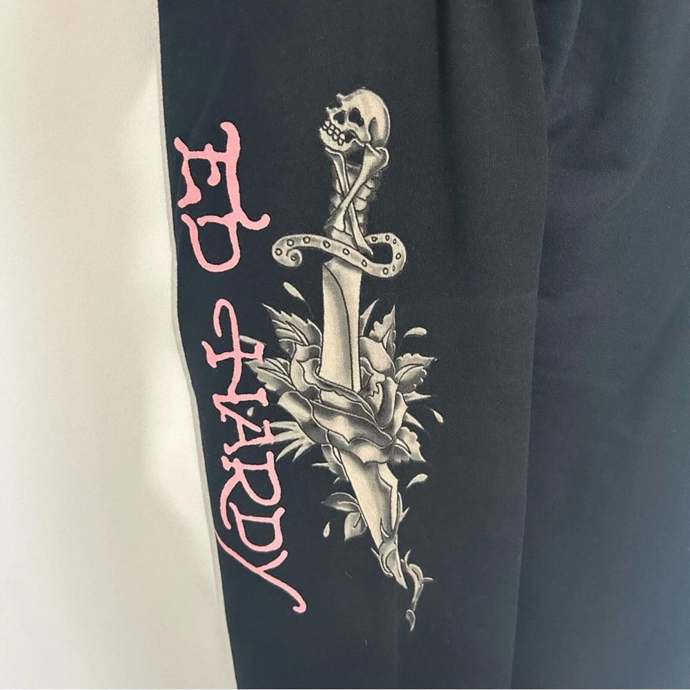 Women’s pants, lounge pants, sweat pants Ed Hardy Mid rise Drawstring 100% cotton Bedazzled skull design Rare vintage item, in good used PreOwned condition