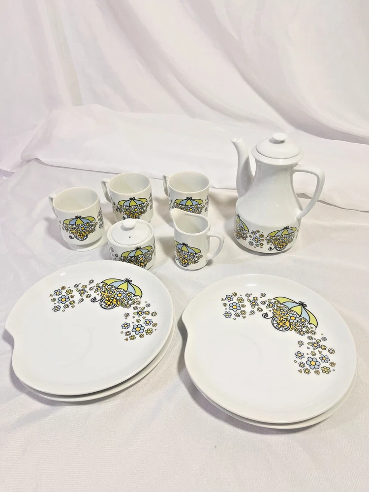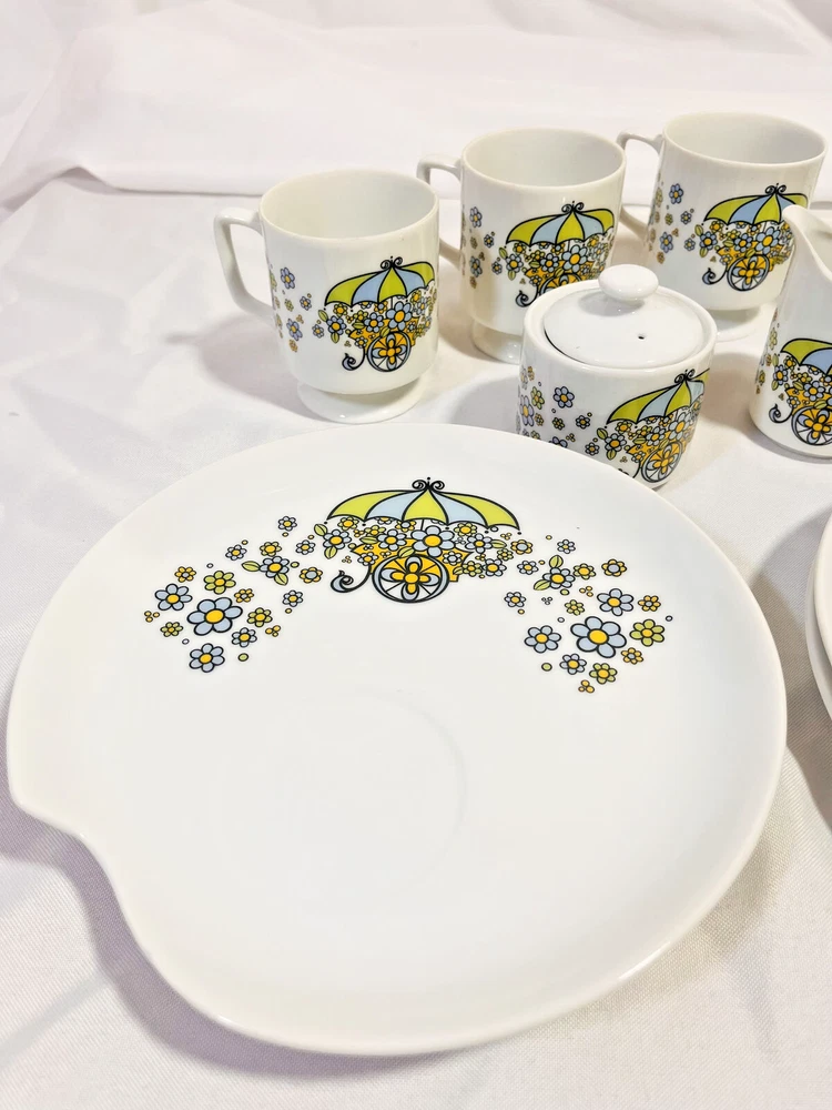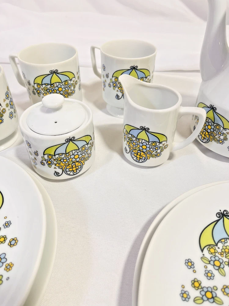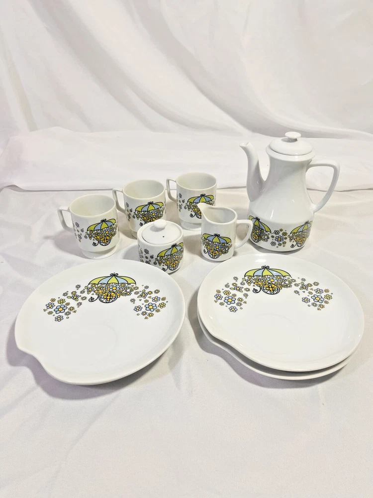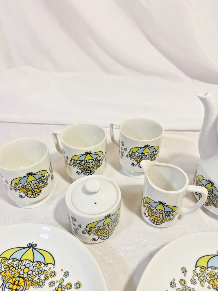 This rare vintage tea set is a true gem for collectors and tea enthusiasts alike. The set includes a teapot, creamer, lidded sugar bowl, three tea cups and 4 plates all beautifully crafted with a stunning floral pattern in shades of blue, green, and yellow. The set is made in Japan and has a glossy finish that adds to its elegance. The set is perfect for serving tea to guests or for display purposes, and it is sure to be a conversation starter. The vintage set is not handmade and is made with high-quality materials. Most likely made late 1960's early 1970's. This tea set is a must-have for anyone who is looking to add a touch of vintage charm to their collection. The teapot measures approximately 7.25" tall. The creamer measures approximately 3.5" tall. The sugar bowl measures approximately 3.25" tall. Cups are approximately 3.25" tall and 3" round. The plates are 8" round with a unique shape. They are perfect for holding your tea cup and pastries. Beautiful set that has never been used. Only for display. No chips or cracks. Very MCM!