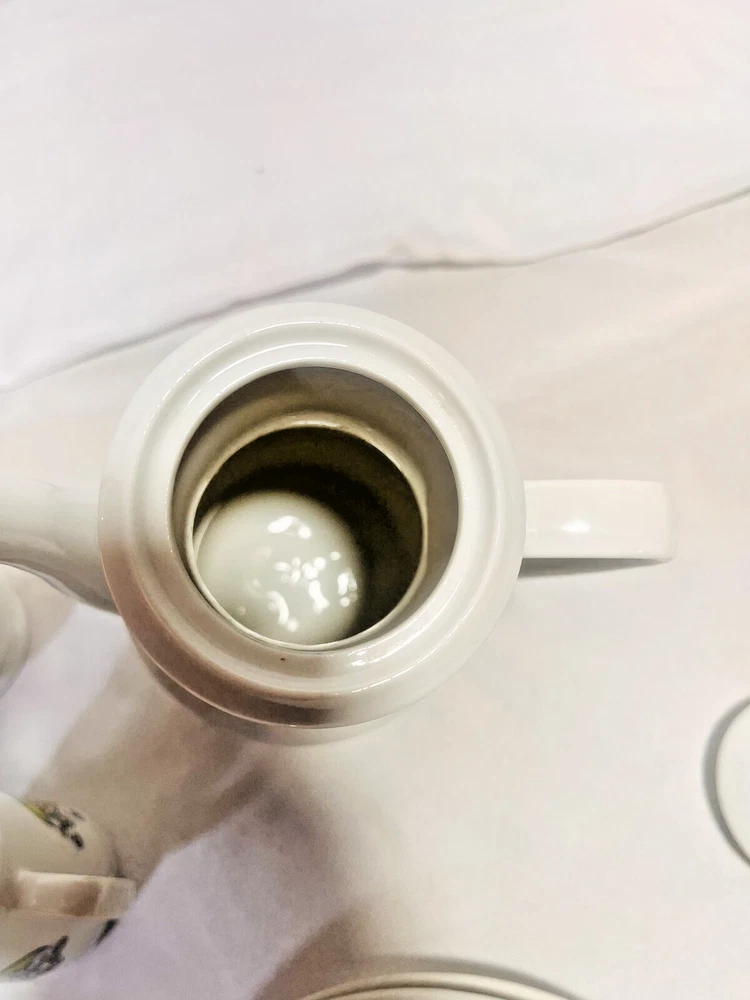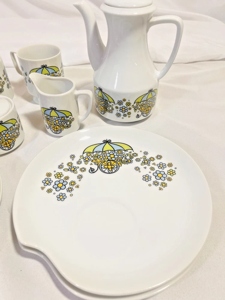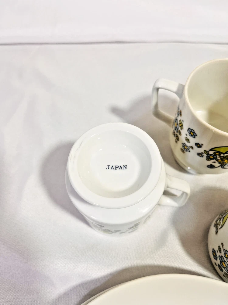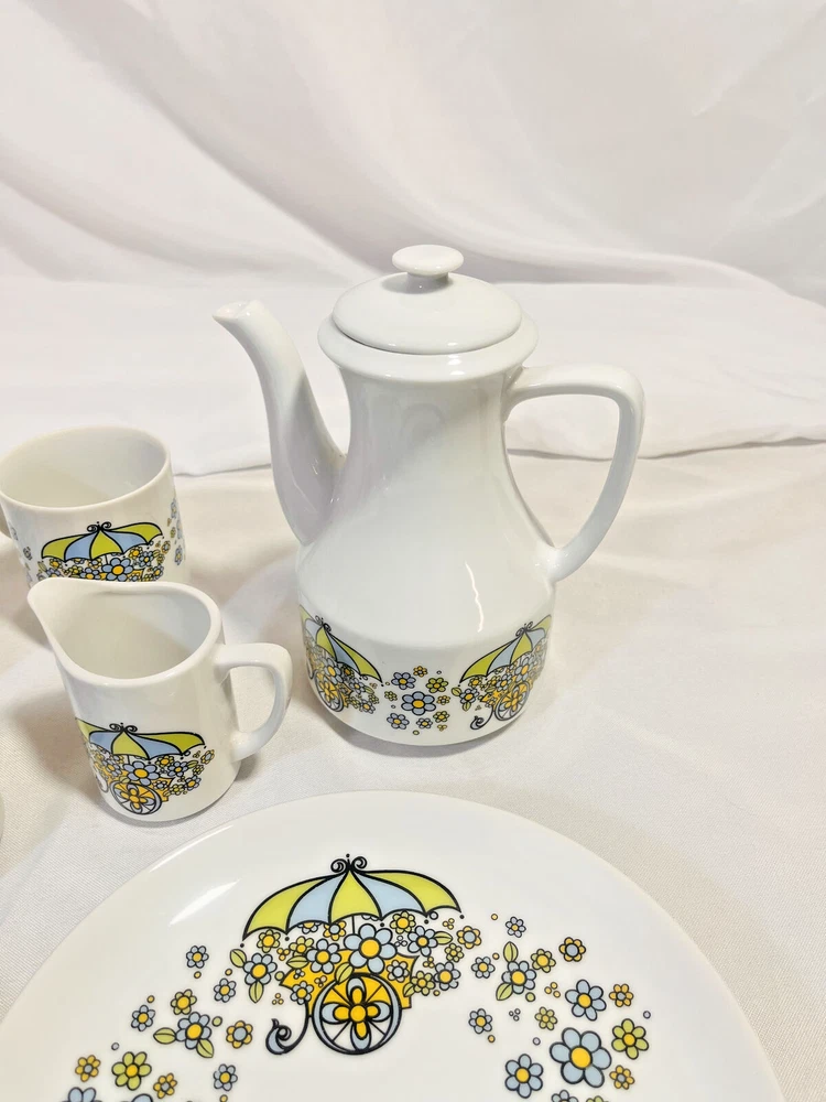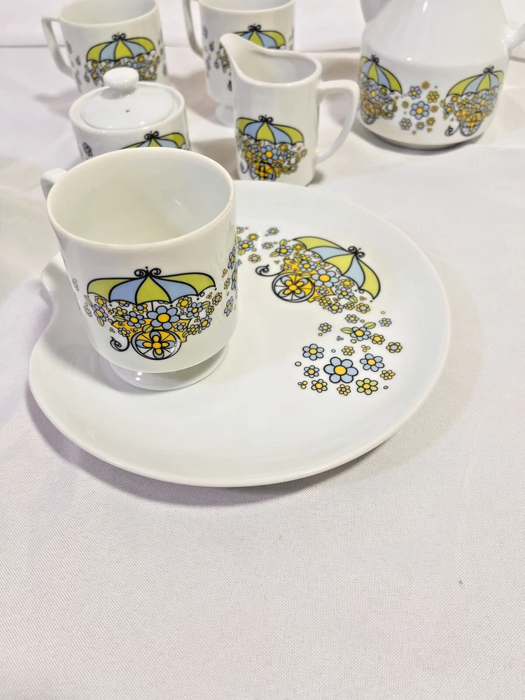 This rare vintage tea set is a true gem for collectors and tea enthusiasts alike. The set includes a teapot, creamer, lidded sugar bowl, three tea cups and 4 plates all beautifully crafted with a stunning floral pattern in shades of blue, green, and yellow. The set is made in Japan and has a glossy finish that adds to its elegance. The set is perfect for serving tea to guests or for display purposes, and it is sure to be a conversation starter. The vintage set is not handmade and is made with high-quality materials. Most likely made late 1960's early 1970's. This tea set is a must-have for anyone who is looking to add a touch of vintage charm to their collection. The teapot measures approximately 7.25" tall. The creamer measures approximately 3.5" tall. The sugar bowl measures approximately 3.25" tall. Cups are approximately 3.25" tall and 3" round. The plates are 8" round with a unique shape. They are perfect for holding your tea cup and pastries. Beautiful set that has never been used. Only for display. No chips or cracks. Very MCM!