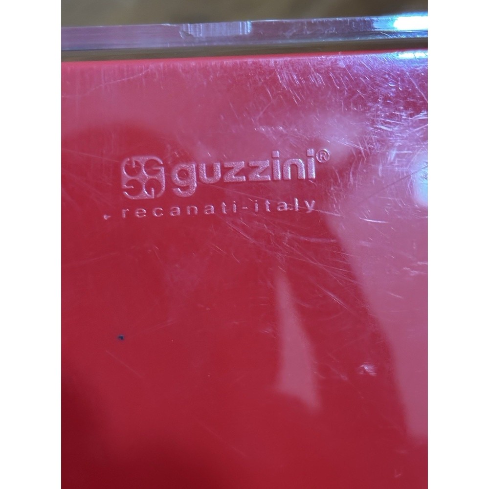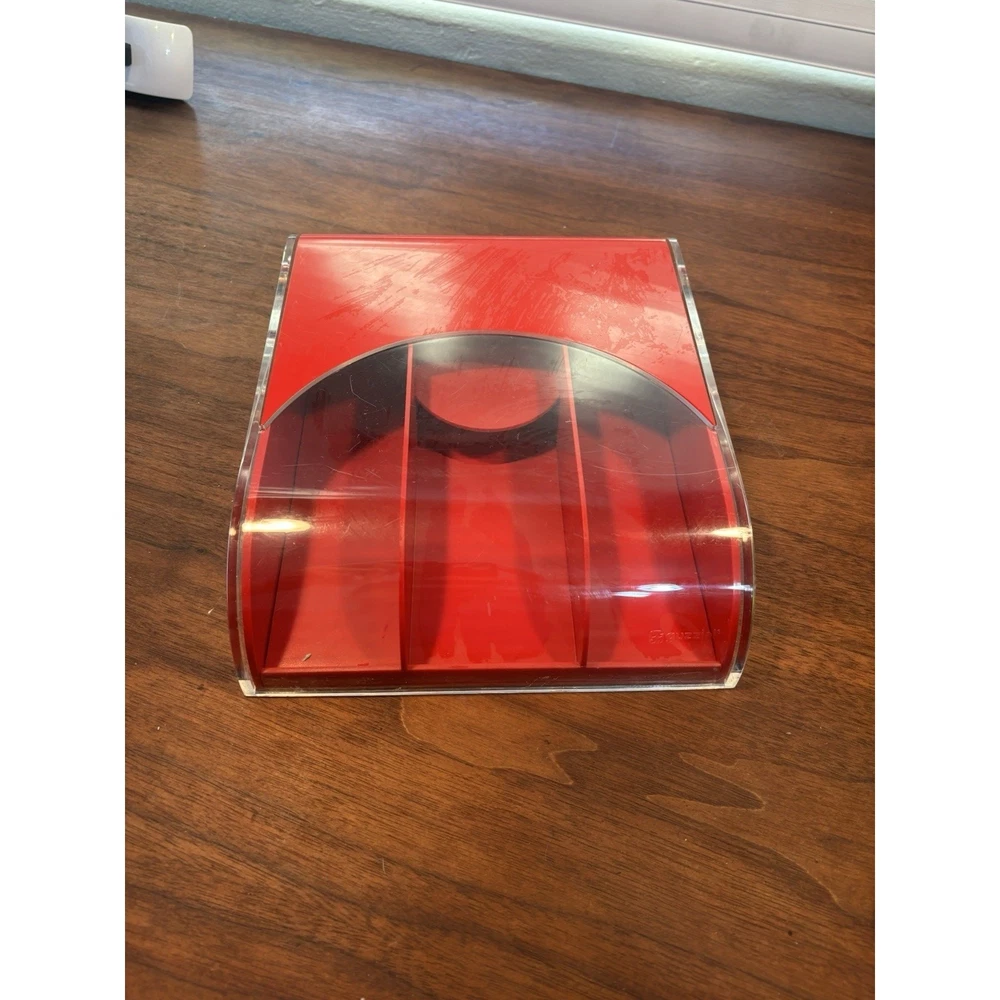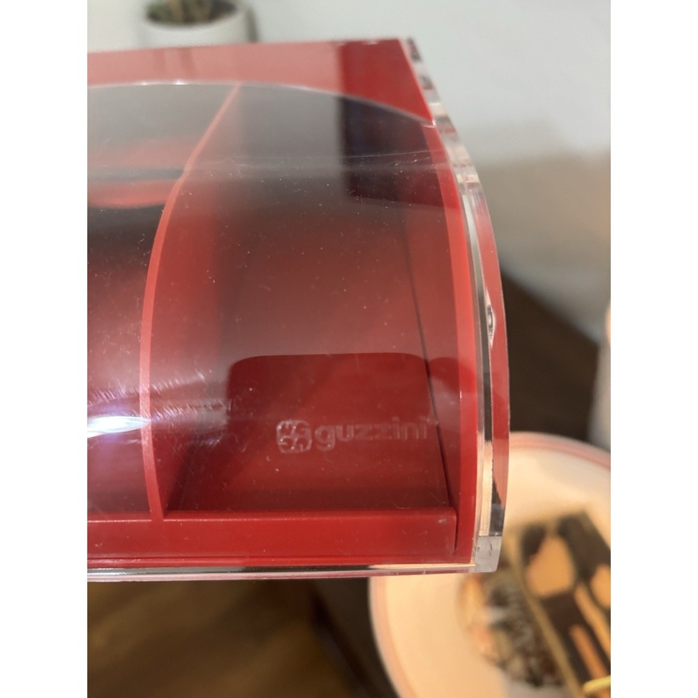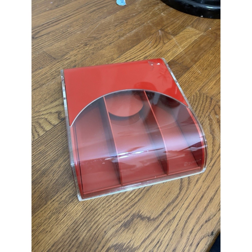Rare vintage Italian Guzzini acrylic desk organizer (1970s–1980s). Features a clear curved roll-top lid that slides open to reveal divided compartments. Iconic red & clear space-age design in high-quality acrylic. Perfect for use as a desk accessory, organizer for pens/pencils, small office supplies, or vanity storage. A great example of Italian modernist design by Guzzini, known for their innovative use of plastics in mid-century and space-age homewares. • Brand: Guzzini (marked on side) • Color: Red & Clear Acrylic • Style: Mid Century Modern / Space Age • Condition: Pre-owned, light surface scratches and signs of use consistent with age (see photos). No cracks. • Dimensions: Approx. 9.5” L × 7.5” W × 2.75” H Guzzini, Luigi Massoni, Italian design, acrylic organizer, vintage desk accessory, mid century modern, space age, pop art style, retro office supply, 1970s decor, collectible plastic
