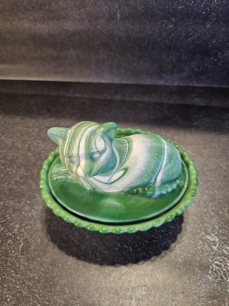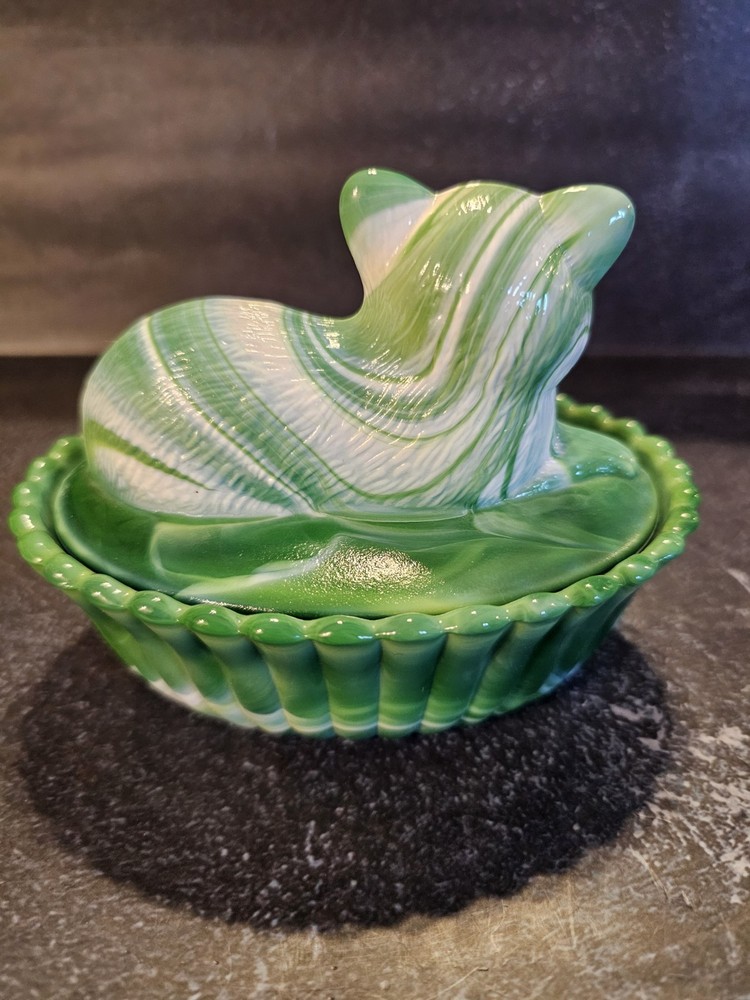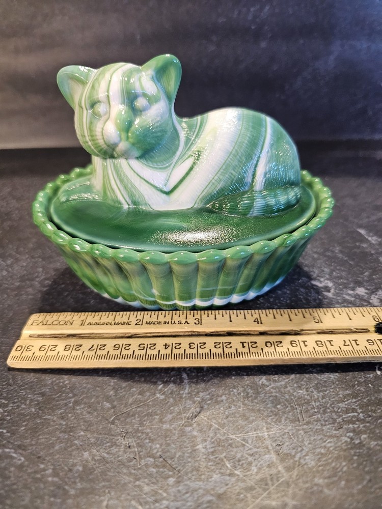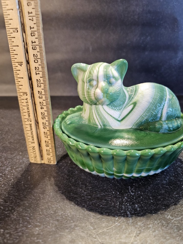 pristine condition Crafted with care, the Westmoreland Cat on Nest figurine is a treasure from the United States, showcasing the timeless beauty of slag glass. The piece features a glossy finish that highlights its green and white hues, bringing a touch of elegance to any collection or display. Measuring at a charming 4 inches in height and 5.5 inches in length, this decorative item is a testament to the artistry of the late 20th century. The collectible nature of this piece is evident in its craftsmanship, making it a must-have for enthusiasts and connoisseurs of vintage art glass. Its impressive backstamp confirms its authenticity as an original Westmoreland production, ensuring that you possess a genuine article of historical value. Adorn your space with this rare and exquisite figurine and enjoy the sophistication it brings to your home decor.