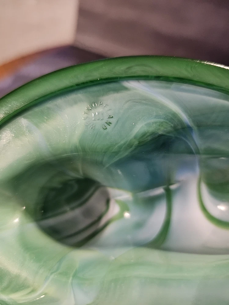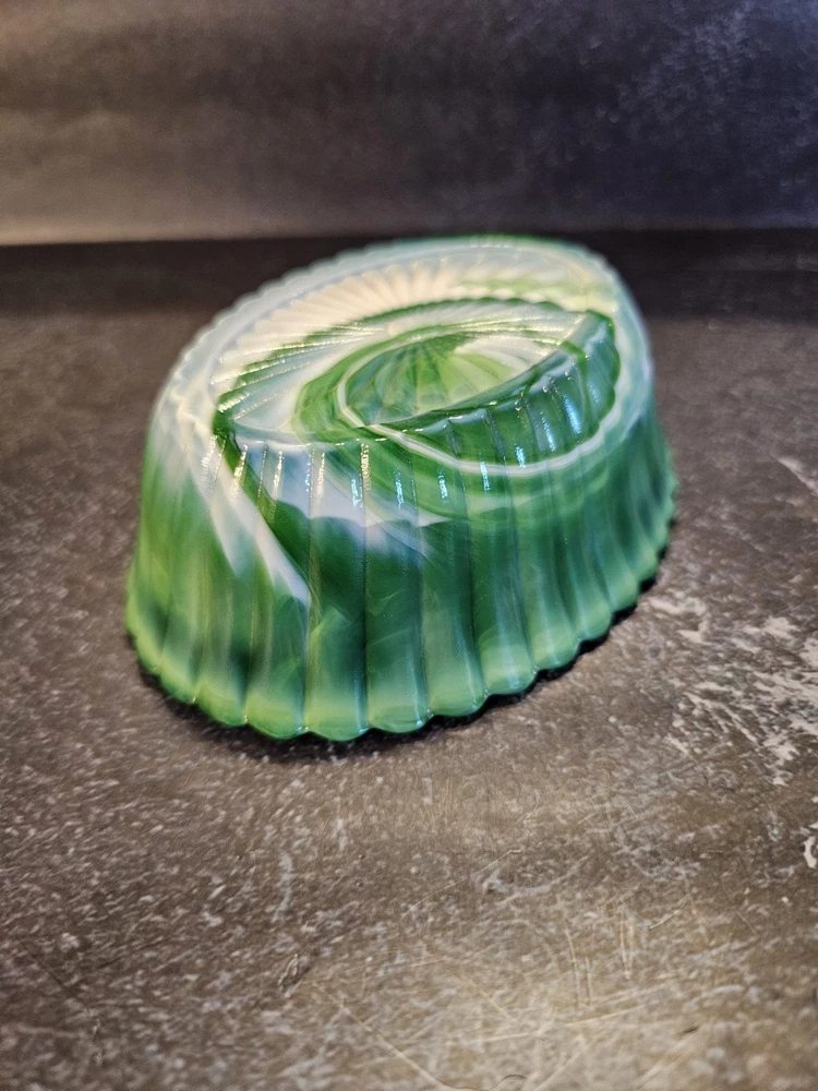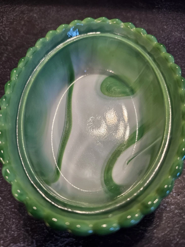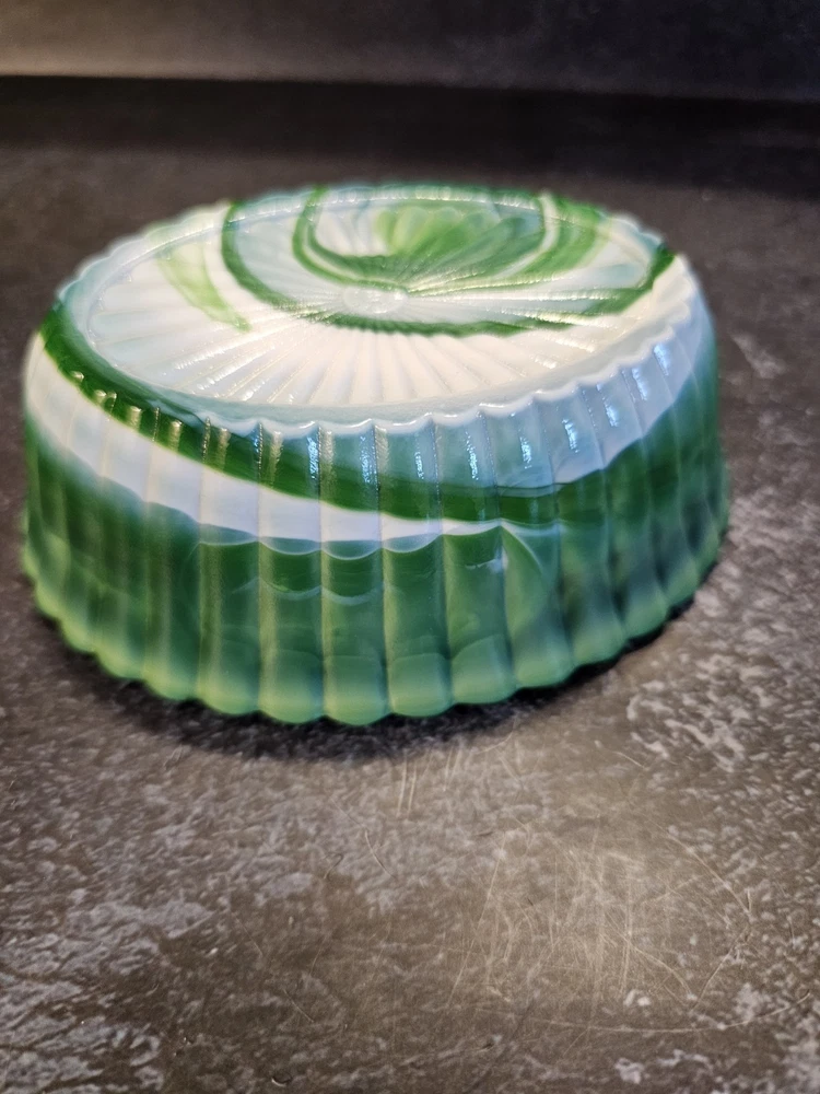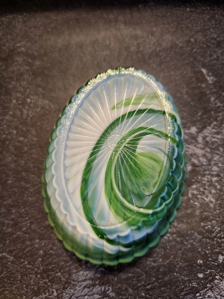 pristine condition Crafted with care, the Westmoreland Cat on Nest figurine is a treasure from the United States, showcasing the timeless beauty of slag glass. The piece features a glossy finish that highlights its green and white hues, bringing a touch of elegance to any collection or display. Measuring at a charming 4 inches in height and 5.5 inches in length, this decorative item is a testament to the artistry of the late 20th century. The collectible nature of this piece is evident in its craftsmanship, making it a must-have for enthusiasts and connoisseurs of vintage art glass. Its impressive backstamp confirms its authenticity as an original Westmoreland production, ensuring that you possess a genuine article of historical value. Adorn your space with this rare and exquisite figurine and enjoy the sophistication it brings to your home decor.