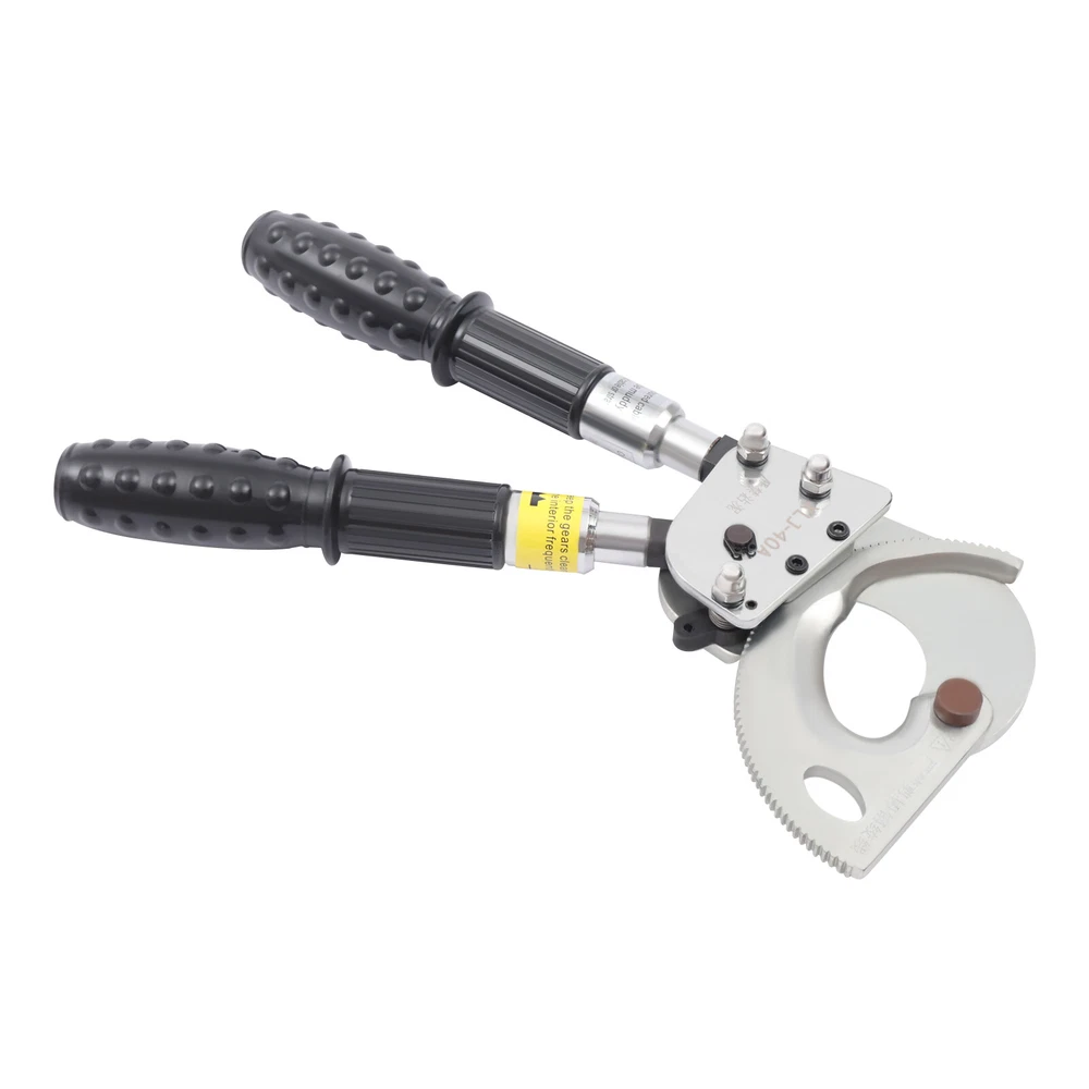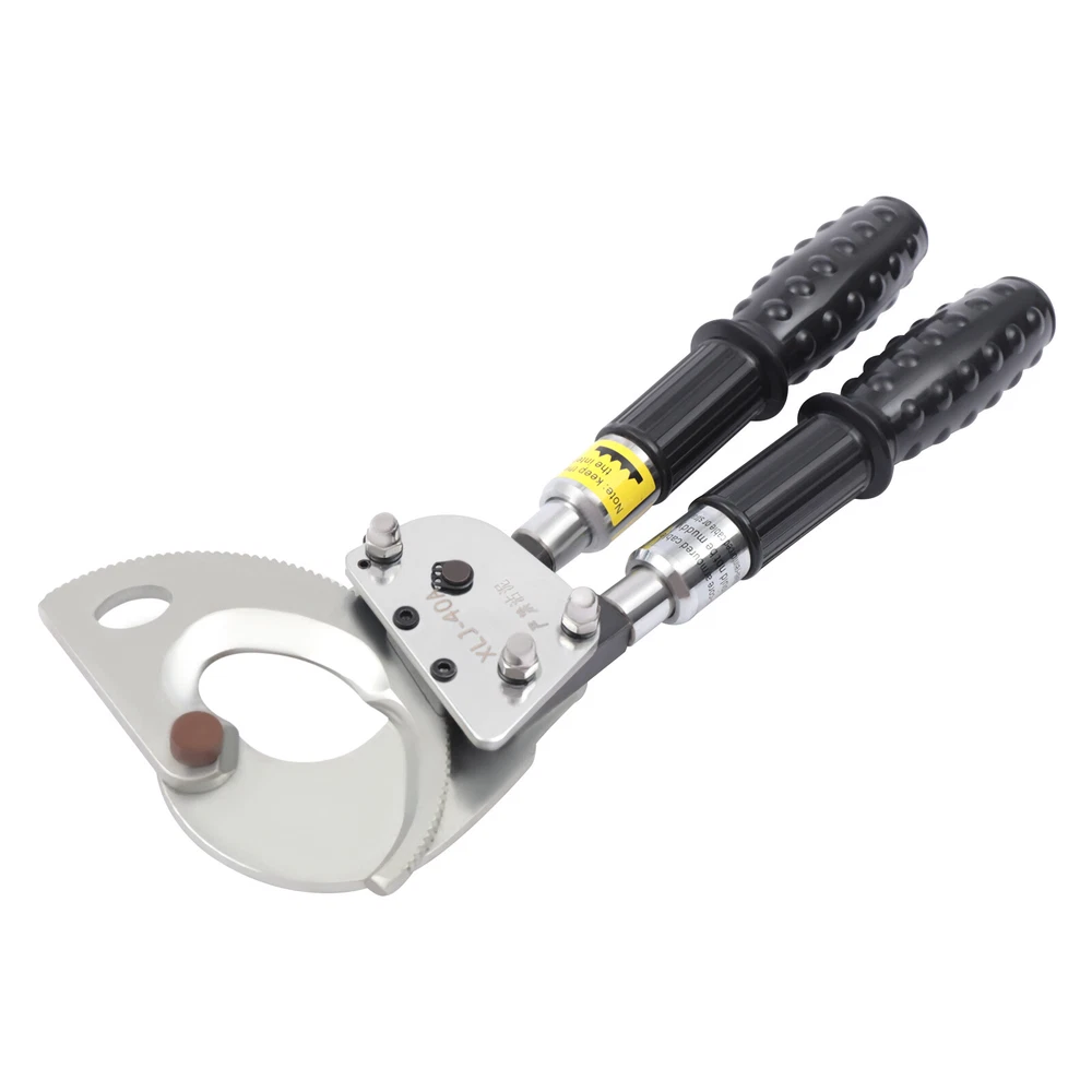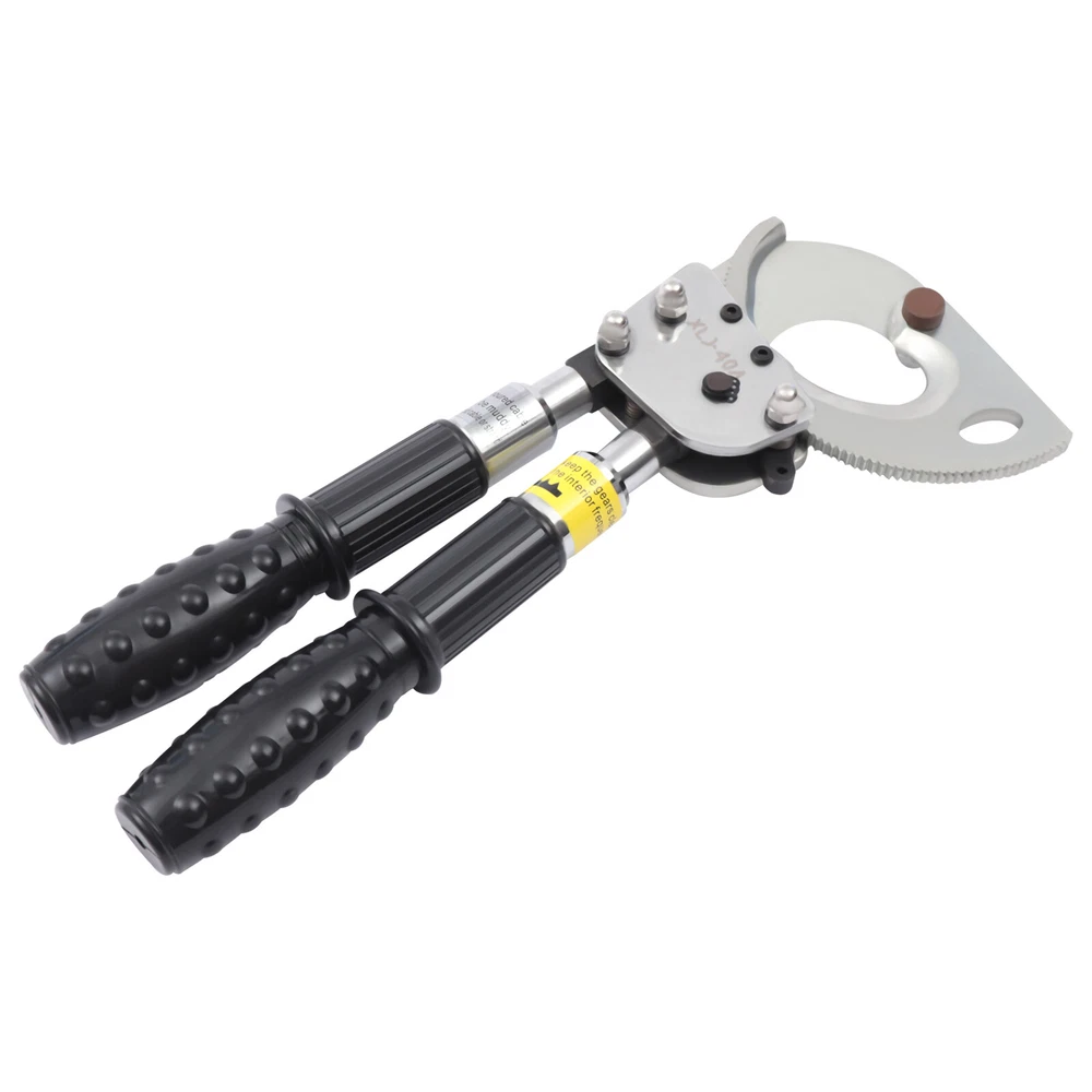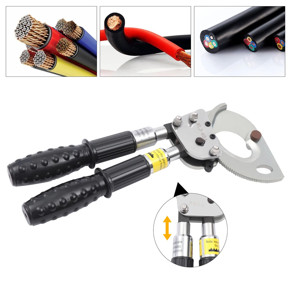 Description This is a ratchet cable cutter for cutting copper, aluminum, and armored cables. The high-strength ratchet construction facilitates the automatic locking of the cutting edge on the cable for precise and flat cutting. And the optimized lever handle makes cutting easier for the user. Specification Model: J40A Material: Spring Steel, Steel, Rubber Color: Black, Silver Process: Forging, Quenching Gear: Single Gear Cutting Range: Single-core, ≤300mm2. φ≤30mm/1.18in Handle Retractable Length: 15cm/5.9in Net Weight: 2.5kg/5.51lbs Package Size: 40*17*5cm/15.74*6.69*1.96in Product Size: 31-42*14.5*5.5cm/12.20-16.53*5.70*2.16in Ratchet Cable Cutter Ratcheting Wire Cutting Tool Heavy Duty Retractable Handle Beschreibung Ratchet Cable Cutter Ratcheting Wire Cutting Tool Heavy Duty Retractable Handle Description This is a ratchet cable cutter for cutting copper, aluminum, and armored cables. The high-strength ratchet construction facilitates the automatic locking of the cutting edge on the cable for precise and flat cutting. And the optimized lever handle makes cutting easier for the user. Application The ratchet cable cutter is capable of cutting single-core 300mm 2 or φ less than or equal to 1.18mm copper and aluminum armored cable. Key Features High-Quality Material : The ratchet cable cutter is forged from high-quality spring steel. The highly flexible, fatigue-resistant spring steel makes this ratchet cable cutter strong and durable. Sharp Edge : The ratchet cable cutter's edge is professionally hardened to provide a hardened hardness of 45 HRC. This sharp and hardened edge allows for efficient cutting with ease. Long Service Life : The edge of the blade is galvanized, which improves its corrosion and rust resistance so that the ratcheting cutter's service life is extended. High Safety : The rubber sleeve of the handle can effectively insulate and protect you when cutting cables. The soft and insulated handle makes it more comfortable and safe to use. And the non-slip design on the surface of the handle can effectively prevent slipping and increase safety. Complete Accessories : This ratchet cable cutter comes with an Allen key, triangular file, and geared brass wire brush. The Allen key is easy to adjust the tightness. The triangular file is used to polish gears and edges. The brush is used to clean the gears. Such a complete set of accessories makes the maintenance of the product more convenient. Telescopic Handles : The handles are designed to be retractable and can extend up to 5.9 inches. This allows users to be more flexible and labor-saving in their operations. Way of Use 1. Rotate the handle sheath to the inside. The handle is free to retract. Rotate the handle sheath to the outside, the handle length is locked. The handle extends to cut thicker cables easily. 2. The movable handle is unlocked when the handle is extended, which allows you to swing it up and down freely for easy use. 3. Turn the rotary cutter blade clockwise to clamp the cable and then trigger the movable handle until the cable is cut. 4. In the cutting process, if you want to return the knife, you can lock the movable handle and then tinker with the brace red block. At this point, the hand holding the movable handle can be released. Then rotate the blade counterclockwise. 5. After cutting, the movable handle will be close to the fixed handle until it is completely retracted and locked, so that the handle can be fixed. Details Pulling Fork : Pulling a fork can lock the internal structure to achieve a step blade activity so that cutting is more efficient and labor-saving. Nut : The flexible and robust nut holds the fixed and movable blades in place and allows the blades to be adjusted to suit different sizes of cable. Movable Blade : The flexible movable blade can be adjusted according to the size of the cable in time, making it more flexible. High Hardness Gear : The uniform hardness gear makes the ratcheting cutter stronger and more evenly stressed. High hardness gears make the cut flatter. Carrying Bag : We provide you with a carrying bag so that you can store your items or easily carry them outdoor or in other locations. Labor-saving and Efficient : The unique ratchet cable cutter's sharp edge and weight of only 2.20 pounds allow you to make fast cuts. And the handle uses a labor-saving lever principle, allowing you to easily complete the cut. Comfortable to Use : The handle is made of a high-quality steel tube, and its surface is covered with soft rubber to bring users a comfortable feeling of use. Even after long hours of use, this labor-saving and easy-to-operate ratchet cable cutter will not make you too tired. Easy to Carry : The ratchet cable cutter's weight of only 5.51 pounds and size of 12.20-16.53*5.70*2.16 inches makes it easy to carry. And equipped with storage bags for easy storage and carrying. Customer Service: We aim to provide quality products and services. If you have any problems, please feel free to contact us. We will reply and solve the problem for you as soon as possible. Specification Model: J40A Material: Spring Steel, Steel, Rubber Color: Black, Silver Process: Forging, Quenching Gear: Single Gear Cutting Range: Single-core, ≤300mm 2 . φ≤30mm/1.18in Handle Retractable Length: 15cm/5.9in Net Weight: 2.5kg/5.51lbs Package Size: 40*17*5cm/15.74*6.69*1.96in Product Size: 31-42*14.5*5.5cm/12.20-16.53*5.70*2.16in Package Included 1*Ratchet Cable Cutter 2*Allen Keys 2*Triangular Files 2*Geared Brass Wire Brushes 1*English Manual Notes The cable cutter for hammering or being hammered, so as not to deform the blade damage, the cable cutter is not allowed to connect the long handle at will to use. The different specifications of the cable cutter have a different range of use and do not exceed the scope of use. The active handle each time you toggle, use the rotating handle to advance a tooth, and make a 'blah blah blah' sound, such as no sound, indicating that the cable cutter int