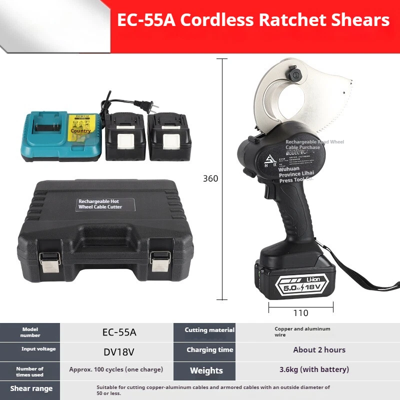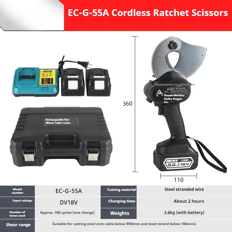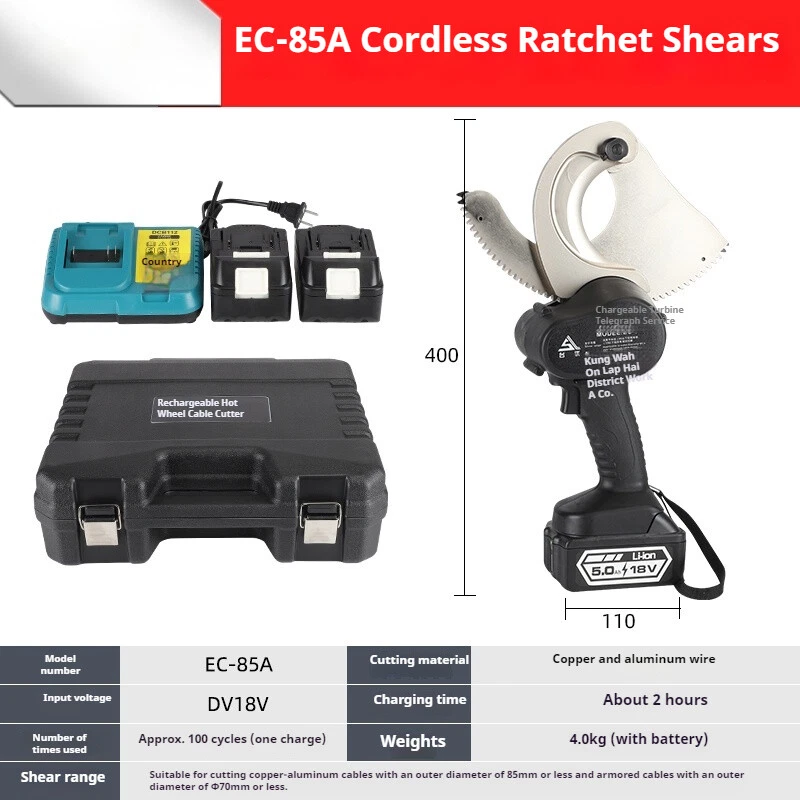 18V El ectric Ratcheting Cable Cutter Light Fast Cutting of 50Mm/85Mm Cable Gear Scissors Armored Cables Steel Core Aluminum Model EC-55A Cordless Ratchet Cutter Cut material copper aluminum wire Voltage DV18V Charging time is about 2 hours Approximately 100 times of use (1 charge) Weight 3.6kg (with battery) The cutting range is suitable for cutting copper and aluminum cables with an outer diameter of less than φ50 and armored cables. Model EC-G-55A Cordless Ratchet Cutter Cut material steel strand Voltage DV18V Charging time is about 2 hours Approximately 100 times of use (-- one charge) Weight 3.6kg (with battery) The cutting range is suitable for cutting steel core aluminum stranded wires below 1000mm, steel core cables below φ50mm and steel strands below 100mm. Model EC-75A Cordless Ratchet Cutter Cut material copper aluminum wire Voltage DV18V Charging time is about 2 hours Approximately 100 times of use (1 charge) Weight 3.6kg (with battery) The cutting range is suitable for cutting copper-aluminum cables and armored cables with an outer diameter of less than φ70mm. Model EC-85A Cordless Ratchet Cutter Cut material copper aluminum wire Voltage DV18V Charging time is about 2 hours Approximately 100 times of use (1 charge) Weight 4.0kg (with battery) The cutting range is suitable for cutting copper-aluminum cables with an outer diameter of φ85mm or less, and armored cables with an outer diameter of φ70mm or less.