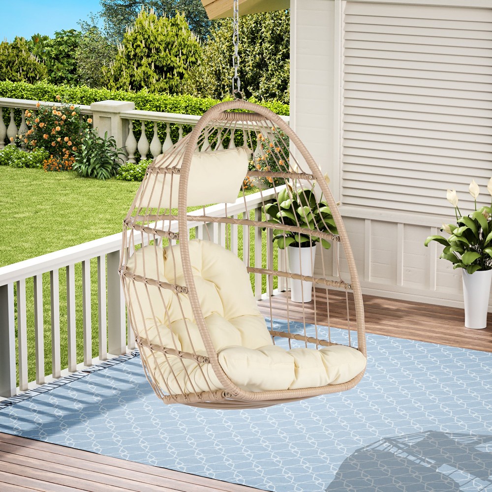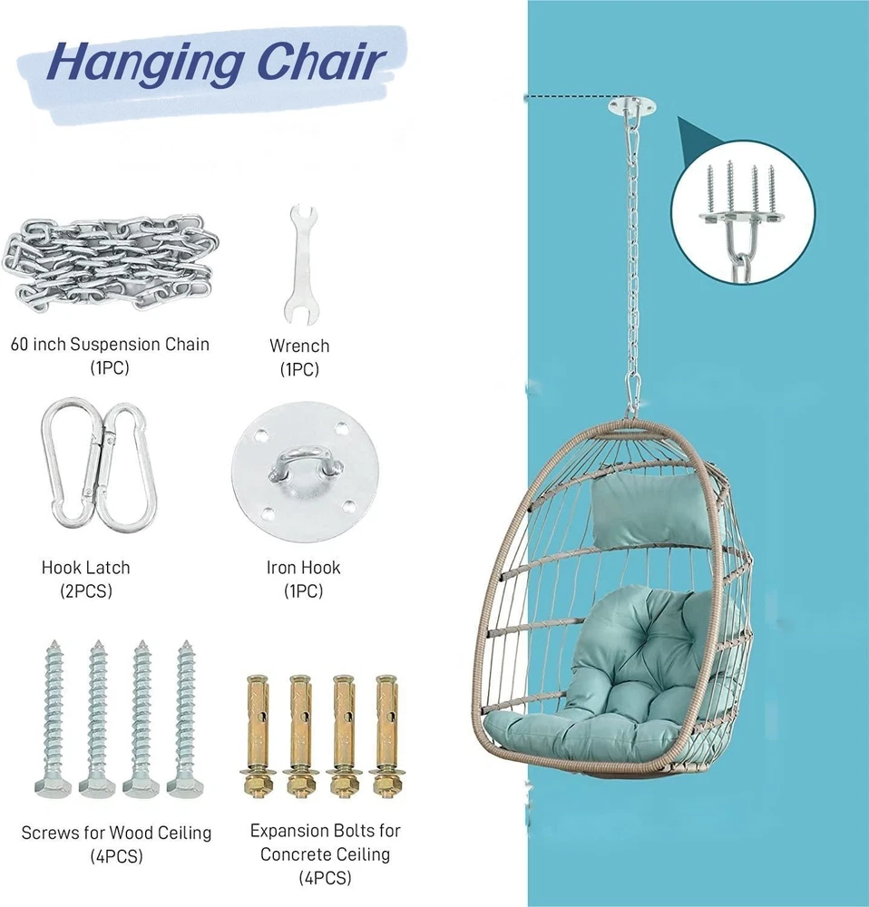 Specifications Place of Origin China Main Color khaki Main Material Rattan Filler Polypropylene Product Style American Design Use Case Garden & Outdoor Outdoor Seating Type Complete Patio Sets Set Design Sectional Cushions Included Yes Frame Durability UV Resistant Frame Cushion Durability Water Resistant Cushion Dangerous Goods #dangerFlag# Dimensions & Weights Assembled Length (in.) 28.70 Assembled Width (in.) 28.50 Assembled Height (in.) 55.60 Weight (lbs) 24.00 Product Features Main Material: Rattan 100% hand woven soft new design Description OUTDOOR PE RATTAN SWING CHAIR HANG CHAIR MODERN DESIGN Application:Outdoor, Hotel, Apartment, Mall, Leisure Facilities, Warehouse, Farmhouse, Courtyard, Wine Cellar, Hall, Home Bar, Basement Product size :28.7*28.5*55.6 IN Cushion colour: beiga Net weight:24lbs Gross weight:26lbs Package size:45.7*29.9*3.9 IN Load: 360lbs Material:Rattan / Wicker Packing:Carton Frame Galvanized steel Cushion Waterproof Fabric Rattan UV Resistent PE Rattan Fabric 180 g Polyester Fe