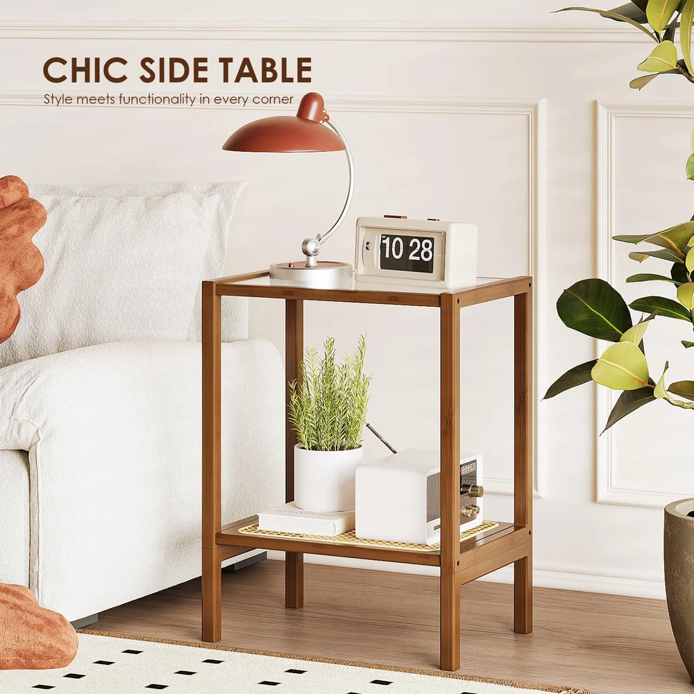 MODERN BEDSIDE TABLE: This bamboo table is designed 2-tier and features a corrugated glass tabletop 2 tier shelf for newspapers and magazines, but also combines modern and bohemian elements to make the room more stylish. Perfect as the side table, coffee table, accent table, and end table for small spaces, living room, bedroom, and office, etc. MATERIAL & SIZE: This narrow end table is made of 0.19-inch toughened glass and high-quality, eco-friendly bamboo. High-quality materials bring you a real safety and durable night table. This bedside table is 22-inch height, 17.7-inch length, and 12.2-inch wide. DURABLE AND STABLE: Our nightstand is made of multiple layers of bamboo panels pressed together which has excellent weight-carrying capacity and high strength to withstand long-term daily use. USER FRIENDLY: Easy to install and comes with installation tools. You can place your household items on the side table-top, and the magazines, books, etc. on the 2 tiers shelf. Let your bedside necessities be arranged uniquely. 180 Days Warranty: We offer a good warranty and 24 hours friendly customer service. If you have any questions about the product, please feel free to contact us, we have a professional team to help you solve all product problems.