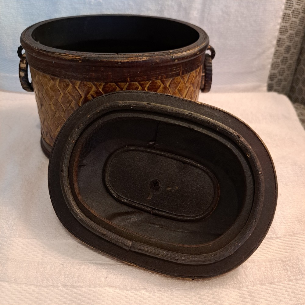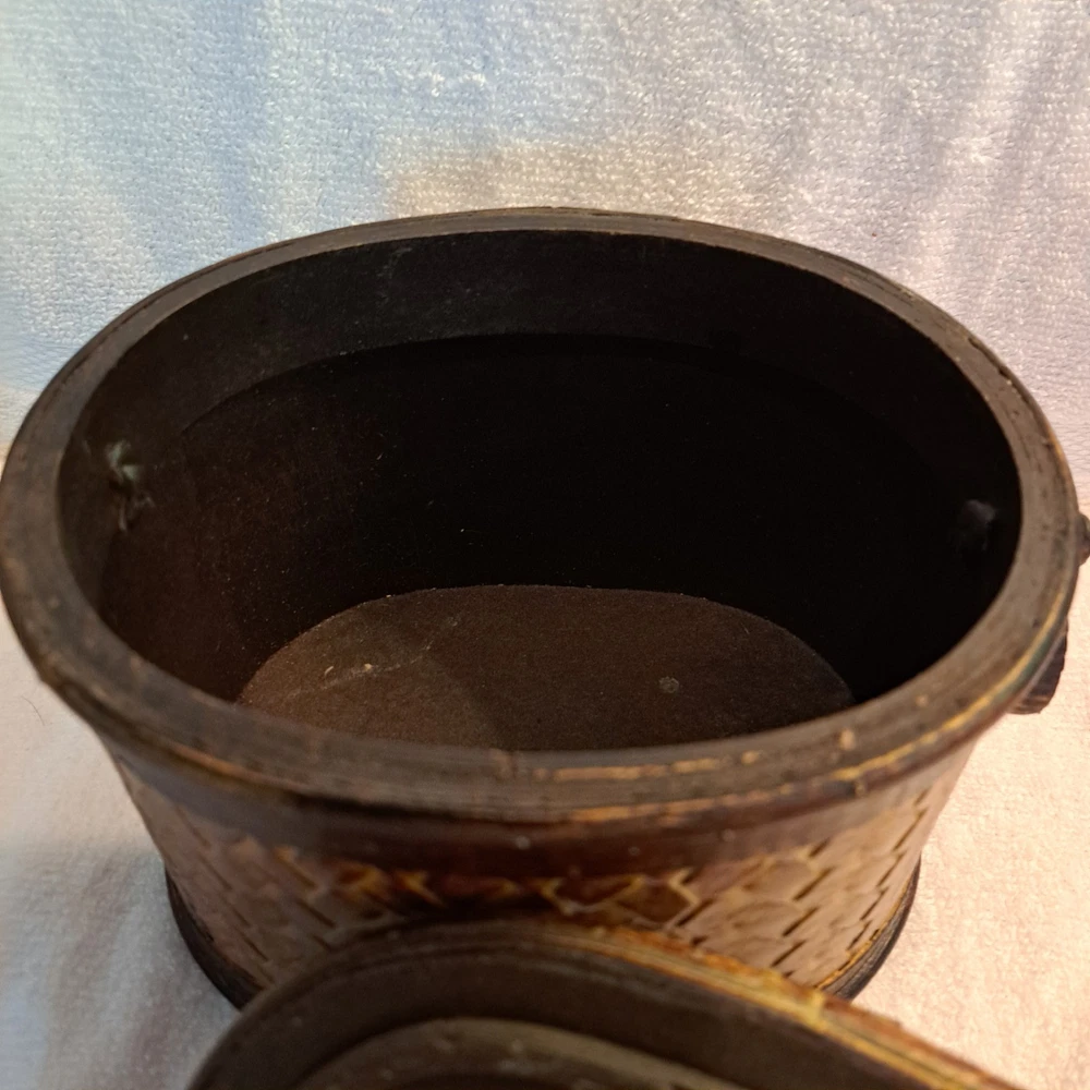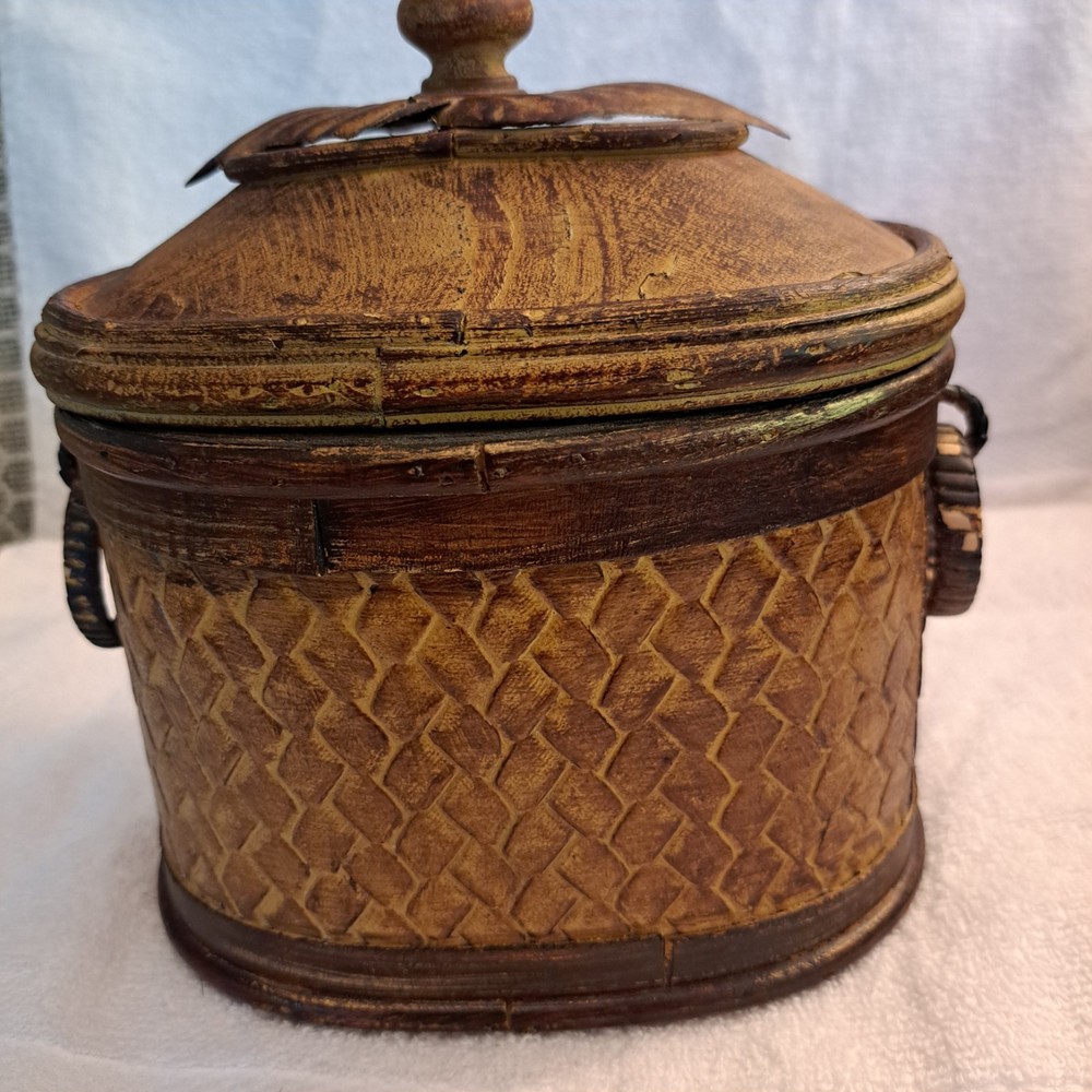 Welcome to my collection of pre loved home decor and accent treasures. Downsizing household and handmade crafted items. This box was used to store my bulk tea, always in a plastic container, but can be used for many storage ideas. Well made .This Rattan & Wood Storage Box features a charming woven design with a carved leaf lid, perfect for tea or other small items storage. The medium-sized box is suitable for various occasions and rooms in your home, with a bohemian style and textured finish. Made of wood and rattan, this storage box has a lid for secure closure and is easy to clean with a damp cloth. Its unique design and brown color make it a lovely addition to any room, adding a touch of natural elegance to your décor.