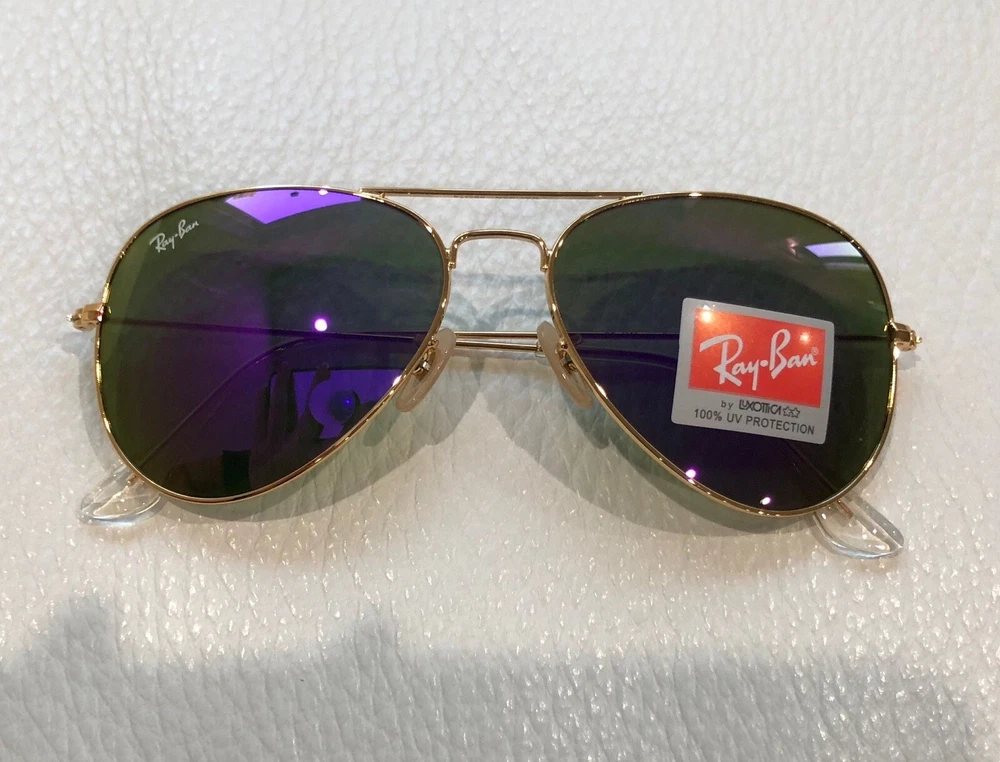 Features: Oversized, Reflective Lens Technology: Mirrored Frame Color: Gold Theme: 80s, 90s, American, Band, Beach, Biker, Classic, Designer, Motorcycle, USA MPN: RB3025 Frame Material: Metal Style: Aviator Type: Sunglasses Personalized: No Department: Women Brand: Ray-Ban Model: Ray-Ban RB3025 Lens Material: Mirror Pattern: Solid Lens Color: Purple UV Protection: UV400 Vintage: No Country/Region of Manufacture: Italy Temple Length: 135 mm