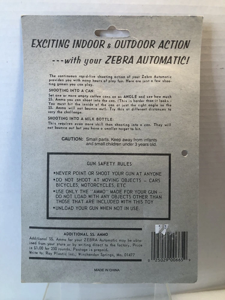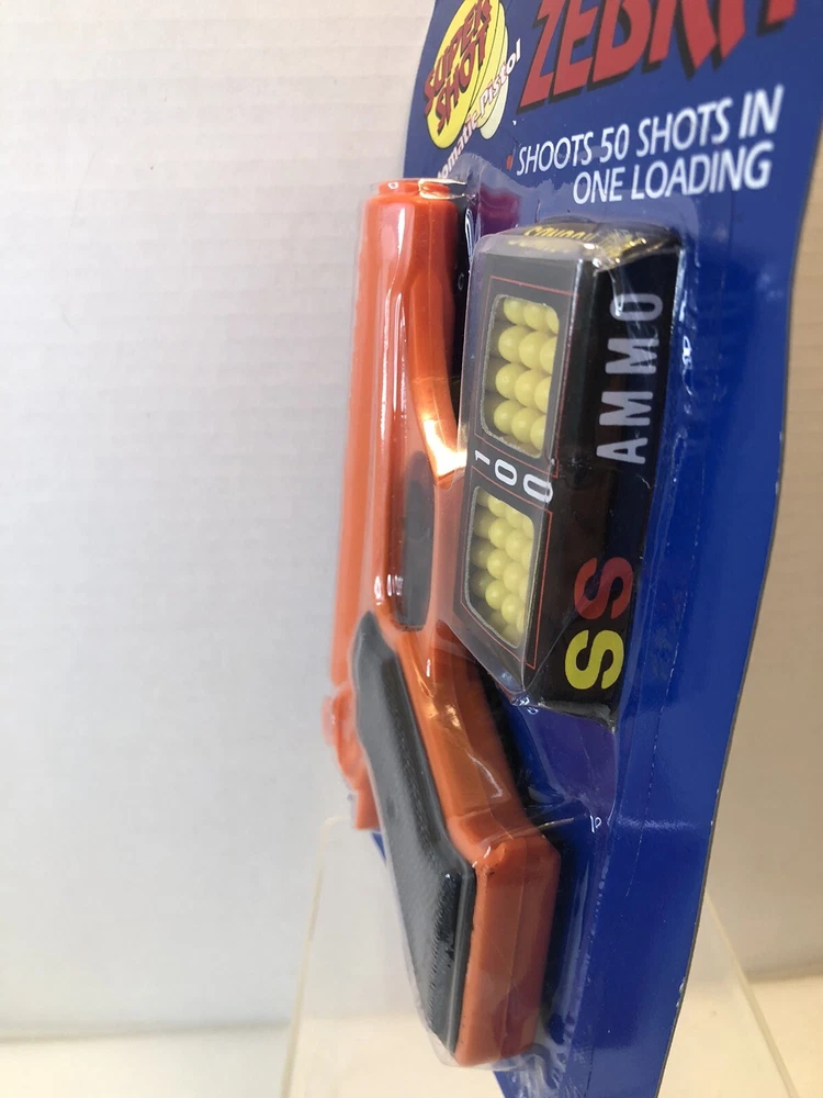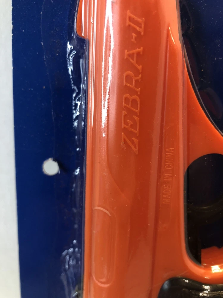 New Orange RayLine Zebra Super Shot Toy Pistol Gun Ammo New on Card Toy is new on card. Punch hole on left side. See photo. Wee bit of price sticker on back. See photo. Few light/small creases on top of card. Typical hanging wear. Inspect photos. Will be shipped boxed. No Returns. Comes from a smoke free home. What you see pictured is the item you’ll receive. Shipping is calculated based on your location by The USPS (Priority or Ground). Check out my other auctions! Thanks and Cheers.