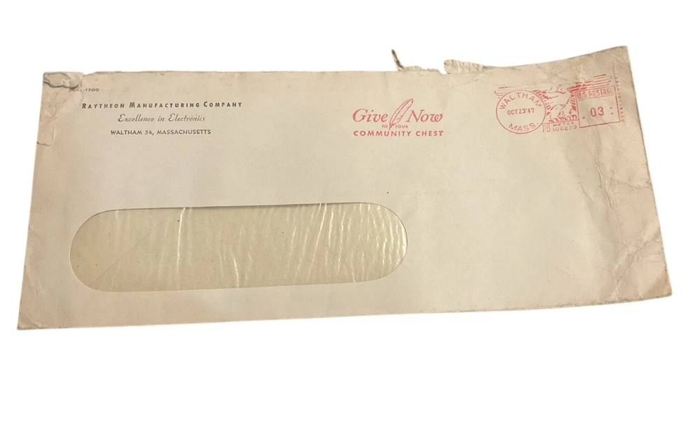 Letterhead envelope for Raytheon Manufacturing Company, Excellence in Electronics in Waltham, Massachusetts with Give Now To Your Community Chest mark. Envelope is slit open at top and has marks, creases and dings as seen in scan. Envelope is about 9.5 inches by 4 inches.