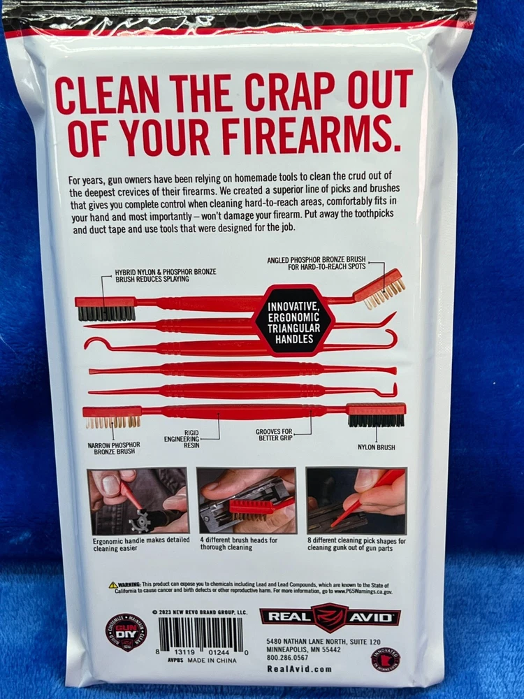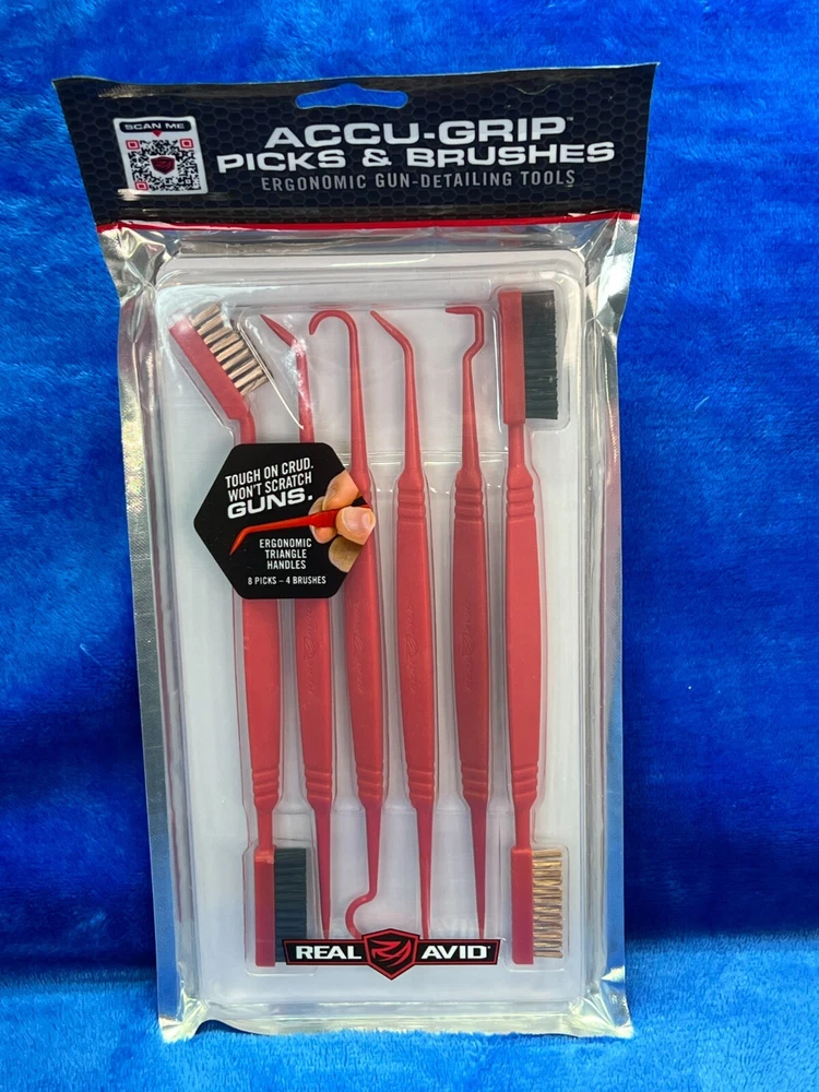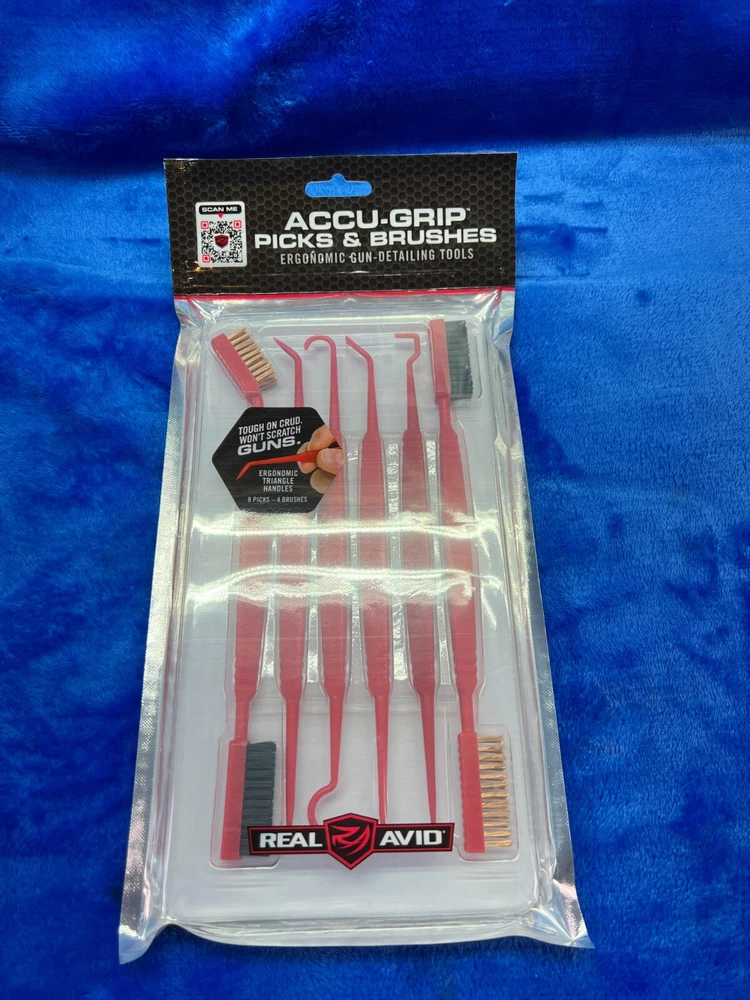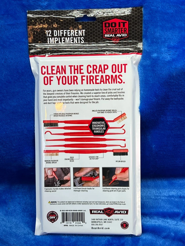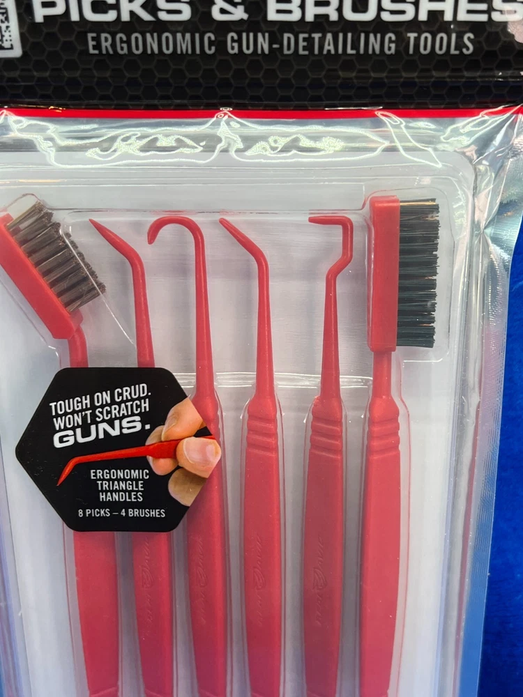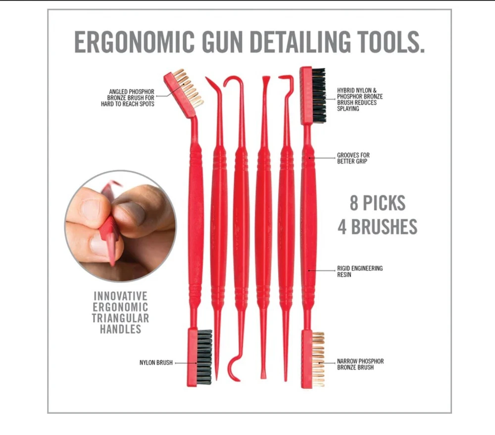 ESSENTIAL GUN CLEANING TOOLKIT – A comprehensive gun detailing brush set with precision-shaped cleaning tools; perfect for everything from scrubbing large firearm surfaces to detailing intricate gun components. VERSATILE GUN CLEANING ACCESSORIES – Includes four distinct gun brushes, eight uniquely shaped picks and hooks, and an angled phosphor bronze scrubbing brush for thorough maintenance. SAFE FOR FIREARM FINISHES – Effectively removes grime while being gentle on all firearm surfaces, including polymer, Cerakote coatings, and other finishes—ideal for cleaning your Glock, rifle, or shotgun. MULTI-PURPOSE DETAILING BRUSH SET – Each brush, pick, and hook is designed not only for firearms but also for car detailing, boat maintenance, golf gear, and outdoor equipment like hunting and camping tools. ERGONOMIC DESIGN – Triangular engineered resin handle with grooved grips for enhanced control and maneuverability, ensuring a secure and comfortable hold during use.