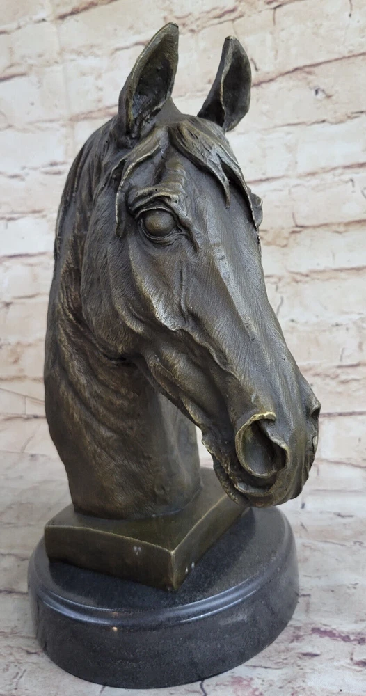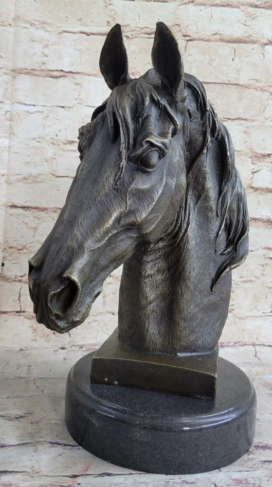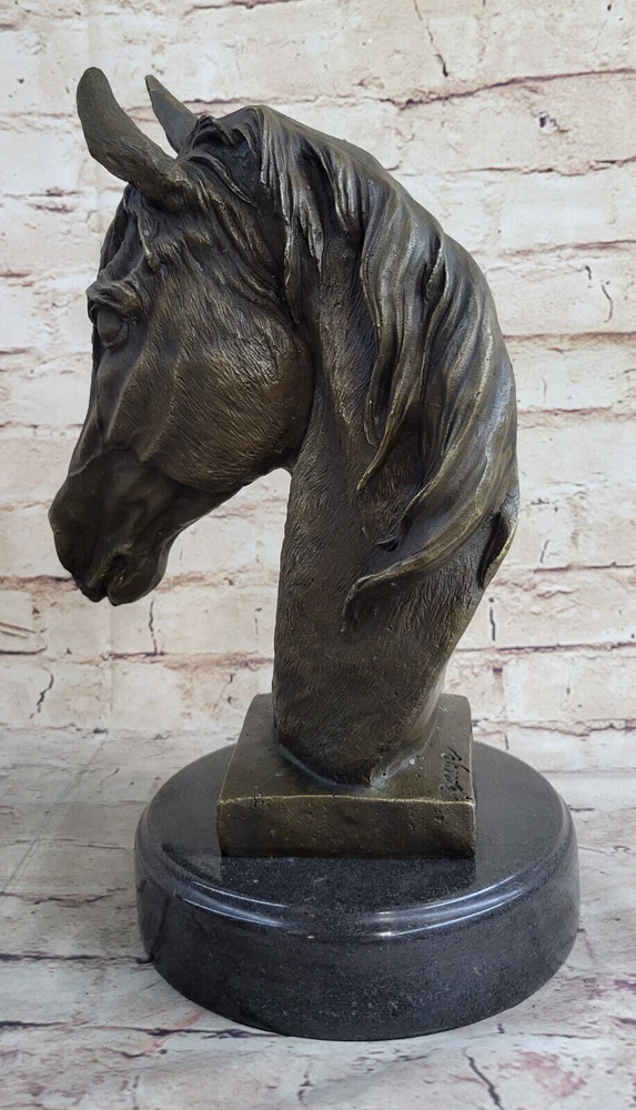 Condition : This sculpture is in perfect condition. Bronze Dimensions with Marble Base: Height 12" X Width 10" Marble Dimensions: Diameter 6.5" Height without base:11" Weight:13 LBS Inventory:32Y6705223 Dynamic Motion and Equine Spirit This striking bronze bust captures the raw energy and grace of a horse in motion, with its head bent downward and its mane flowing dramatically upward. The open mouth, as if mid-neigh, adds a dynamic element that brings the sculpture to life. Every aspect of the horse's pose reflects a moment of spirited movement, making it a powerful representation of the equine spirit. Exquisite Craftsmanship and Detail Crafted with extraordinary attention to detail, this sculpture is a testament to the artist's dedication and skill. Utilizing the traditional "Lost Wax Method," the piece is cast in 100% bronze, preserving every intricate feature of the original design. The rich brown patina and the smooth marble base enhance its elegance, while the flowing lines and textured surfaces demonstrate the artist's mastery in capturing the essence of the horse. A Timeless Tribute to Equestrian Art This bronze horse bust is more than just a decorative piece; it is a work of art that embodies the timeless beauty and majesty of equestrian subjects. The signature of the artist, Barye, adds to its authenticity and collectible value, making it a centerpiece for any art collection or a striking focal point in a room. Whether displayed on a mantelpiece, shelf, or table, this sculpture commands attention and admiration, celebrating the enduring bond between humans and horses. Signed Barye Unique Bronze Bust Horse Head Sculpture Marble Base Statue Figure YRD-670 Video will open in a new window Using the eBay App? Paste link into a browser window: [isdntekvideo]