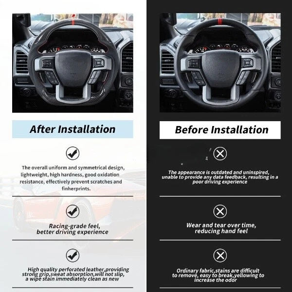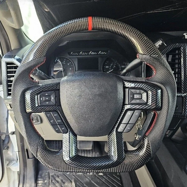 Specification: Condition: 100% Brand New Item Type: Carbon Fiber Steering Wheel Material: Real Carbon Fiber + Pref orated Leather Color: As Picture Shown Stitching: Red 12 O'Clock Stripe: Red Shape: Flat bottom D-type Racing Design Finger Grips: Yes Thumb Grips: No Paddle Cutouts: (When you place the order plz let me know if your steering wheel have paddles or not) Heated: Yes Vibration: No (If you want to keep this function, please contact us) Warranty: 1 Year Fitment: 2015-2020 Ford F150 Raptor (If you are not sure whether your model matches, please provide your steering wheel photo for us to confirm.) Package List: 1 x Carbon Fiber Steering Wheel 1 x Installation Instruction Note: This steering whe el purchses will not include trims, buttons, paddle shifter and wire harness on the steering wheel. Shipping: This is BUILD TO ORDER item that required 1 5 days , b ut we try our best to ship out your order after your payment ASAP. Return Policy: ①Remember to check your package prior to signing for delivery! If the box looks damaged, refuse the package and contact us immediately. ②If you receive a defective or damaged item,or an incorrect item please contact us immediately with the picture,We need pictures of the damaged item and of the box it came in before sending out your replacement or refund. ③In the case of the above, all our products come with a 30-Day Free Return Policy ④Refunds will not be issued due to poor installation or the customer's inability to install the part themselves. ⑤Since our items are heavy items, we do not provide return labels. If you need to return, please arrange the return by yourself, and we will arrange the return of the shipping fee after receiving the item. On Oct 11, 2024 at 14:07:23 PDT, seller added the following information:
