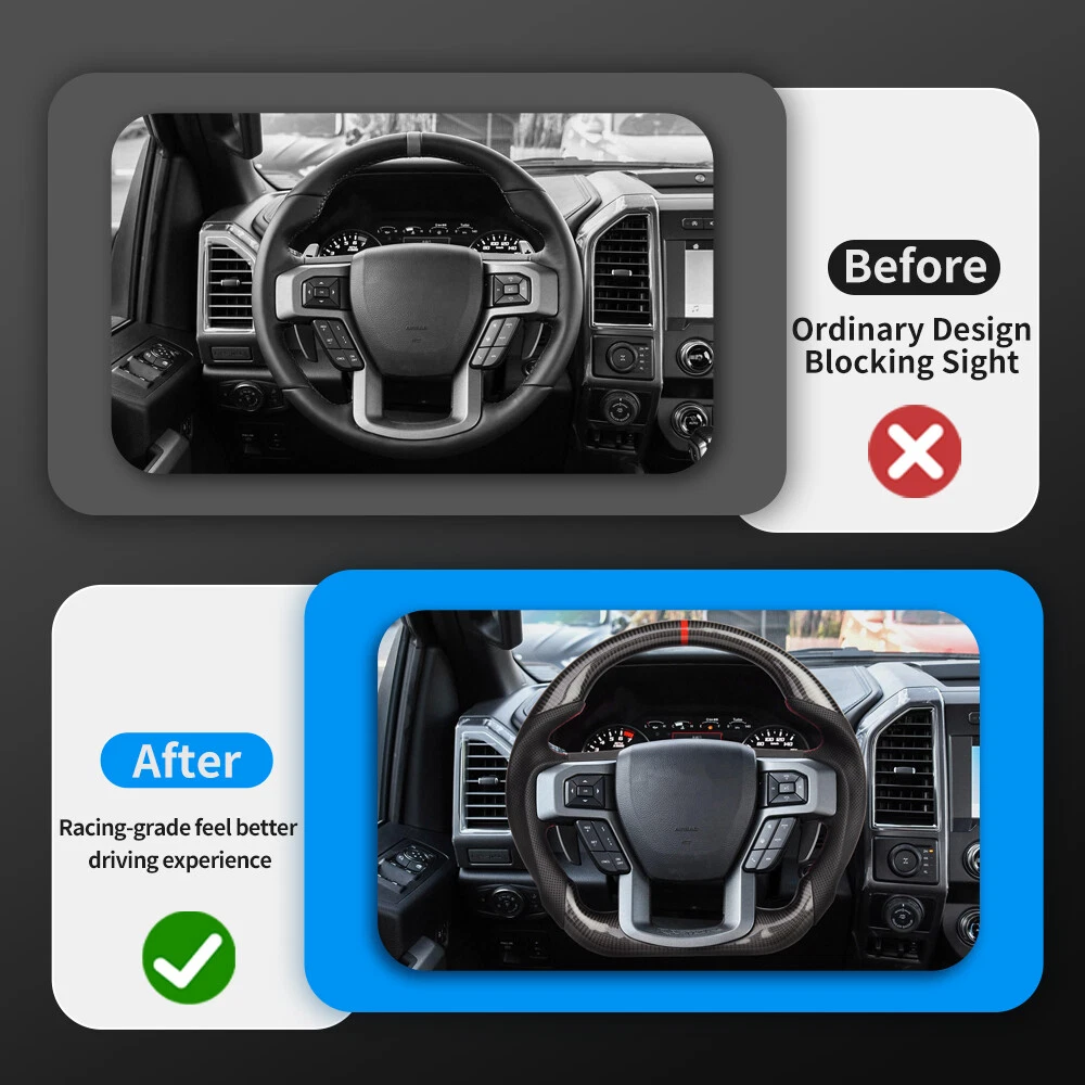 Specification: Condition: 100% Brand New Item Type: Carbon Fiber Steering Wheel Material: Real Carbon Fiber + Pref orated Leather Color: As Picture Shown Stitching: Red 12 O'Clock Stripe: Red Shape: Flat bottom D-type Racing Design Finger Grips: Yes Thumb Grips: No Paddle Cutouts: NO Heated: No Vibration: No (If you want to keep this function, please contact us) Warranty: 1 Year Fitment: Ford F150 Raptor 2015-2020 (If you are not sure whether your model matches, please provide your steering wheel photo for us to confirm.) Package List: 1 x Carbon Fiber Steering Wheel Note: This steering whe el purchses will not include trims, buttons, paddle shifter and wire harness on the steering wheel. Shipping: This is BUILD TO ORDER item that required 1 5 days , b ut we try our best to ship out your order after your payment ASAP. If your address is a remote address, please inform us in advance, remote areas are subject to an additional charge of US $60 . Return Policy: ①Remember to check your package prior to signing for delivery! If the box looks damaged, refuse the package and contact us immediately. ②If you receive a defective or damaged item,or an incorrect item please contact us immediately with the picture,We need pictures of the damaged item and of the box it came in before sending out your replacement or refund. ③In the case of the above, all our products come with a 30-Day Free Return Policy ④Refunds will not be issued due to poor installation or the customer's inability to install the part themselves. ⑤Since our items are heavy items, we do not provide return labels. If you need to return, please arrange the return by yourself, and we will arrange the return of the shipping fee after receiving the item.