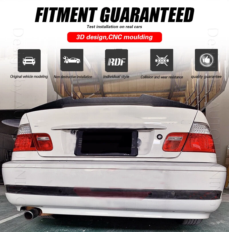 Features: 1.Fitment: For BMW 3 Series E46 316i 318i 320i 323i 325i 328i 330i M3 Sedan 4-door 1998-2005 2.3*3 Twill Weave Carbon Fiber material, with polished and shinning surface, ten times tough than steel 3.High Quality UV-Protected Clear Coating, Surface is smooth and shiny,enhance the appearance of the vehicle 4.3D design,CNC moulding,test installation on real cars, good fitment guaranteed 5.Car rear trunk spoiler are designed to factory specifications for easy installation and clean,installed with self-adhesive tape.peel off the tape on the back, then stick the spoiler on the lid of the trunk. It is easy to clean in daily use. 6.Impresses with its fitting accuracy and emphasizes the sporty lines of your car,stylish design gives a customized look 7.Add downforce, detach airflow, enhanc Carbon Fiber Spoiler FOR BMW The Rear Trunk Spoiler is one of the simplest mods you can do to the exterior of your car that will give your car that completely different look. Not only are spoilers meant for great looks, they also help with the aero dynamics of the car by lowering drag, or helping to put more downforce on the car making sure that the wheels stay grounded for maximum traction. Fitment: Fits for BMW 3 Series E46 316i 318i 320i 323i 325i 328i 330i M3 Sedan 4-door 1998-2005 Specifications: Product Name: Rear Spoiler Material: Carbon Fiber Size: Length 116cm Package Size: 123*31*11cm Package Weight:1.56kg Features: Made of High Quality Lightweight Carbon Fiber. Latest Design GT Wing Spoiler Completed Kit, Improve Handling And Make Tail More Stable in High Speed. Water Transfer Carbon Fiber for Highest Durability and Appearances. Adjustable Angles for Customizable Usages and Efficiencies, Enhances Aerodynamic. Reduces Drag, Increases Fuel Efficiency, Reinforces Downforce, Traction and Stability. Double-sided adhesive paste, Easy to Install. Package included: 1 x Spoiler with self-adhesive glue tape Delivery details Payment and TAX Return Policy Warranty Contact us Delivery details NOTE: The shipping fee is only for the mainland of each country, it does not include the overseas territories, such as Virgin Islands (U.S.) , Puerto Rico, Hawaii , French Reunion Island, etc. But on ebay, when buyers from Puerto Rico and overseas territories , the shipping fee is equal to United States, it is NOT correct,. please contact us for correct shipping fee, or we will cancel the order. Sorry for the inconvenience, and thanks for your cooperation. 2. If you want to upgrade the shipping, please contact us before making payment, we will revise the shipping fee. 3. We will ship according to your Ebay address. Please make sure it is correct and include phone number for delivery. If you want to know the exact shipping time , please contact us . Payment and TAX 1.We accept Multiple Payment Methods Available: Credit Card, Debit Card, Gift Card, Apple Pay, Goggle Pay, PayPal and PayPal Cred. 2.Please leave note for your special request (e.g. Colors or Size) in ebay note when you pay the order. 3.Your must complete the payment within 7 days or Ebay will automatically open unpaid item case For US Buyer:The invoice value of each item is less than 800USD ,so you no need to pay any tariff . NON-US Buyer Note: Most countries are tax free based on our invoices, if tax is required, which will be buyer's responsibility. Return Policy 1.Customer satisfaction is our top goal. We believe our items are so outstanding. All products are quality checked. They are new and in good condition when shipped to our customers. We are convinced you will be happy with your Purchase. 2.If product is defective or damage upon arrival, or wrong product shipped, please contact us immediately. Returns accepted within 30 days of delivery date and item must be in original new condition, not worn or altered in any way with attached tags & wrap. Otherwise deal is final. Return shipping must be paid by buyer. Please always contact us to resolve any problems, we will do our best to satisfy you. Thanks very much. Warranty 30 Days Money Back It is our goal to provide 100% satisfaction and peace of mind to our customers. If you are not satisfied with the products for any reason within 30 days of receiving the item. (Items must be not opened in their original package. Any mark of installation, mounting, cutting, scratch or using will not be allowed.) Please be free to contact us first if you have any problems.thanks. Contact us 1.We are trying our best to explain all details of the products here! If you have any question, please feel free to contact us by Ebay message, and We will get back to you within 24-48 hours. 2.Customer satisfaction is our NO.1 priority. If you are not happy with the item that you purchase, please contact us first. We will try our best to solve the problem with you.Please leave us a positive feedback if you receive the item.Please do not leave negative or neutral feedback without any contact.If you haven't received item in 30 days, please contact us and we will arrange refund.We appreciate your business.Happy Bidding & Have a nice day! 3.Working hours: From 8 a.m. to 6 p.m. from Monday to Friday. From 8 a.m. to 12 a.m. on Saturday morning Holiday/Rest time: Saturday afternoon and Sunday